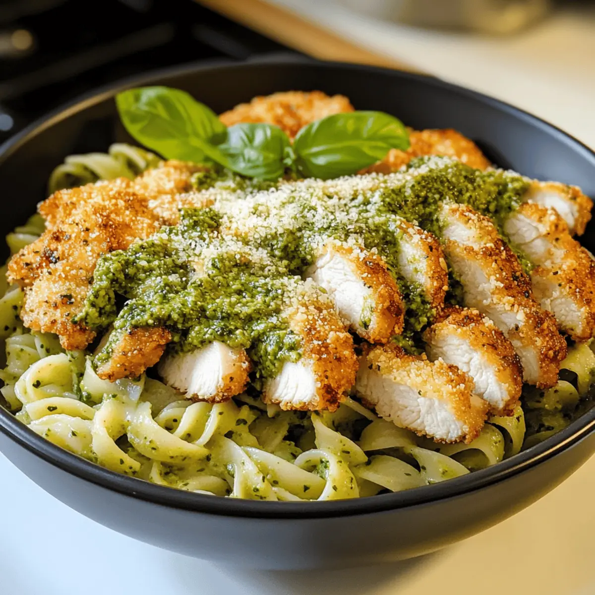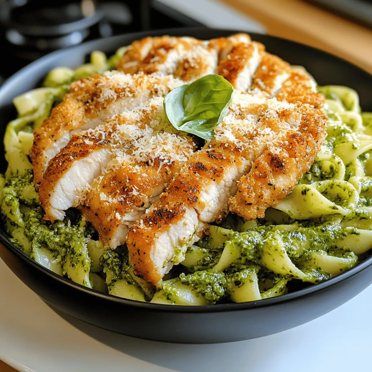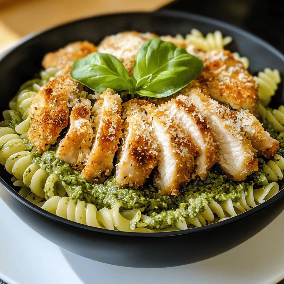 Jump to Recipe Print RecipeAs I stood in the kitchen, the inviting aroma of fresh basil wafted through the air, making my heart race with anticipation. I was about to create something truly special: Pesto Pasta with Crispy Parmesan Chicken. This dish not only brings a pop of color to your table but offers a heartwarming comfort that can turn any meal into a celebration. With quick preparation and customizable options—whether you want to swap in shrimp, chicken thighs, or even a plant-based protein—this recipe caters to everyone. Imagine gathering your loved ones, serving this crowd-pleaser, and watching their faces light up with joy. Are you ready to unleash your inner chef and dive into this delightful dish? Why is this dish a must-try? Customizable Comfort: This Pesto Pasta with Crispy Parmesan Chicken lets you swap out proteins, making it adaptable for everyone at the table. Quick and Easy: Perfect for busy weeknights, this recipe is ready in no time, letting you focus on those special family moments. Flavor-Packed: Fresh, aromatic pesto combined with crispy chicken delivers an explosion of taste that satisfies every craving. Impressive Presentation: The vibrant colors and textures make this dish a showstopper, perfect for entertaining family or friends. Feel free to get creative with add-ins like spinach or cherry tomatoes, complementing your meal with a fresh side salad or Garlic Parmesan Pasta for extra indulgence! Pesto Pasta with Crispy Parmesan Chicken Ingredients For the Pasta • Pasta – Use any shape you love, be it spaghetti or fettuccine, as the base for this comforting dish. For the Pesto • Fresh Pesto – This adds a burst of vibrant flavor and creaminess; adjust garlic levels for your taste. For the Chicken • Chicken Breasts – These give heartiness to the dish; don’t hesitate to swap in chicken thighs or shrimp for variety. • Parmesan Cheese – Grate your own for the crispiest chicken coating with that irresistible crunch. • Olive Oil – Essential for frying the chicken; feel free to substitute with avocado oil for a different flavor. Seasoning • Salt & Pepper – These basic yet essential seasonings will enhance all of your wonderful flavors. Adaptable and delicious, you’ll find that this Pesto Pasta with Crispy Parmesan Chicken is just what you need for a delightful family dinner! Step‑by‑Step Instructions for Pesto Pasta with Crispy Parmesan Chicken Step 1: Cook the Pasta Bring a large pot of salted water to a rolling boil. Add your chosen pasta and cook according to the package instructions until al dente, usually around 8-10 minutes. Once done, drain the pasta in a colander and set it aside, allowing the steam to escape. This will ensure the pasta is perfectly cooked for your Pesto Pasta with Crispy Parmesan Chicken. Step 2: Prepare the Pesto In a food processor, combine fresh basil, garlic cloves, toasted pine nuts or walnuts, grated Parmesan cheese, and olive oil. Pulse until the mixture is finely blended and smooth, adjusting with additional olive oil if needed for creaminess. Taste and season with salt and pepper to enhance the flavors of your vibrant pesto, ready to coat the pasta beautifully. Step 3: Prepare the Chicken Take your chicken breasts and pat them dry with paper towels for an extra crispy result. In a shallow dish, beat a couple of eggs and mix in grated Parmesan cheese. Season the mixture with salt and pepper, then coat each chicken breast in the egg mixture, ensuring an even layer. This will help create that delicious crispy coating for your chicken. Step 4: Cook the Chicken Heat a generous amount of olive oil in a large skillet over medium-high heat until shimmering. Carefully place the coated chicken breasts in the hot oil, cooking for about 5-7 minutes per side, or until they turn a deep golden brown and reach an internal temperature of 165°F. Once cooked, remove the chicken from the skillet and let it rest on a plate lined with paper towels to retain the crunch. Step 5: Combine and Serve In a large mixing bowl, add the drained pasta and pour in your freshly made pesto. Toss gently until the pasta is evenly coated in that vibrant, green goodness. Slice the crispy chicken into strips and arrange them beautifully on top of the pesto pasta. Serve immediately for a delicious family meal that showcases Pesto Pasta with Crispy Parmesan Chicken at its finest! Pesto Pasta with Crispy Parmesan Chicken Variations Feel free to unleash your creativity with these delightful twists on the classic Pesto Pasta with Crispy Parmesan Chicken, where each option adds a unique touch to your dish! Shrimp Swap: Use succulent shrimp instead of chicken for a seafood twist. Just sauté the shrimp for a few minutes until they turn pink and tender, adding a delightful oceanic flavor. Veggie-Packed: Toss in fresh spinach, zucchini ribbons, or cherry tomatoes to elevate your pasta with colorful, nutritious veggies. This not only adds texture but also boosts the freshness of your meal. Gluten-Free: Replace traditional pasta with your favorite gluten-free option, allowing everyone to enjoy this comforting dish without any dietary concerns. Nutty Variance: Try using different nuts in your pesto, like walnuts or cashews, to create a unique flavor profile that surprises and delights your taste buds. Spicy Kick: Add a pinch of red pepper flakes to the pesto or serve with a drizzle of sriracha for those who crave a bit of heat. This adds a zesty element that will awaken your palate. Dairy-Free: Substitute Parmesan with nutritional yeast for a dairy-free alternative that brings umami flavor without compromising on taste. It’s a perfect swap for vegan eaters. Zoodles: Switch out pasta for zucchini noodles to make the dish lighter and lower in carbs, while still keeping that delicious pesto flavor front and center. Chickpea Power: Incorporate roasted chickpeas, adding an extra protein boost and crunchy texture alongside the crispy chicken. They complemen