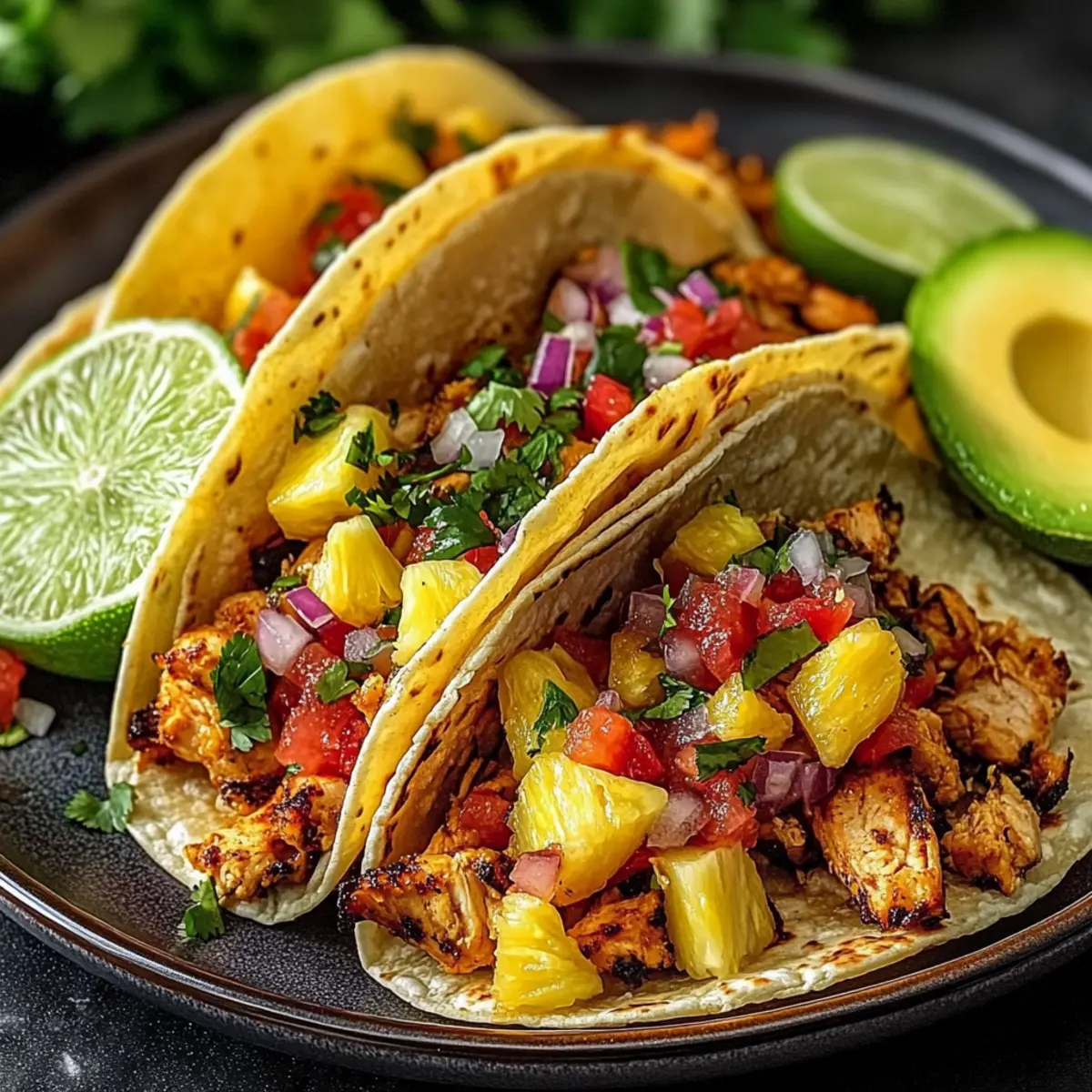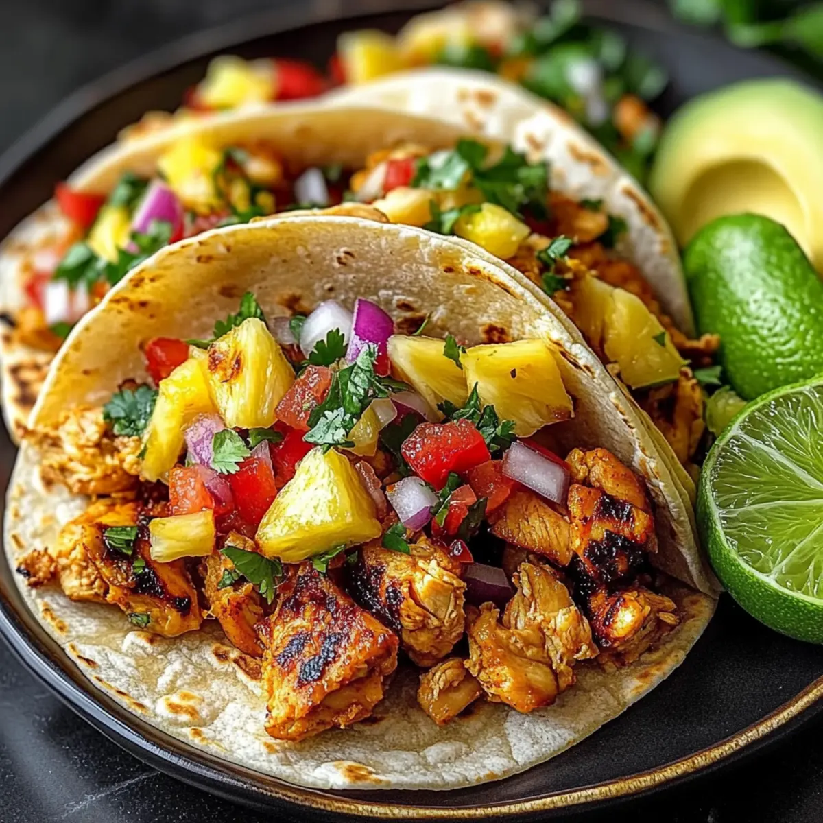 Jump to Recipe Print RecipeThe sizzling sound of chicken hitting a hot skillet is music to my ears, especially when it’s the prelude to a tropical feast. These Pineapple Chicken Tacos are more than a meal; they’re a vibrant escape that whisks you away to sun-kissed sandy shores with each bite. This easy recipe is perfect for busy weeknights or laid-back weekends, combining juicy marinated chicken and succulent pineapple in warm tortillas. Not only are they incredibly quick to prepare, but they also invite a variety of toppings, allowing you to customize each taco just the way you like it. With flavors that dance between sweet and savory, you’re bound to make these tacos a regular on your dinner table. Curious about how to bring this tropical delight to life? Let’s dive into the recipe! Why are Pineapple Chicken Tacos a must-try? Flavorful Fusion: Combining juicy chicken with sweet pineapple creates a delightful balance that tantalizes your taste buds. Quick and Easy: Perfect for busy nights, this dish takes minimal prep time, making it convenient without sacrificing flavor. Versatile Toppings: Customize your tacos with a variety of toppings like avocado or sriracha mayo for added flair. Great for Gatherings: Serve these at parties and watch guests rave about the tropical twist on a classic favorite. Healthy and Wholesome: Loaded with lean protein and fresh veggies, these tacos offer a great way to incorporate nutrients into your meals. Try pairing them with a refreshing side salad or tortilla chips for a complete feast! Pineapple Chicken Taco Ingredients For the Chicken Marinade • Boneless, Skinless Chicken Breasts – This is the main protein; you can use rotisserie chicken for a quicker option. • Soy Sauce – Adds a savory umami flavor and helps to tenderize the chicken. • Honey – Sweetens the marinade and aids in caramelizing the chicken during cooking. • Rice Vinegar – Provides a tangy acidity that balances the sweetness of the pineapple. • Sesame Oil – Adds a lovely nutty aroma; olive oil can be used as a substitute. • Fresh Ginger – Contributes a spicy-sweet note; feel free to use powdered ginger if you’re in a pinch. • Garlic – Enhances depth and aroma; minced garlic is best for even flavor distribution. • Red Pepper Flakes – An optional kick of heat; adjust or omit to suit your spice level. For the Taco Filling • Fresh Pineapple – The star of these tacos, adding juicy tropical sweetness. • Red Bell Pepper – Provides a delightful sweetness and a satisfying crunch; you can swap it for other sweet peppers. • Red Onion – Adds a sharp flavor and vibrant color; substitute with white onion for a milder taste. • Cilantro – Brightens up the dish; you may replace it with parsley for a different herbal touch. • Jalapeño – Optional heat element; consider omitting based on your spice preference. • Lime Juice – Lifts the flavors of the dish with its bright acidity. • Salt – Essential for enhancing the overall flavor of the taco filling. For the Tacos • Corn or Flour Tortillas – Perfect for wrapping your fillings; try gluten-free tortillas for a different option. • Olive Oil – Used for cooking the chicken; vegetable oil is a good substitute if needed. • Shredded Cabbage/Slaw Mix – Adds crunch and freshness to each bite. Optional Toppings • Avocado Slices – Creamy addition that pairs beautifully with the tropical flavors. • Sriracha Mayo – Adds a spicy kick; drizzle it on for extra flavor. • Lime Wedges – Serve alongside for a fresh squeeze of juice to brighten the tacos. These Pineapple Chicken Tacos are not just a meal; they’re a tropical fiesta waiting to happen! Step‑by‑Step Instructions for Pineapple Chicken Tacos Step 1: Marinate the Chicken In a mixing bowl, whisk together soy sauce, honey, rice vinegar, sesame oil, ginger, minced garlic, and optional red pepper flakes to create a flavorful marinade. Cut the boneless, skinless chicken breasts into bite-sized cubes and add them to the marinade, ensuring all pieces are well coated. Cover and refrigerate for 30 minutes to 4 hours for maximum flavor infusion. Step 2: Prepare Pineapple Salsa While the chicken marinates, prepare your fresh pineapple salsa. In a large bowl, combine diced fresh pineapple, chopped red bell pepper, red onion, cilantro, jalapeño (if using), lime juice, and a sprinkle of salt. Mix well to combine all the ingredients, allowing the vibrant flavors to meld. Cover the bowl and place it in the refrigerator until ready to use. Step 3: Cook the Chicken Heat a tablespoon of olive oil in a large skillet over medium-high heat until shimmering. Add the marinated chicken to the hot skillet in a single layer, cooking for about 5-7 minutes. Stir occasionally until the chicken is browned and cooked through, reaching an internal temperature of 165°F. Remove the skillet from the heat and let the chicken rest briefly. Step 4: Warm the Tortillas To enhance your Pineapple Chicken Tacos, warm the tortillas. You can do this by placing them in a dry skillet over medium heat for about 30 seconds on each side or zapping them in the microwave for about 15-20 seconds. Keep the warmed tortillas covered with a clean kitchen towel to retain their warmth and flexibility. Step 5: Assemble Tacos On each warmed tortilla, layer a generous amount of shredded cabbage or slaw mix to add crunch. Spoon the cooked chicken on top of the cabbage, followed by a hefty spoonful of your prepared pineapple salsa. Add any optional toppings like avocado slices, sriracha mayo, or lime wedges to personalize each taco. Serve your delicious Pineapple Chicken Tacos immediately for a tropical taste sensation! Pineapple Chicken Tacos Variations & Substitutions Feel free to explore delightful twists on your Pineapple Chicken Tacos that can elevate your dining experience! Shrimp or Tofu: Swap the chicken for seasoned shrimp or marinated tofu for different protein options. Both