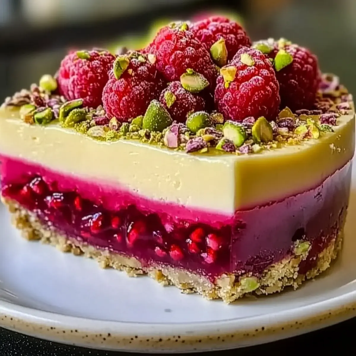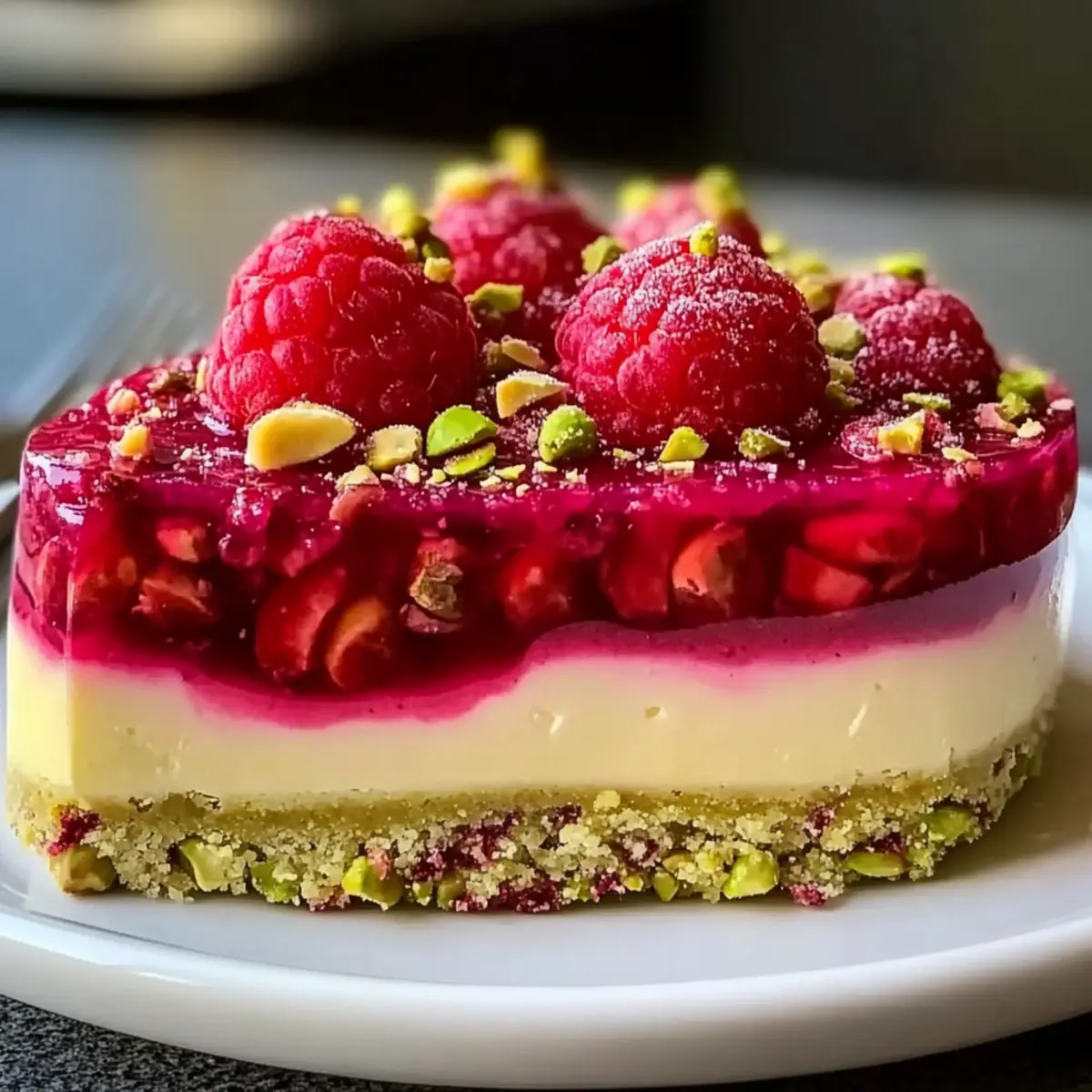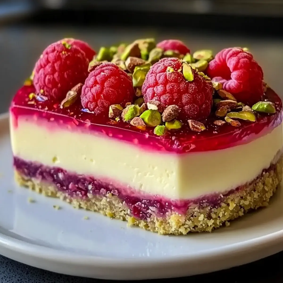 Jump to Recipe Print RecipeA delightful fusion of flavors awaits in this no-bake masterpiece! When I first took a bite of this Pistachio Raspberry Crunch Cheesecake, it felt like I was transported to a sunlit café, savoring each creamy, nutty, and tart mouthful. Not only is this cheesecake stunning enough to impress at any gathering, but it’s also surprisingly easy to whip up—perfect for those busy weeknights or spontaneous dessert cravings. With minimal tools and no-baking fuss, you’ll find it quickly becomes a staple in your dessert repertoire. Ready to meet your new favorite sweet treat? Let’s dive into how to create this irresistible gem! Why is this cheesecake a must-try? Irresistible Flavor Combination: The creamy pistachio filling beautifully balances the tartness of fresh raspberries, creating a dessert that delights every palate. Effortless Preparation: With no baking required, this easy-to-make cheesecake comes together quickly, making it ideal for those with busy schedules. Gorgeous Presentation: Stunning with its vibrant colors and textures, this cheesecake is perfect for impressing guests or treating yourself. Versatile Recipe: Feel free to substitute raspberries with strawberries or blueberries, allowing you to tailor the flavors to suit your taste or season. Make-Ahead Delight: Its ability to chill overnight means you can prepare this ahead of time and serve it when needed—just slice and enjoy! Once you’ve mastered this recipe, why not explore other dessert inspirations like Churro Cheesecake Indulge or Blueberry Cheesecake Bars? Check them out for more sweet indulgences! Pistachio Raspberry Crunch Cheesecake Ingredients For the Crust • Graham Cracker Crumbs – This forms the crunchy base; you can substitute with any cookie crumbs for a different flavor. • Unsalted Butter – Binds the crust together; use melted for easier mixing. For the Filling • Cream Cheese – Gives the cheesecake its creamy texture; ensure it’s softened to room temperature for a smooth mix. • Powdered Sugar – Sweetens the filling; reducing it may alter the final sweetness balance. • Vanilla Extract – Enhances the flavor profile; a must for depth in the cheesecake. • Whipped Cream – Adds lightness to the filling; fold gently to keep that airy texture. • Chopped Pistachios – Infuses a nutty flavor and delightful crunch; chop finely for even mixing in the filling. • Fresh Raspberries – Provides a tart contrast to the sweetness; choose firm ones to avoid excess moisture. For the Garnish • Chopped Pistachios (for garnish) – Elevates the dessert’s presentation with extra crunch, ensuring every slice looks stunning! Dive into the process of making your Pistachio Raspberry Crunch Cheesecake, and prepare for compliments all around! Step‑by‑Step Instructions for Pistachio Raspberry Crunch Cheesecake Step 1: Prepare the Crust Begin by preheating your oven to 350°F (175°C). In a mixing bowl, combine graham cracker crumbs with melted unsalted butter, mixing until the crumbs are evenly coated. Press this mixture firmly into the bottom of a springform pan, creating an even layer. Bake for 8-10 minutes, until slightly golden, then set aside to cool completely. Step 2: Make the Filling In a large mixing bowl, beat softened cream cheese, powdered sugar, and vanilla extract together until the mixture is creamy and smooth, about 2-3 minutes. This is the base of your Pistachio Raspberry Crunch Cheesecake, so ensure there are no lumps for a silky texture. Set this aside as you prepare to add the light and fluffy components. Step 3: Fold in Whipped Cream Gently fold in the whipped cream into the creamy mixture you created. Use a spatula to combine, being careful to maintain the airiness of the cream. This step is crucial for achieving that luscious texture in your cheesecake filling. Once blended, prepare to incorporate the delightful flavor of pistachios and raspberries. Step 4: Add Pistachios and Raspberries Next, stir in the finely chopped pistachios and the fresh raspberries, mixing carefully to avoid breaking the berries. This step adds a delightful crunch and a burst of tartness to the filling. Ensure everything is evenly distributed, as each bite of your Pistachio Raspberry Crunch Cheesecake should offer a balance of flavors. Step 5: Assemble the Cheesecake Pour the filling mixture over the cooled crust in the springform pan, spreading it evenly with a spatula. Smooth the top for an inviting appearance, and ensure that there are no air bubbles in the filling. This assembly phase is crucial as it brings together the delicious elements of the cheesecake. Step 6: Chill the Cheesecake Refrigerate the assembled cheesecake for at least 4 hours, or ideally overnight, to allow it to set fully. This chilling time is essential, as it helps the filling firm up and enhances the flavors. The cheesecake is ready when it is firm to the touch and holds its shape upon slicing. Step 7: Serve with a Touch of Elegance Once the cheesecake is set, carefully run a knife around the edge of the springform pan to loosen it. Release the sides and slice the cheesecake with a sharp knife for clean edges. Serve each slice garnished with extra chopped pistachios and fresh raspberries for a beautiful presentation. What to Serve with Pistachio Raspberry Crunch Cheesecake Indulging in this vibrant dessert sets the stage for a delightful dining experience full of fresh flavors and satisfying textures. Refreshing Fruit Salad: A mix of seasonal fruits complements the cheesecake’s richness, adding a burst of juiciness to each bite. It’s the perfect palate cleanser between rich flavors while echoing the tartness of raspberries. Luxurious Chocolate Drizzle: Drizzle a rich chocolate sauce over each slice for a decadent twist. The bitterness of the chocolate enhances the sweetness of the cheesecake, making it irresistible! Whipped Cream Topping: A dollop of freshly whipped cream adds lightness and en