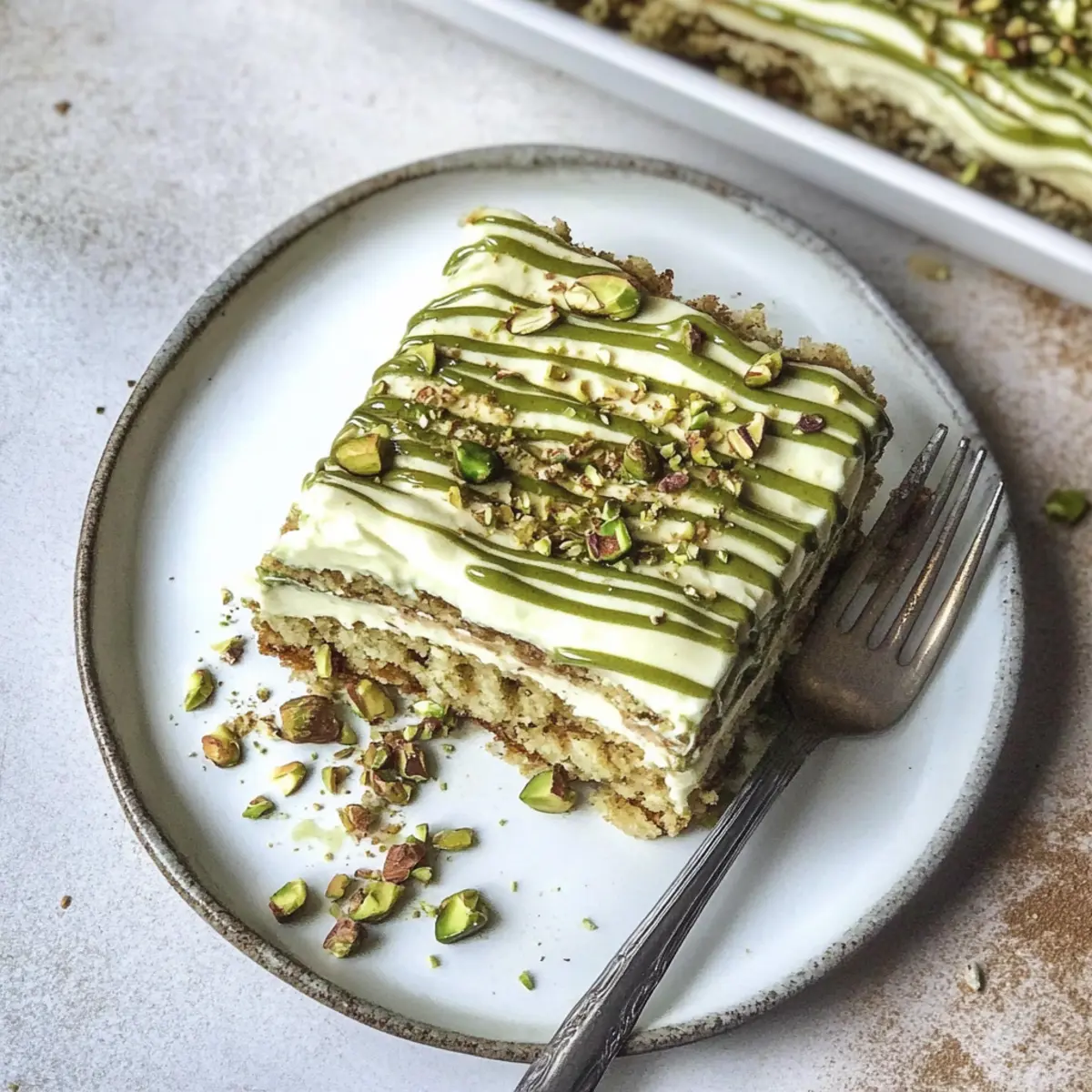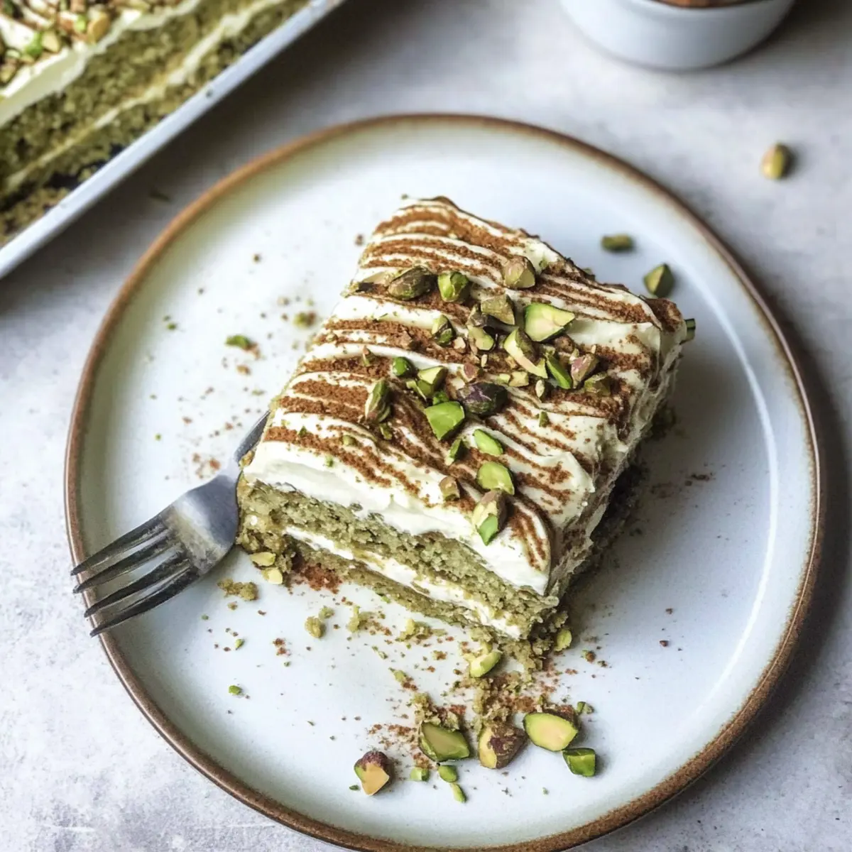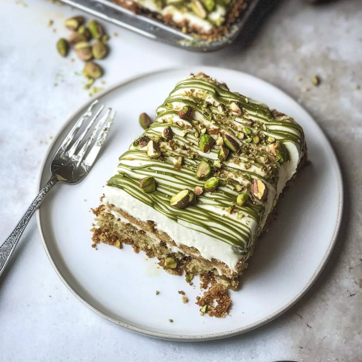Jump to Recipe Print RecipeAs I savored a slice of creamy delight, a friend leaned over and whispered, “How is this tiramisu so different yet so familiar?” That’s when it hit me—this was no ordinary tiramisu; this was my luscious Pistachio Tiramisu! A delightful no-bake dessert that layers dreamy mascarpone cream with coffee-soaked lady fingers, punctuated by a sweet pistachio drizzle. Personalizing this classic treat not only makes it a show-stopper for gatherings but also a quick-prep indulgence that fits right into your busy life. With minimal fuss and no eggs involved, you can whip up this elegant dish ahead of time, perfect for impressing those cherished friends or family. Curious about how you can craft this delightful dessert in your own kitchen? Let’s dive into the recipe! Why Is Pistachio Tiramisu So Irresistible? Decadent Flavor: The rich pistachio cream beautifully complements the coffee-soaked lady fingers, creating a dessert that entices your palate. Quick and Easy: With no baking required, this recipe is perfect for busy weeknights or spontaneous gatherings. Prepare it in advance and let the flavors meld! Crowd-Pleasing: Serve this indulgent pistachio tiramisu at your next dinner party, and watch it disappear in moments—everyone will be asking for seconds! Versatile Variations: Feeling adventurous? Swap in almond or hazelnut cream for a different twist, or explore flavors like banana tiramisu for a unique twist. Gorgeous Presentation: The vibrant green of pistachios against the creamy layers makes this dessert as much a feast for the eyes as it is for the taste buds. Pair it with Tiramisu Cookies Melt for an unforgettable dessert table! Pistachio Tiramisu Ingredients For the Cream Layer Double Cream – Adds a luxurious creaminess; also known as heavy cream for richness. Icing Sugar – Sweetens the cream nicely; substitute with caster sugar for a different texture if needed. Mascarpone – The key ingredient for that classic tiramisu cream; avoid using cream cheese as a substitute. Pistachio Cream – Essential for flavor; either store-bought or homemade; opt for sweetened for a delightful dessert touch. For the Base Savoiardi Sponge Fingers – Absorb the coffee and support the layers; boudoir biscuits can be used if you can’t find savoiardi. Strong Coffee – Perfect for soaking the lady fingers; a splash of pistachio liqueur adds an exciting flavor twist here. For Decoration Chopped Pistachios – Use them to sprinkle on top for added crunch and visual appeal; they beautifully contrast with the creamy layers. These ingredients come together to create a uniquely delightful pistachio tiramisu that’s sure to impress everyone at your table! Step‑by‑Step Instructions for Pistachio Tiramisu Step 1: Whip Cream Begin by pouring 300ml of double cream into a large mixing bowl. Using an electric whisk, whip the cream with 75g of icing sugar until soft peaks form, which should take about 3-5 minutes. Look for a luscious, fluffy consistency that holds peaks while still being smooth and creamy, ready to blend with the rest of the ingredients. Step 2: Combine Creams Next, in another bowl, combine 250g of mascarpone cheese with 100g of pistachio cream. Use a spatula to beat them together until smooth and well-blended. Gently fold this mixture into the whipped cream using a sweeping motion to maintain the airy texture—this creates the rich, delectable cream layer for your pistachio tiramisu. Step 3: Prepare Lady Fingers Now, brew a strong cup of coffee and let it cool slightly. In a shallow dish, pour the coffee, and quickly dip each savoiardi sponge finger into the coffee for just 2-3 seconds to soak. Take care not to let them become soggy, as they should maintain their structure while absorbing the flavor to create an ideal base for your pistachio tiramisu. Step 4: Layer the Tiramisu In a medium-sized dish, lay half of the coffee-soaked savoiardi fingers side by side to form the bottom layer. Then spread half of your creamy pistachio mixture over the sponge layer, smoothing it out evenly. Repeat with another layer by adding more coffee-soaked sponge fingers on top, followed by the remaining pistachio cream, ensuring that the final layer is the luscious cream. Step 5: Decorate For a stunning finish, pipe additional pistachio cream decoratively over the top layer of the tiramisu. Using a toothpick, you can create a beautiful feathered effect by swirling through the cream. Finally, sprinkle a generous amount of chopped pistachios over the top, adding both flavor and a lovely contrast to the creamy layers of your pistachio tiramisu. Step 6: Chill Cover your dessert with plastic wrap and place it in the refrigerator to chill for at least 6 hours, allowing the flavors to meld beautifully. For the best experience, consider letting it sit overnight. When ready to serve, remove from the fridge and let it sit for about 15 minutes at room temperature—this brings out the creamy flavors of your indulgent pistachio tiramisu. Make Ahead Options These delicious Pistachio Tiramisu are perfect for busy weeknights and meal prep! You can prepare the entire dessert up to 24 hours in advance, allowing the flavors to meld beautifully. To do this, whip your cream and combine it with mascarpone and pistachio cream, then layer it with coffee-soaked lady fingers as instructed. Once assembled, cover the dish tightly and refrigerate; this will help maintain the creamy texture and prevent the layers from becoming soggy. When it’s time to serve, let it sit at room temperature for about 15 minutes to enhance the flavor. Your indulgent pistachio tiramisu will taste just as delicious, and you’ll save precious time for other tasks! Pistachio Tiramisu Variations Feel free to add your personal touch to this delightful dessert creation with these fun variations! Nut-Free: Substitute pistachio cream with coconut cream for a tropical twist. It will maintain the dessert’s creamy texture while ad