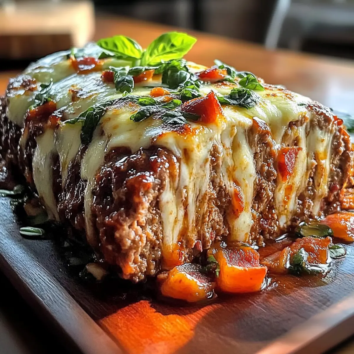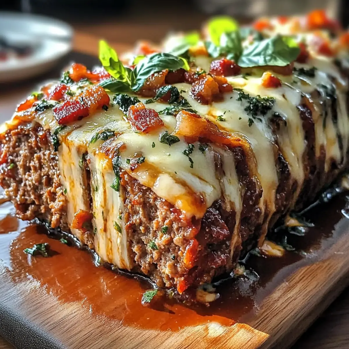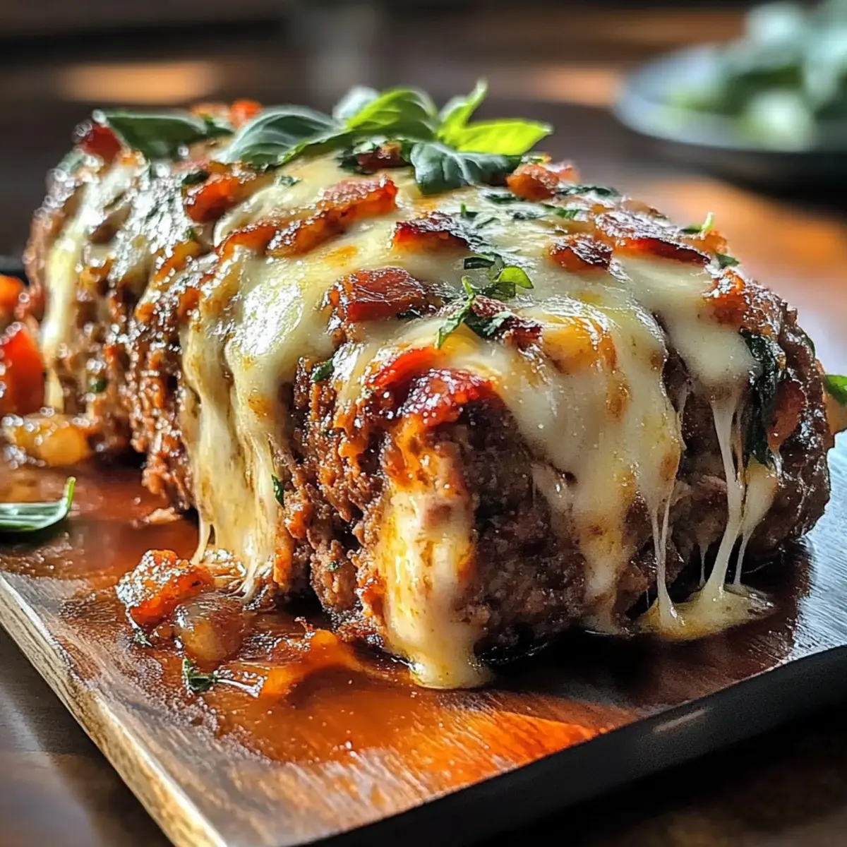 Jump to Recipe Print RecipeAs the sizzling sound of bacon fills my kitchen, I’m instantly transported to family gatherings filled with joy and laughter. Today, I’m excited to share my take on Polpettone Americano, or Bacon Bomb Meatloaf—a dish that beautifully marries rich flavors with hearty comfort. Packed with seasoned ground meats, gooey cheese, and a tantalizing bacon core, this meatloaf isn’t just any comfort food; it’s a delightful feast that brings everyone together. With its surprisingly quick prep time and hearty profile, this recipe is sure to impress at your next dinner party or cozy family meal. Ready to elevate your meatloaf game and discover how this American-Italian fusion can steal the show? Let’s dive in! Why Love Bacon Bomb Meatloaf? Hearty Comfort: Experience the ultimate comfort food with a twist—this Polpettone Americano will warm your heart and satisfy your cravings! Flavor Explosion: Each slice unveils the smoky goodness of bacon combined with rich cheese, bringing a burst of flavors to your plate. Simple Steps: With easy-to-follow instructions, you’ll impress family and friends without spending all day in the kitchen. Flexibility: Customize it! Substitute ingredients to fit dietary needs or try a vegetarian version loaded with veggies and different cheeses. Impressive Presentation: The golden crust accompanied by a juicy interior looks as good as it tastes, making it perfect for special occasions. For a delightful dessert afterward, consider making some Bomboloni Alla Crema to sweeten the evening! Polpettone Americano Ingredients Unleash the flavors of this delicious bacon bomb meatloaf with these essential ingredients! For the Meatloaf Ground Beef – The main protein source, providing that classic meatloaf texture. Substitution: Ground turkey or chicken can create a lighter dish but will vary in flavor. Ground Pork – Adds moisture and depth, resulting in a rich flavor profile. Substitution: More ground beef or a plant-based alternative for a lighter touch. Breadcrumbs – Helps bind the mixture and keeps it moist. Substitution: Crushed crackers or gluten-free breadcrumbs work well. Egg – Essential for binding everything together. Substitution: Use a flax egg or applesauce for a vegan option. Milk – Keeps the mixture tender and moist. Substitution: Almond milk or another non-dairy variety can be used. For the Bacon Bomb Filling Bacon – Creates the iconic “bacon bomb,” adding a smoky richness. Prep Note: Ensure bacon is cooked until crispy to prevent greasiness. Mozzarella Cheese – This cheese adds creaminess and helps hold the filling together. Substitution: Cheddar or another melty cheese can also be fantastic. Cream Cheese – Enhances the richness of the filling. Notes: Light cream cheese can be a lower-fat option. For Seasoning and Flavor Onion – Provides a base of aromatic flavor. Substitution: Shallots can be used for a milder taste. Garlic – Offers a robust and savory kick. Notes: Fresh garlic is preferable, but garlic powder works in a pinch. Parmesan Cheese – Introduces umami and saltiness that elevates the dish. Notes: Nutritional yeast makes a great dairy-free substitute. Italian Seasoning (Oregano, Basil) – Adds depth and complexity to the overall flavor. Notes: Fresh herbs can bring an even brighter taste. For the Glaze Ketchup – Provides the sweetness and tang that balance the flavors perfectly. Brown Sugar – Enhances sweetness for the glaze, creating a caramelized exterior. Notes: Adjust this downward for less sweetness if desired. Worcestershire Sauce – Adds a depth of flavor that enhances the glaze. Mustard – Brings a zesty kick to round out the glaze flavors. Dive into these ingredients, and prepare to experience a slice of comfort with this Polpettone Americano! Step‑by‑Step Instructions for Polpettone Americano Step 1: Prepare the Bacon Bomb Begin by cooking bacon in a skillet over medium heat until crispy, about 8-10 minutes. Once cooked, chop the bacon and combine it with the mozzarella and cream cheese in a bowl, mixing until well combined. This savory filling will be the star of your Polpettone Americano, adding a smoky richness throughout the meatloaf. Step 2: Make the Meatloaf Mixture In a large bowl, combine the ground beef, ground pork, finely chopped onion, minced garlic, breadcrumbs, shredded Parmesan, and beaten egg. Pour in the milk and sprinkle with Italian seasoning. Mix gently using your hands or a spoon until just combined, being careful not to overmix, as you want a tender texture for your meatloaf. Step 3: Form the Meatloaf Preheat your oven to 375°F (190°C). Line a baking sheet with parchment paper for easy cleanup. Shape the meatloaf mixture into a loaf on the parchment, about 2 inches thick. Use your fingers to create a channel down the center, enough to hold the bacon bomb filling that will transform this dish into a delicious Polpettone Americano. Step 4: Stuff the Meatloaf Take the prepared bacon bomb mixture and fill the channel in the meatloaf with it, ensuring it’s packed in tightly. Carefully fold the sides of the meat mixture over the filling, sealing the edges well to prevent any of the cheesy goodness from escaping during baking. This step is crucial for an impressive presentation that delights. Step 5: Prepare the Glaze In a small bowl, mix together ketchup, brown sugar, Worcestershire sauce, and mustard until smooth and well-blended. This glaze will add a beautiful and flavorful coating to your meatloaf. Brush it generously over the top of the meatloaf using a basting brush, ensuring an even layer covers the entire surface for delicious caramelization. Step 6: Bake the Meatloaf Place the meatloaf in the preheated oven and bake for 45-60 minutes, or until the internal temperature reaches 160°F (70°C). The meatloaf should be golden brown and slightly firm to the touch. Keep a meat thermometer handy to ensure the perfect doneness, yielding that juicy texture