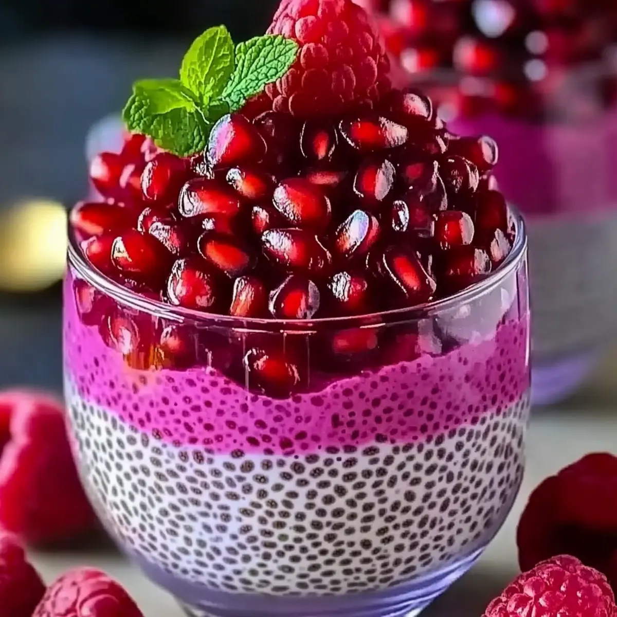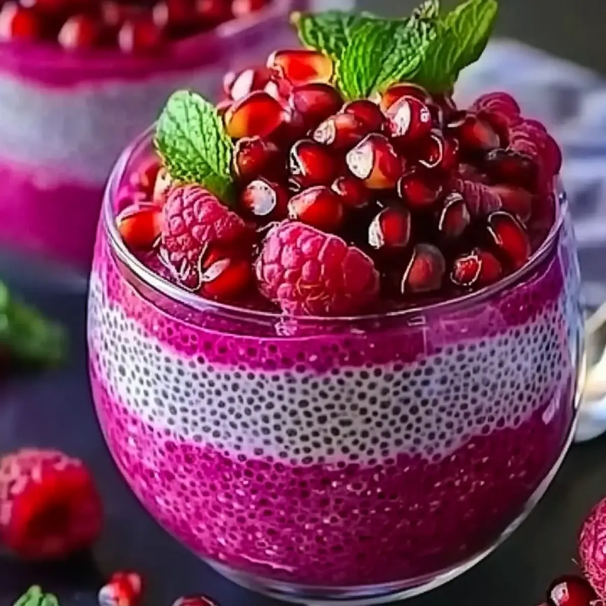 Before serving your Pomegranate Raspberry Chia Delight, take a moment to garnish each glass with fresh pomegranate seeds, additional raspberries, and a sprig of mint for added color and flavor. This final touch not only enhances the visual appeal but also adds a delightful crunch. Enjoy your refreshing, no-bake dessert!
