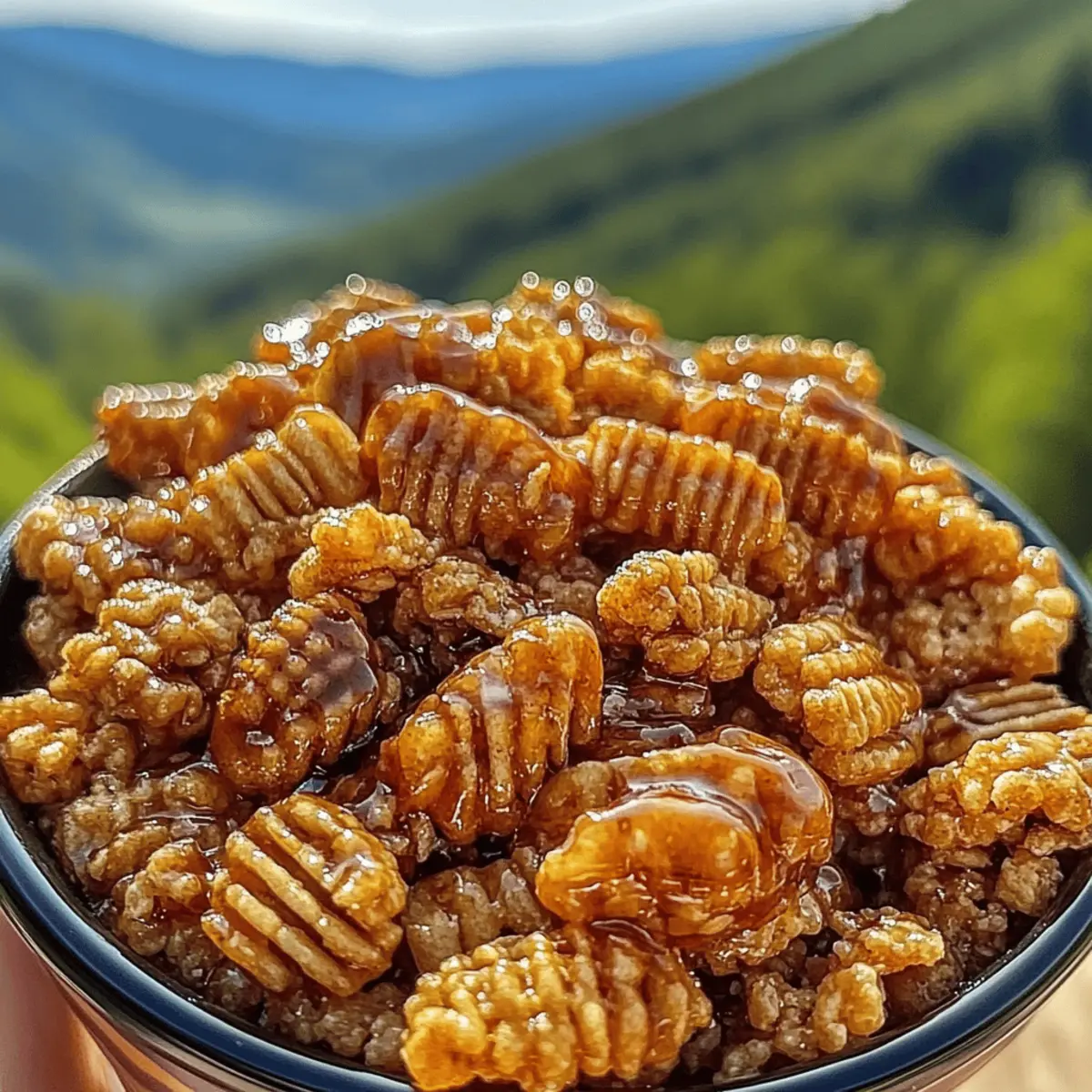 Jump to Recipe Print RecipeAs I stood in my kitchen, the sweet aroma of caramel began to mingle with the satisfying crunch of cereal, creating a symphony of scents that brought back cherished memories. That’s when I knew it was time to whip up my beloved Praline Crunch. This irresistible snack combines crispy cereal and pecans, all coated in a rich caramel glaze that offers a delightful crunch in every bite. Not only is this treat incredibly quick to prepare, but it also makes for a perfect crowd-pleaser at holiday gatherings or when that stubborn sweet tooth strikes. Whether you’re enjoying it on movie night or gifting it to friends, this Praline Crunch is a simple yet delectable way to celebrate life’s little moments. Are you ready to turn your kitchen into a sweet haven? Why Is Praline Crunch Your New Favorite? Quick and Easy: With minimal prep time, this recipe is perfect for those busy evenings when you crave something sweet without a hassle. Versatile Snack: Enjoy it on its own, sprinkle over yogurt, or mix it into your favorite dessert for an extra crunch. Rich, Dreamy Flavor: The buttery caramel and nutty pecans create an unforgettable taste that will keep everyone coming back for more. Perfect for Any Occasion: Whether it’s a family gathering, holiday party, or a cozy night in, this Praline Crunch is bound to impress. Crowd-Pleasing Appeal: Watch your friends gobble it up—the delightful combination is sure to win hearts! If you’re looking for an equally delicious accompaniment, try serving it alongside some crispy Potato Wedges for a delightful mix. Make your kitchen the go-to for sweet treats with this irresistible Praline Crunch! Praline Crunch Ingredients • The secret to that delectable crunch lies in these simple ingredients! For the Crunch Crispy Cereal – Use rice or corn cereal for that classic crunch base. Pecans – Offers a nutty depth; walnuts or almonds can be swapped in for variety. For the Caramel Glaze Butter – Essential for richness; margarine works as a dairy-free substitute. Brown Sugar – Provides sweetness and complexity; consider coconut sugar for a healthier twist. Corn Syrup – Adds chewy texture to the caramel; honey or agave nectar can also be used. Vanilla Extract – Elevates the overall flavor; almond extract is a delightful alternative if you’re feeling adventurous. Baking Soda – Essential for that light coating of caramel; be sure not to skip this ingredient! Get ready for a flavorful adventure with your irresistible Praline Crunch! Step‑by‑Step Instructions for Praline Crunch Step 1: Preheat and Prepare Begin by preheating your oven to 250°F (120°C). While it warms, line a baking sheet with parchment paper to ensure that your Praline Crunch doesn’t stick during baking. This simple preparation step is key to a successful and effortless cleanup later on! Step 2: Combine Cereal and Nuts In a large mixing bowl, combine the crispy cereal and pecans. Gently toss them together using a spatula, ensuring each piece is evenly distributed without crushing the cereal. The blend of textures is essential for that satisfying crunch in every bite of your upcoming Praline Crunch! Step 3: Melt Butter and Cook Caramel In a saucepan over medium heat, melt the butter completely. Once melted, stir in the brown sugar and corn syrup. Allow this mixture to gently boil for about 3-4 minutes, stirring frequently until it thickens noticeably. You’ll know it’s ready when it begins to bubble and develop a rich caramel color. Step 4: Add Flavor Enhancers Remove the saucepan from heat, and with caution, quickly mix in the vanilla extract and baking soda. As you do this, you’ll notice the mixture will bubble up—this is perfectly normal! This step enhances the flavors and provides a light, airy texture to the Praline Crunch. Step 5: Coat the Cereal Mixture Now, pour the caramel mixture over the bowl of cereal and pecans. Using a spatula, stir the mixture well, ensuring that every piece of cereal is coated in that luscious caramel. Be gentle to avoid breaking the cereal while ensuring every bite is filled with delicious sweetness. Step 6: Spread and Bake Spread the coated mixture evenly onto the prepared baking sheet. Place it in your preheated oven and bake for 1 hour, stirring every 15 minutes. This stirring is vital to achieve an even crispness throughout your Praline Crunch, creating that delightful texture you crave. Step 7: Cool and Break Apart Once your Praline Crunch is finished baking, remove it from the oven and allow it to cool completely on the baking sheet. This cooling process is essential for achieving the perfect crunchy texture. After it’s fully cooled, break it into pieces and store in an airtight container for freshness. How to Store and Freeze Praline Crunch Room Temperature: Store your Praline Crunch in an airtight container at room temperature for up to two weeks to maintain its delightful crunchiness. Fridge: If you prefer a cooler treat, you can store it in the refrigerator; however, this may alter the texture slightly, so enjoy it within a week. Freezer: For longer storage, freeze your Praline Crunch in an airtight container for up to three months. When ready to enjoy, simply thaw at room temperature. Reheating: If it loses some crunch, re-bake at 250°F (120°C) for a few minutes to refresh it, ensuring that every bite is just as delicious as when it was freshly made! Praline Crunch Variations & Substitutions Feel free to get creative with your Praline Crunch and make this delightful recipe your own! Nut Swap: Substitute pecans with walnuts or almonds for a distinctly different nutty flavor. Each nut brings its unique crunch, elevating your treat! Gluten-Free: Use gluten-free crispy cereal to cater to those with gluten sensitivities, ensuring everyone can indulge in this sweet delight. Dairy-Free: Replace butter with margarine or coconut oil for a delicious dairy-free alternative that still provides rich flavor. Natu