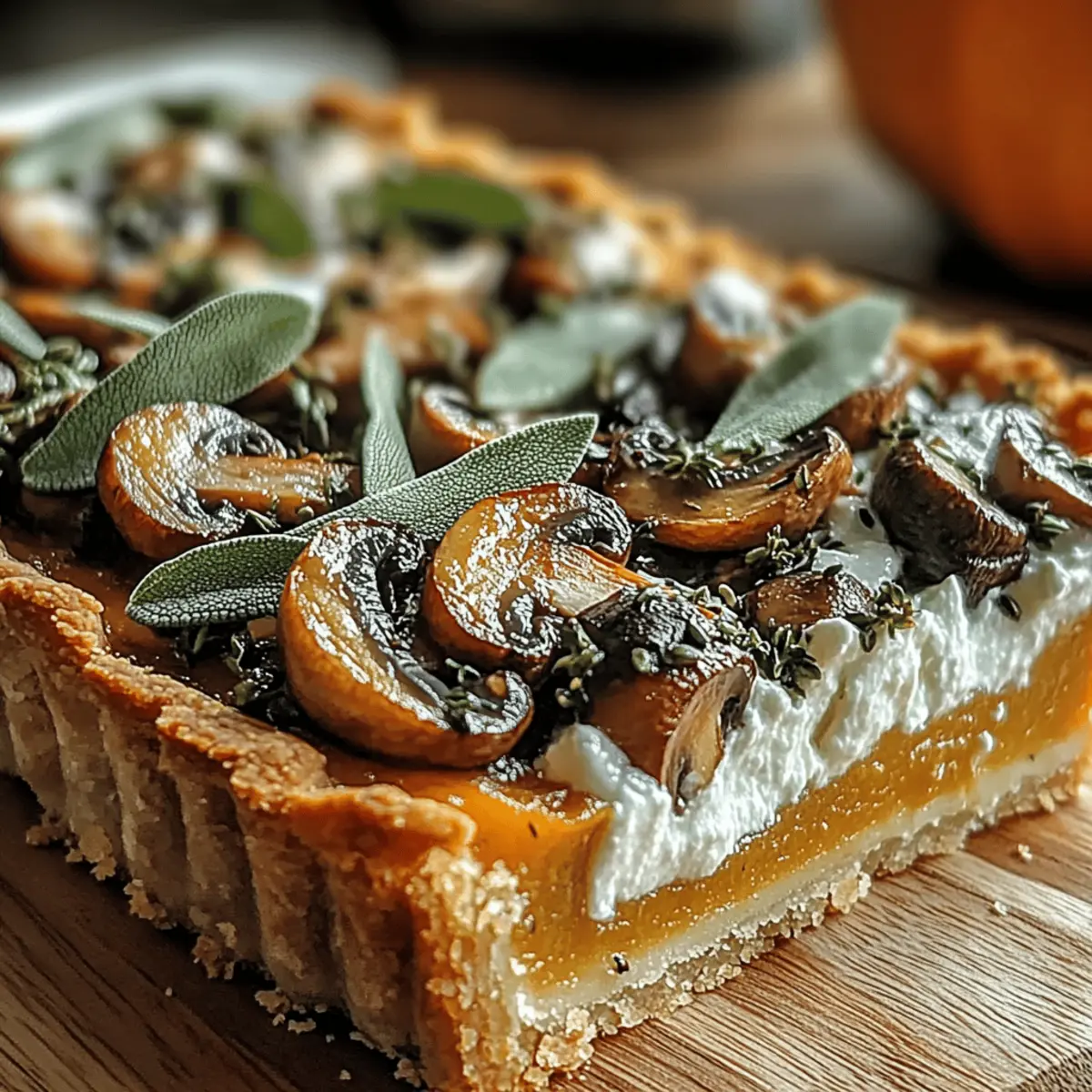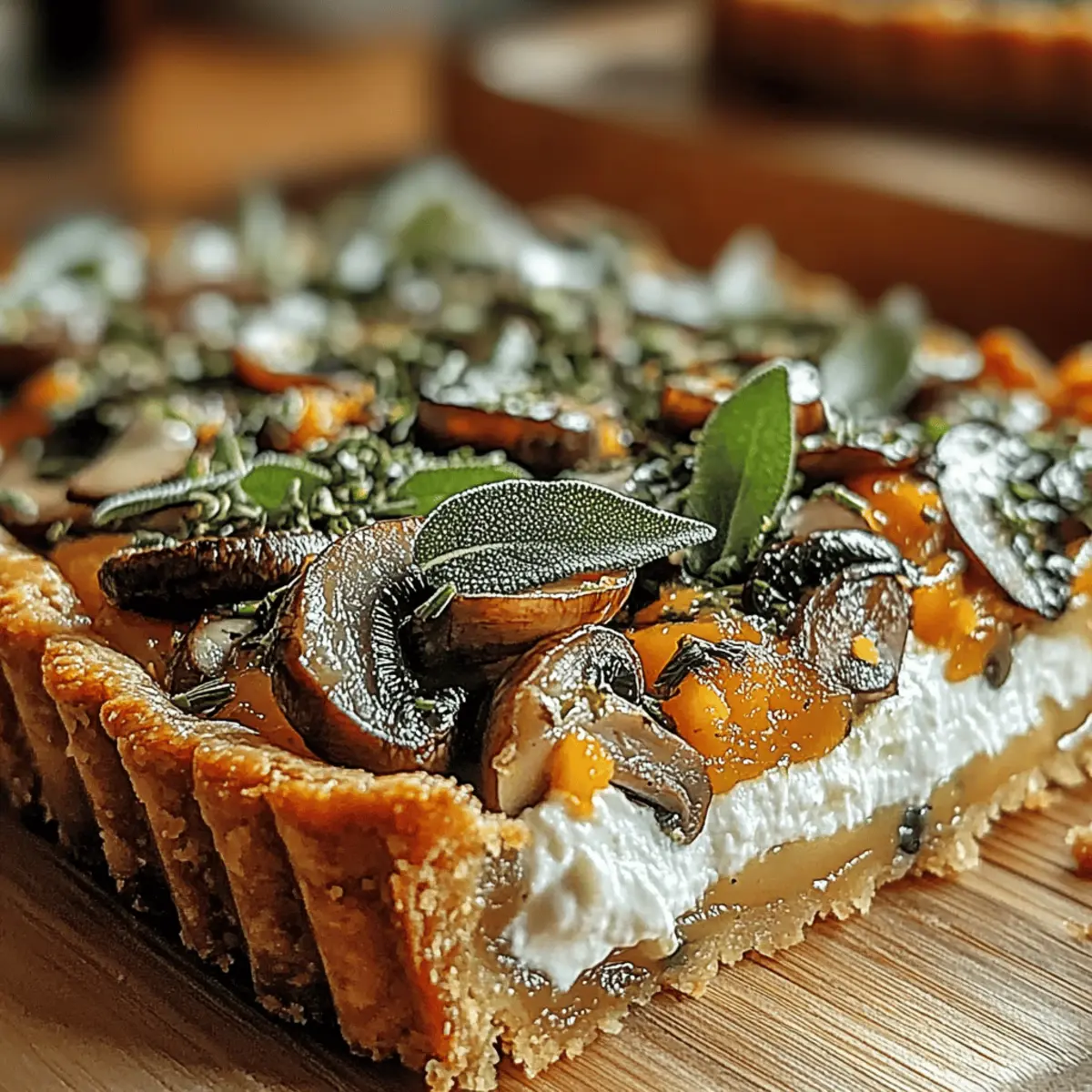 Jump to Recipe Print RecipeAs I prepared my kitchen for the autumn season, a wave of cozy nostalgia washed over me, reminiscent of warm family gatherings and the rich, spiced flavors of fall. This Autumn Harvest Pumpkin Sage & Mushroom Tart encapsulates that comfort and joy, serving as the perfect centerpiece for your next gathering. Featuring creamy pumpkin, earthy mushrooms, and fragrant sage enveloped in a flaky, buttery crust, this tart packs a flavorful punch while being effortlessly vegetarian. With quick prep time and the ability to serve as both a comforting meal or an impressive dish for friends, it’s sure to find a place on your fall menu. Are you ready to bring the taste of the harvest to your table? Why is this tart a must-try? Comforting Flavors: This tart blends creamy pumpkin and earthy mushrooms, delivering a nostalgic taste that screams autumn. Effortless Preparation: With just a few steps, you can whip up this stunning dish, perfect for beginner cooks and seasoned chefs alike. Vegetarian Delight: This recipe is a flavorful, meat-free option that champions seasonal ingredients, delighting both vegetarians and carnivores. Versatility for Any Occasion: Whether you’re hosting a festive gathering or enjoying a cozy night in, this tart adapts beautifully to any setting. Pair it with an arugula salad for a complete meal, or serve it as an impressive appetizer alongside your favorite dishes, like Cajun Pasta Sausage. Crowd-Pleasing Appeal: Watch guests rave over the golden crust and vibrant filling, making it a star player at your fall feasts! Pumpkin Sage & Mushroom Tart Ingredients • Prepare to create a delectable tart that embodies the flavors of autumn! For the Tart Shell Puff Pastry – The flaky base; keep chilled to ensure a light texture. For the Filling Pumpkin Puree – Adds creaminess and a touch of natural sweetness; opt for fresh for the best flavor. Cremini Mushrooms – Provides a rich umami depth; substitute with button or portobello mushrooms if needed. Onion – Imparts sweetness; white or yellow varieties are ideal. Garlic – Elevates flavor; both pre-minced and fresh options work well. Fresh Sage – Contributes an earthy, aromatic quality; dried sage can be used but reduce the amount slightly. Thyme Leaves – Adds extra herbal notes; can be omitted if desired. Ricotta Cheese – Gives the filling a luxurious texture; cottage cheese can be used as a healthier alternative. Parmesan Cheese – Introduces savory richness; consider a dairy-free alternative for vegan options. Eggs – Acts as a binder for the filling; use flax eggs for a vegan twist. Olive Oil – Ideal for sautéing the vegetables; swap with butter for an enriched flavor. Salt and Pepper – Essential to season; adjust according to taste. Pumpkin Seeds (for garnish) – Enhances appearance; toasted nuts can also add a nice touch. Step‑by‑Step Instructions for Pumpkin Sage & Mushroom Tart Step 1: Preheat Oven Start by preheating your oven to 400°F (200°C). This ensures that your Pumpkin Sage & Mushroom Tart will bake evenly and develop that beautiful golden crust. While waiting, gather your ingredients and tools, including a tart pan and parchment paper for easy removal later on. Step 2: Prepare Puff Pastry Take your chilled puff pastry and roll it out on a lightly floured surface, aiming for a thickness of about 1/8 inch. Carefully fit the pastry into your tart pan, pressing it into the corners. Trim any excess pastry and prick the bottom with a fork to prevent bubbling during baking. Step 3: Sauté Vegetables Heat a tablespoon of olive oil in a skillet over medium heat. Add diced onions and minced garlic, sautéing until they become translucent, about 3-4 minutes. Next, introduce the sliced cremini mushrooms to the pan, cooking until they are browned and tender, around 5-7 minutes. Stir in the fragrant sage and thyme, allowing their flavors to meld for 2 more minutes. Step 4: Mix Filling In a large mixing bowl, combine the creamy pumpkin puree, ricotta cheese, half of the grated Parmesan, and the sautéed vegetables from the skillet. Crack in the eggs and season the mixture with salt and pepper to taste. Stir until everything is well incorporated, creating a luscious filling for your tart. Step 5: Fill Tart Pour the pumpkin mixture into the prepared puff pastry shell, spreading it evenly with a spatula. Sprinkle the remaining Parmesan cheese over the top to add a savory crust. This layer will enhance the overall flavor and help achieve that beautiful browning as it bakes. Step 6: Bake Place the tart in your preheated oven and bake for 30-35 minutes. You’ll know it’s done when the pastry is golden brown and the filling is set yet slightly jiggly in the center. Keep an eye on it and rotate the tart halfway through for uniform baking. Step 7: Cool and Garnish Once baked, remove the Pumpkin Sage & Mushroom Tart from the oven and let it cool for about 10 minutes. This resting period helps achieve cleaner slices. Before serving, you can garnish with pumpkin seeds or additional sage leaves for a delightful touch that adds texture and flavor. Pumpkin Sage & Mushroom Tart Variations Feel free to get creative with your tart—these delightful variations will enhance your dish and cater to your taste buds! Butternut Squash: Swap pumpkin puree for butternut squash for a sweet twist that retains the autumn vibe. Embrace the seasonal flavors with this variation; it brings a lovely depth and sweetness to your tart! Spinach or Kale: Substitute mushrooms with spinach or kale for added nutrients and vibrant color. This swap not only jazzes up the filling but adds a hint of green goodness, perfect for the health-conscious. Dairy-Free: Use a dairy-free ricotta and Parmesan for a vegan-friendly option that doesn’t sacrifice flavor. Your guests will love this dairy-free alternative, maintaining the creamy texture while embracing plant-based goodness. Spicy Kick: Add a pinch of red pepper flakes t