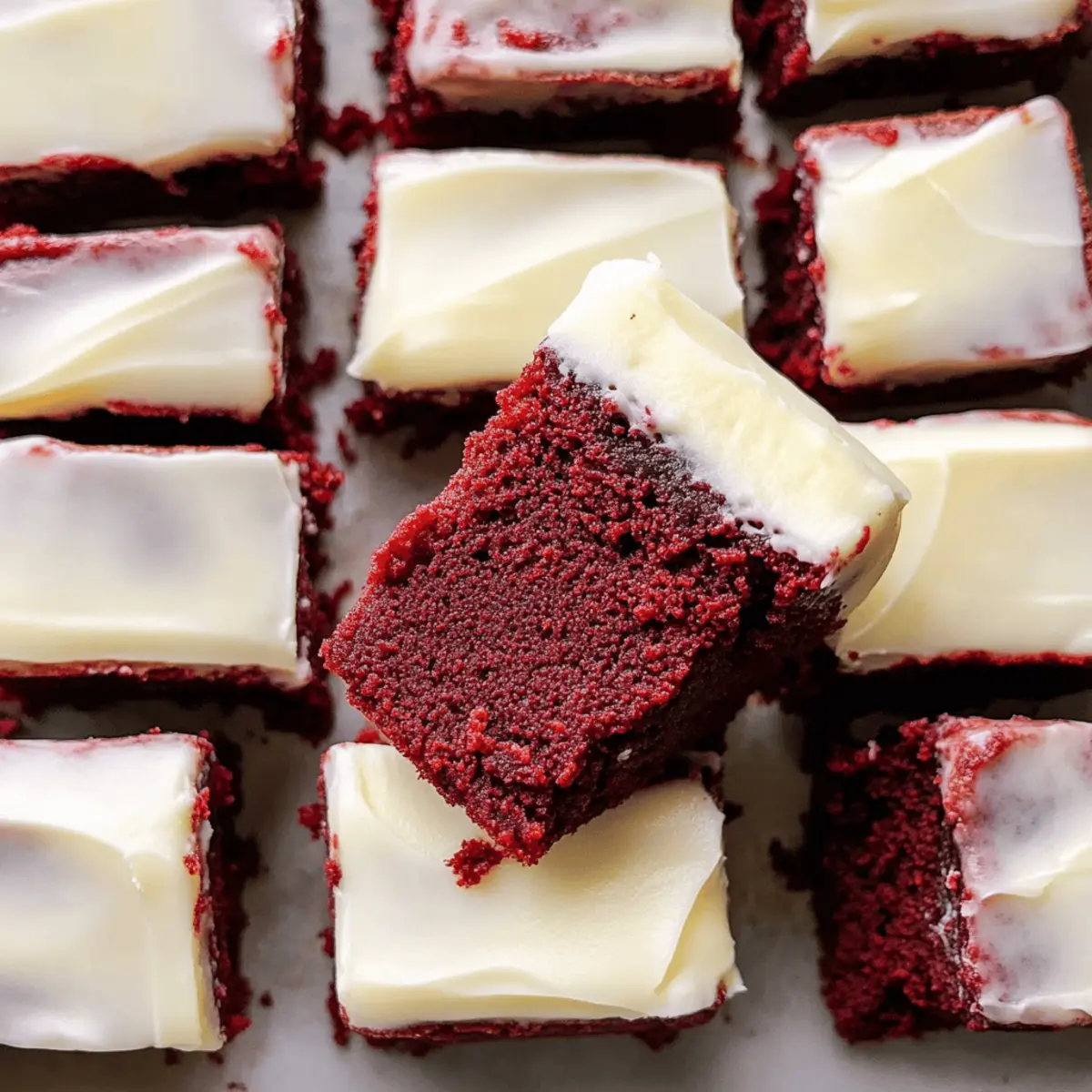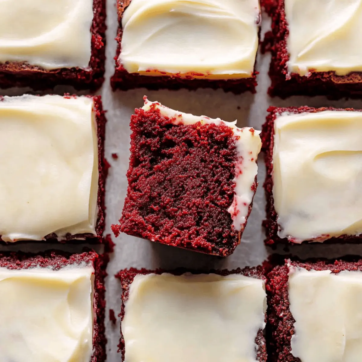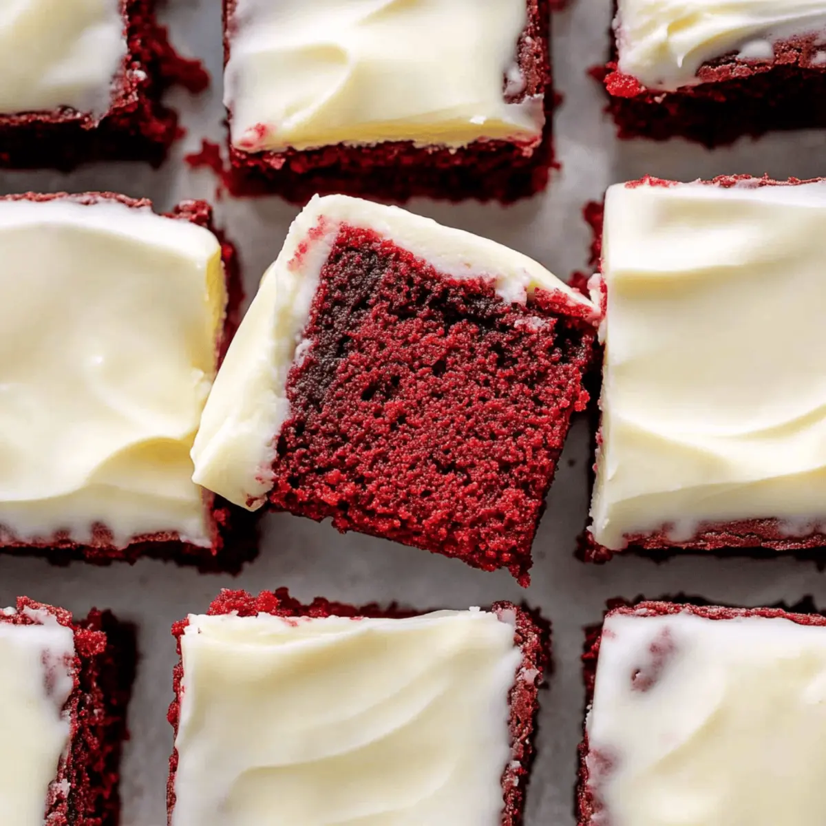 Jump to Recipe Print RecipeAs I stood in my kitchen, the sweet aroma of melting butter and cocoa dancing in the air, I couldn’t help but feel a wave of nostalgia wash over me. It was time for something special: chewy red velvet brownies. These treats aren’t just any ordinary dessert; they’re a celebration in every bite, particularly topped with a smooth cream cheese frosting that’s sure to impress. Whether you’re gearing up for a festive gathering or simply craving a delicious homemade indulgence, these brownies are the perfect solution. Best of all, they can easily be made dairy-free, ensuring that everyone can take part in the joy. Ready to elevate your dessert game? Let’s dive into this delightful recipe and discover the magic of these irresistible red velvet brownies together! Why Are These Brownies So Special? Chewy Texture: The brownies strike an irresistible balance between fudgy and chewy, delivering a satisfying bite every time. Vibrant Red Hue: Their iconic color not only looks beautiful but also brings a festive touch to any occasion. Creamy Frosting: Topped with a luscious cream cheese frosting, each bite is a delightful contrast of flavors and textures. Adaptable Recipe: Easily switch to a dairy-free version without compromising taste, making them inclusive for many diets! Crowd-Pleaser: Perfect for parties or family gatherings, they are sure to impress and satisfy all your guests’ sweet cravings. For another delicious option, try Chicken Alfredo Garlic paired with these treats for a delightful meal that will leave everyone smiling! Red Velvet Brownie Ingredients • Get ready to bake the most flavor-packed Red Velvet Brownies you’ll ever taste! For the Brownies Butter (¾ cup / 158 g) – Provides richness and moisture; opt for dairy-free butter if you’re making a dairy-free version. Light Brown Sugar (¾ cup / 150 g) – Adds moisture and a hint of caramel flavor; coconut sugar can serve as a healthier alternative. Granulated Sugar (1 cup / 200 g) – For sweetness and texture; no substitute recommended to maintain the right sweetness level. Eggs (2) – Provide structure and stability; for a vegan take, consider flax eggs (2 tbsp flaxseed meal + 6 tbsp water). Vanilla Extract (1 tbsp) – Enhances flavor completely; keep this for the best taste. Liquid Red Food Coloring (½ tsp) – Creates the classic red velvet color; gel food coloring can amplify the vibrancy! White Vinegar (1½ tsp) – Helps with leavening by reacting with baking soda; apple cider vinegar can be a great alternative. Cocoa Powder (¼ cup / 22 g) – Infuses a rich cocoa flavor; ensure you use unsweetened for perfect balance. Salt (¼ tsp) – Balances sweetness and heightens flavor—don’t skip this essential ingredient. All-Purpose Flour (1 cup + 3 tbsp / 148 g) – Forms the structure of the brownies; use a gluten-free flour blend for a gluten-free version. For Cream Cheese Frosting Plain Cream Cheese (4 oz) – The base of the frosting; swap for dairy-free cream cheese for a dairy-free option! Butter (¼ cup / 53 g) – Adds a creaminess; a dairy-free butter can work too if needed. Powdered Sugar (1½-2 cups / 180 g) – Sweetens and thickens the frosting; adjusting this changes the consistency, so find your sweet spot! Vanilla Extract (½ tsp) – Boosts flavor; definitely keep this in your frosting mix! Cornstarch (2 tbsp) – Functions as a thickening agent; it’s optional if using dairy-free cream cheese for better consistency. Step‑by‑Step Instructions for Chewy Red Velvet Brownies with Cream Cheese Frosting Step 1: Preheat and Prepare Begin by preheating your oven to 350°F (175°C). While that’s happening, take an 8×8 inch baking pan and line it with parchment paper, leaving some overhang for easy removal later. This ensures your chewy red velvet brownies won’t stick, allowing for smooth slicing after baking. Step 2: Melt and Mix In a medium bowl, melt ¾ cup of butter until it’s completely liquid. Add in ¾ cup of light brown sugar and 1 cup of granulated sugar, whisking them together until the mixture is smooth and shiny. This rich, glossy mixture will be the base of your chewy red velvet brownies filled with flavor! Step 3: Incorporate the Eggs and Flavorings Next, crack in 2 eggs, followed by 1½ teaspoons of white vinegar, 1 tablespoon of vanilla extract, and ½ teaspoon of liquid red food coloring. Mix these ingredients vigorously until they are well combined, achieving a vibrant, uniformly colored batter that showcases the signature hue of red velvet. Step 4: Add Dry Ingredients Gradually sift in ¼ cup of cocoa powder, ¼ teaspoon of salt, and 1 cup + 3 tablespoons of all-purpose flour into the wet ingredients. Carefully fold the dry ingredients into the wet mixture using a spatula until just combined—be cautious not to overmix, as we’re aiming for that perfect chewy texture in our red velvet brownies! Step 5: Pour and Spread Pour the ready batter into the prepared baking pan, then gently spread it evenly to ensure consistent baking. The pan should be filled to the edges, allowing the brownies to rise beautifully while baking. Take a moment to admire the vivid red color before they head into the oven! Step 6: Bake to Perfection Place the pan in the preheated oven and bake for 30 to 40 minutes. Start checking around the 30-minute mark by inserting a toothpick into the center; it should come out with a few moist crumbs. If it comes out clean, your brownies may need a bit less time; watch carefully for that perfect chewy finish. Step 7: Cool and Prepare the Frosting Once baked, remove the brownies from the oven and let them cool in the pan for about 10 minutes. While cooling, prepare your cream cheese frosting by beating together 4 oz of plain cream cheese, ¼ cup of butter, and ½ teaspoon of vanilla extract until creamy. Gradually mix in 1½ to 2 cups of powdered sugar until your desired frosting consistency is achieved. Step 8: Frost and Slice Allo