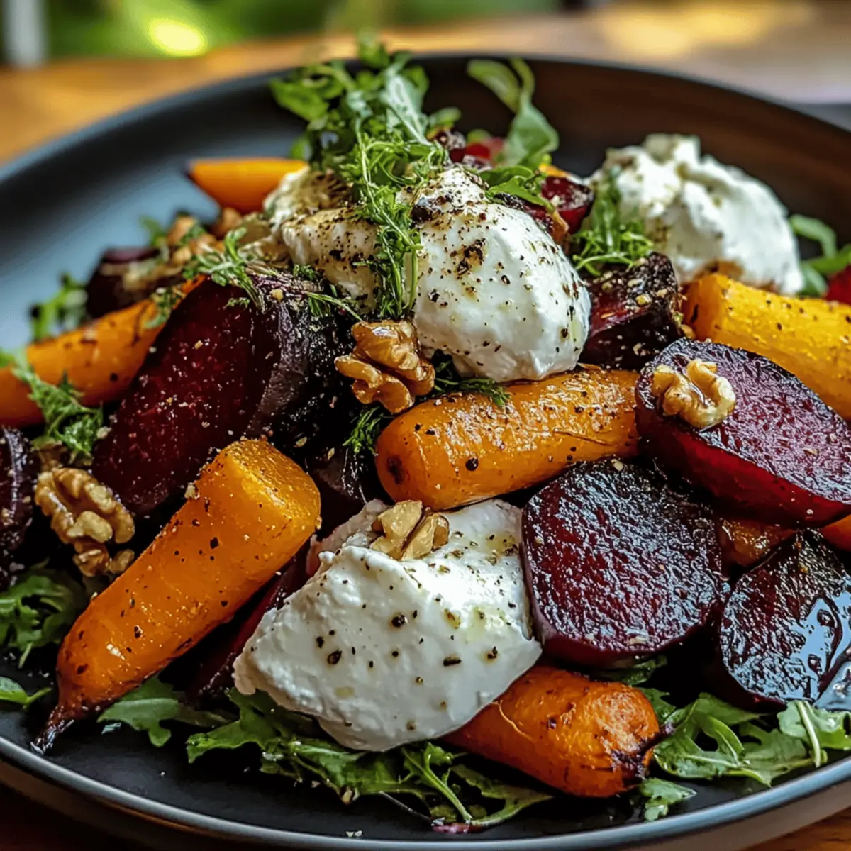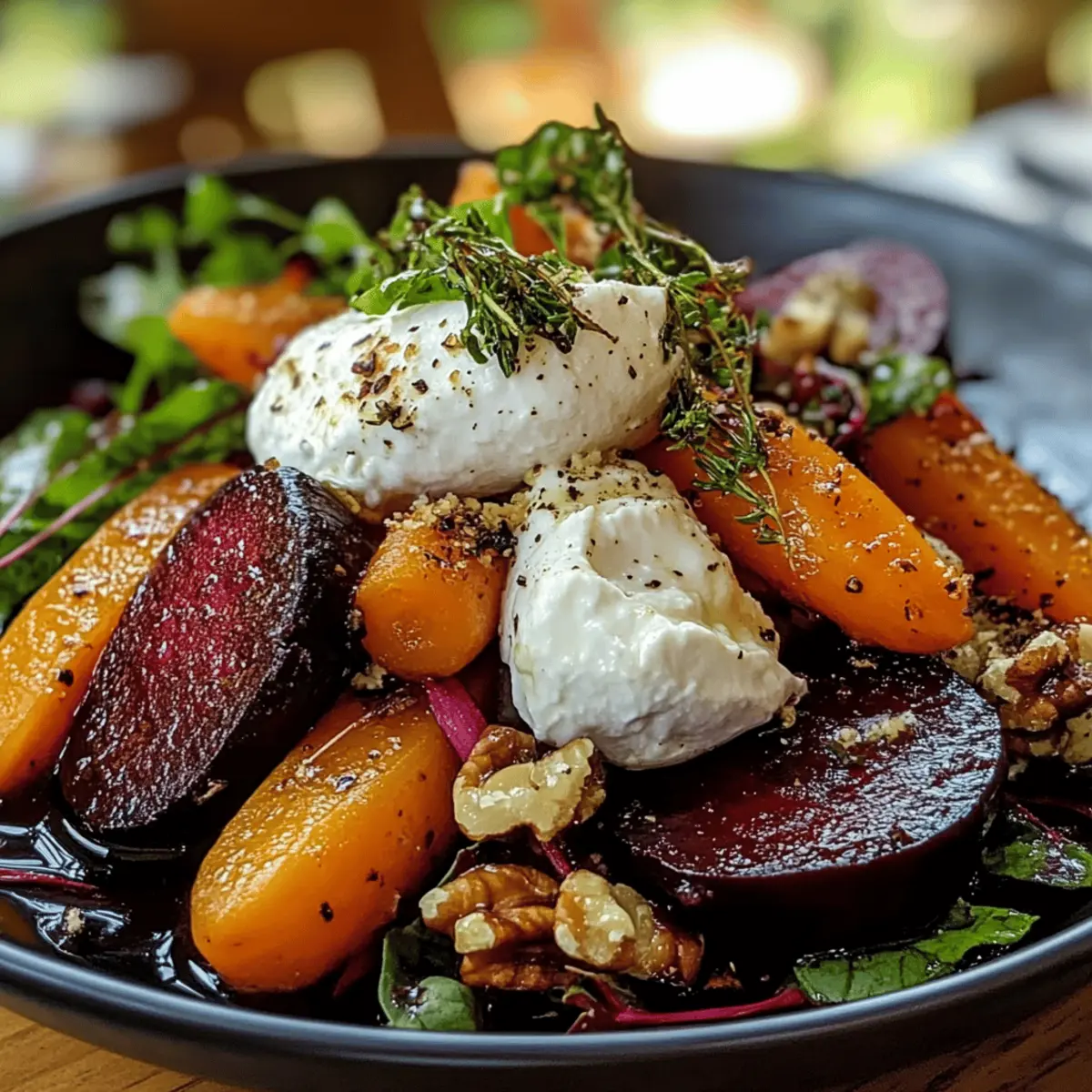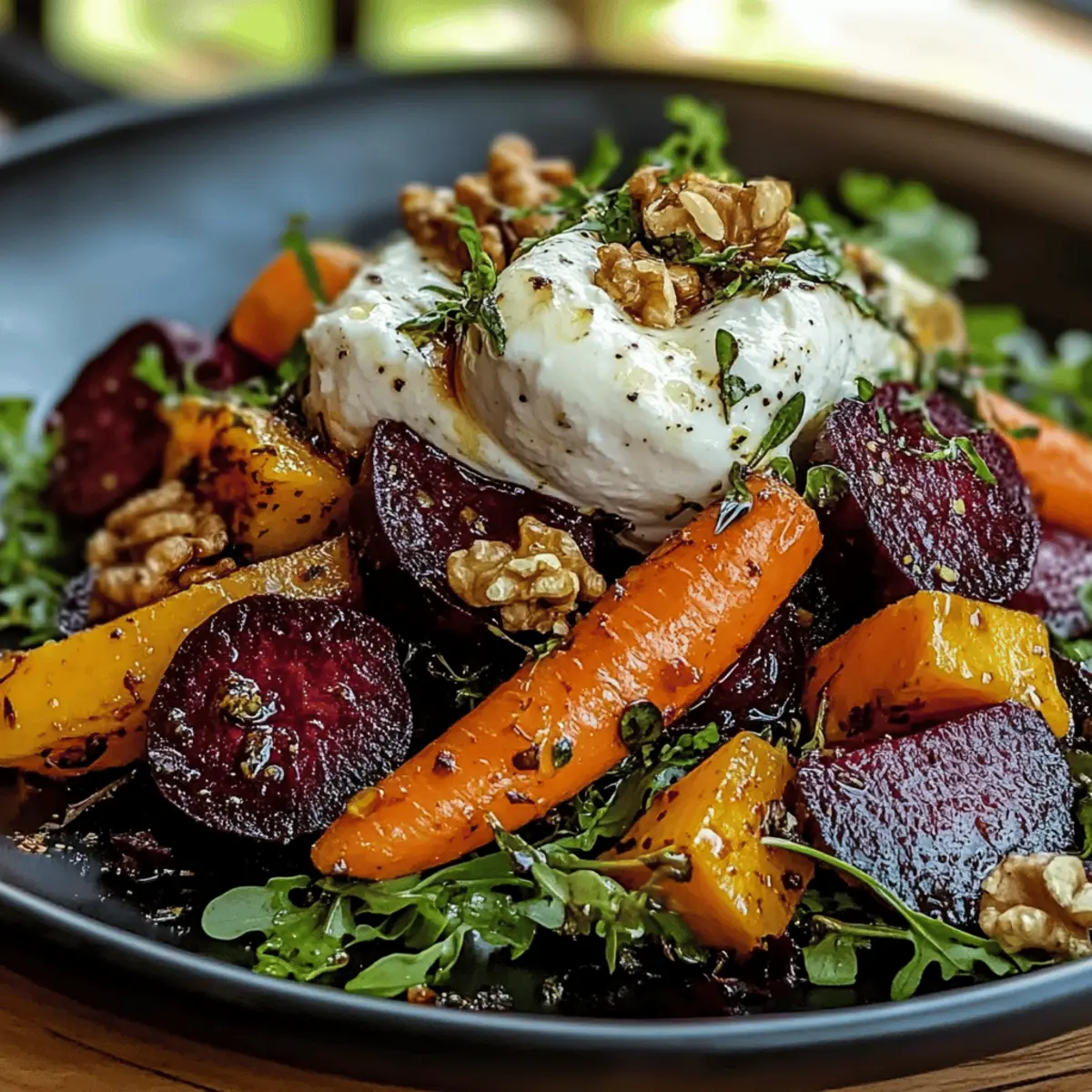 Jump to Recipe Print RecipeThe first time I took a bite of Roasted Beets and Carrots Salad with Burrata, it felt like an explosion of color and flavor on my plate. This vibrant dish isn’t just beautiful; it’s a nutrient-packed delight that perfectly balances the earthy sweetness of roasted beets and carrots with the creamy richness of burrata. Whether you’re looking for a quick weeknight meal or an impressive side for a gathering, this salad is a customizable gem that fits the bill. Plus, it’s vegetarian-friendly, making it a great option for entertaining a variety of dietary preferences. So, are you ready to dive into a salad that’s not only delicious but also easy to whip up? Let’s explore how to create this stunning dish together! Why Is This Salad So Special? Colorful, vibrant presentation: This Roasted Beets and Carrots Salad with Burrata not only pleases the palate but also the eyes, making it a showstopper at any meal. Nutrient-packed goodness: Filled with essential vitamins and healthy fats, this salad is as good for your body as it is for your taste buds. Versatile flavor profile: From a casual lunch to a sophisticated dinner, you can easily switch up the dressing or add proteins like grilled chicken for more substance. Quick and easy preparation: With straightforward steps, you can have this delightful dish ready in no time. Perfect for sharing: This salad is a crowd-pleaser—perfect for gatherings or an elegant dinner party. If you’re also looking to explore more vibrant options, don’t forget to check out the Beet Burrata Salad and Cranberry Rigatoni Salad! Roasted Beets and Carrots Salad with Burrata Ingredients For the Roasted Vegetables • Beets – the earthy sweetness adds depth and color; roast whole with skin for best moisture retention. • Carrots – natural sweetness is intensified by roasting; try rainbow carrots for added visual appeal. For the Salad Base • Greens (e.g., arugula or mixed greens) – fresh greens provide contrast and a delightful crunch to the hearty vegetables. For the Creamy Topping • Burrata – this soft cheese brings a rich creaminess that beautifully complements the roasted flavors; serve at room temperature for the best taste. For the Crunch • Nuts (e.g., walnuts or pecans) – they add a satisfying crunch and depth; feel free to substitute with seeds if you have nut allergies. For the Dressing • Balsamic or citrus vinaigrette – enhances the flavors of the salad and ties everything together; drizzle right before serving to keep the salad crisp. Feel excited to create your Roasted Beets and Carrots Salad with Burrata! Enjoy the vibrant colors and delicious flavors in every bite! Step‑by‑Step Instructions for Roasted Beets and Carrots Salad with Burrata Step 1: Preheat the Oven Begin by preheating your oven to 400°F (200°C). This ensures that it reaches the ideal temperature for roasting the vegetables. As the oven warms up, gather your ingredients and equipment, including a baking sheet for the beets and carrots. Step 2: Prepare the Beets While the oven preheats, prepare the beets. You can roast them whole with the skin on for moisture retention, or peel and cut them into chunks for quicker cooking. If roasting whole, scrub them clean to remove dirt, then place them on the baking sheet to get ready for the oven. Step 3: Chop and Season the Carrots Next, take the carrots and peel them before cutting them into even-sized pieces. Toss the chopped carrots with olive oil, salt, and pepper in a mixing bowl, ensuring all pieces are well-coated. This seasoning will help bring out their natural sweetness as they roast alongside the beets. Step 4: Roast the Vegetables Place the baking sheet with the prepared beets in the preheated oven and roast for 20 minutes. After this time, add the seasoned carrots to the baking sheet, flipping the beets for even cooking. Continue roasting for an additional 20 minutes or until both the beets and carrots are tender and slightly caramelized. Step 5: Cool the Roasted Vegetables Once the vegetables are tender, remove the baking sheet from the oven and allow them to cool slightly. This cooling period enhances their flavor and makes it easier to handle. Meanwhile, prepare your salad greens by rinsing and drying them thoroughly, setting them aside. Step 6: Assemble the Salad On a beautiful serving plate, start by layering your greens as the base for the Roasted Beets and Carrots Salad with Burrata. Arrange the cooled roasted beets and carrots artistically on top of the greens, creating a colorful display that’s sure to impress. Step 7: Add the Burrata Gently place the burrata on top of the roasted vegetables, allowing its creamy texture to shine through. The warmth of the veggies will slightly soften the cheese, enhancing its rich flavor. Take a moment to admire this beautiful salad before finishing it with the next step. Step 8: Finish with Nuts and Dressing Sprinkle your choice of nuts over the top of the salad for an added crunch and depth of flavor. Just before serving, drizzle a balsamic or citrus vinaigrette over the salad, ensuring it’s evenly coated but not wilting the greens. Your Roasted Beets and Carrots Salad with Burrata is now ready to enjoy! How to Store and Freeze Roasted Beets and Carrots Salad with Burrata Fridge: Store leftovers in an airtight container in the refrigerator for up to 3 days. Keep the burrata separate until you’re ready to enjoy it to maintain its creamy texture. Freezer: For best results, avoid freezing the assembled salad; however, you can freeze roasted beets and carrots separately in a freezer-safe container for up to 2 months. Reheating: If using frozen roasted vegetables, thaw in the refrigerator overnight and reheat gently in an oven or skillet. Add fresh greens and burrata just before serving to keep the salad fresh and vibrant. Serving Tip: Dress the salad just before serving to avoid wilting, keeping it crisp and delicious! Expert Tips for