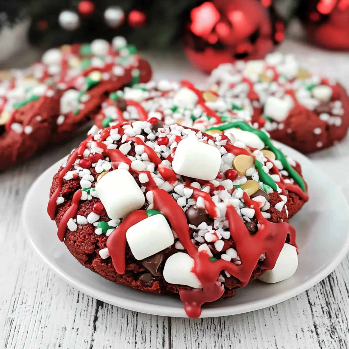 Santa’s Cookies are vibrant red velvet treats with chocolate chips and marshmallows, perfect for holiday celebrations.