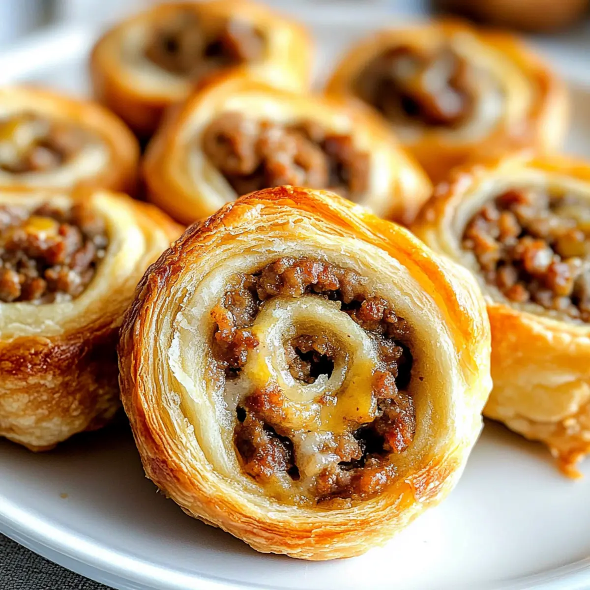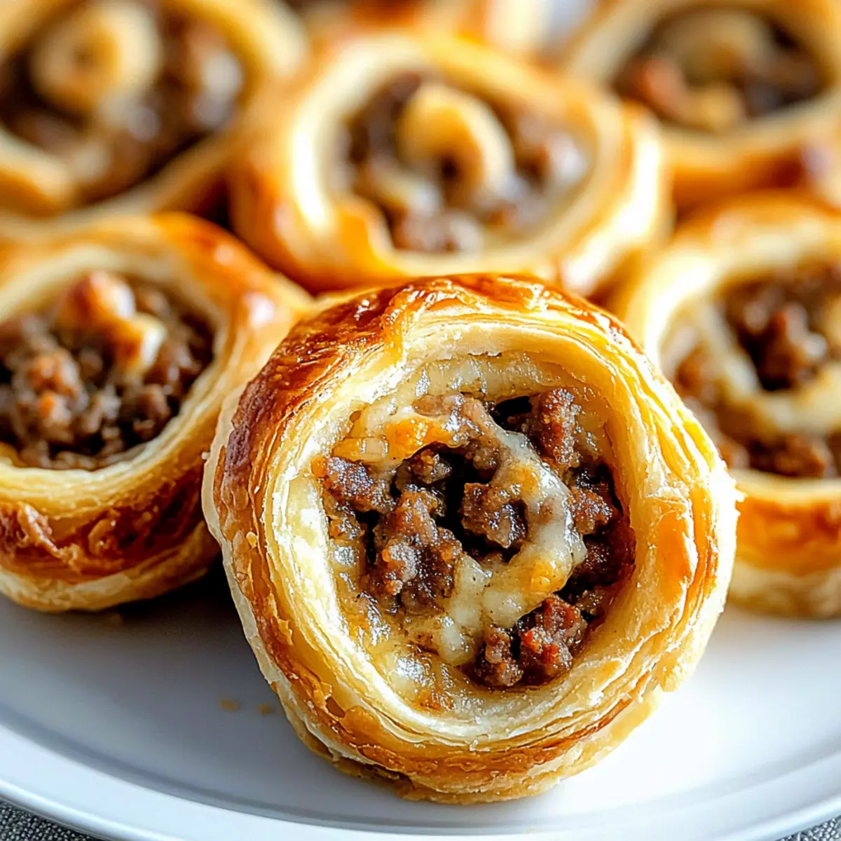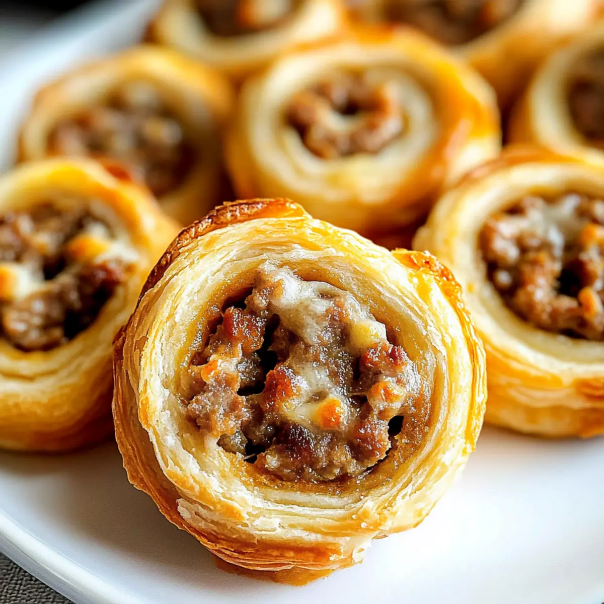 Jump to Recipe Print RecipeYou wouldn’t believe how quickly a party can go from drab to fab with just one simple dish—Sausage Pinwheels! These delightful, 4-ingredient appetizers offer the perfect blend of savory pork sausage, rich cream cheese, and gooey cheddar, all wrapped in flaky crescent roll dough. Not only are they a breeze to whip up, but they’re also a budget-friendly option that lets you impress guests without breaking the bank. Make them ahead of time and watch as your friends keep coming back for more, all while you bask in the glory of your culinary triumph. Who knew creating crowd-pleasing snacks could be this satisfying? Ready to dive into the recipe? Let’s roll! Why Are Sausage Pinwheels Irresistible? Irresistible Flavor: These pinwheels combine the deep, savory notes of pork sausage with creamy cheese for a flavor explosion in every bite. Effortless Preparation: You’ll love how simple these are to prepare—four ingredients and minimal fuss lead to maximum satisfaction. Perfect for Any Occasion: Whether it’s a game night or holiday gathering, these are a hit! Make-Ahead Convenience: Prep them ahead of time and store in the fridge. Just slice and bake when your guests arrive! Crowd-Pleasing Appeal: Watch how quickly they disappear; everyone loves cheesy bites wrapped in flaky goodness. Pair with a side of your favorite dipping sauce for extra flair! If you’re in the mood for more deliciousness, check out Sausage Egg Cheese or perhaps whip up some Cheesy Ranch Sausage to impress even more. Sausage Pinwheels Ingredients • Get ready to create delicious bites! For the Filling Bulk Pork Sausage – Provides a savory, meaty base; consider using turkey sausage for a lighter option. Cream Cheese – Adds creaminess and helps bind the filling; flavored varieties can elevate your pinwheels. For the Dough Refrigerated Crescent Rolls – Forms the flaky outer layer; puff pastry can be swapped for an even richer texture. Shredded Cheddar Cheese – Contributes to the overall cheesiness; try swapping in Monterey Jack or Pepper Jack for a twist. Step‑by‑Step Instructions for Sausage Pinwheels Step 1: Cook the Sausage In a skillet over medium-high heat, add 1 pound of bulk pork sausage. Cook for about 10 minutes, breaking it apart with a spatula, until the sausage is browned and crumbly. Make sure it’s fully cooked, then drain the excess grease and set it aside to cool slightly while you prepare the dough. Step 2: Prepare the Dough Unroll the refrigerated crescent roll package onto a lightly greased sheet of wax paper. Pinch the seams together to create a solid sheet of dough. Ensure there are no gaps, as this will help hold the filling in place. Preheat your oven to 375°F, so it’s ready when the pinwheels are assembled. Step 3: Add the Filling Spread half of the cream cheese evenly over the prepared dough, leaving about a 1/2-inch border at the edges. Sprinkle half of the cooked sausage on top, followed by half of the shredded cheddar cheese. This will create a deliciously savory filling for your Sausage Pinwheels, ensuring each bite is packed with flavor. Step 4: Roll the Dough Using the wax paper for assistance, carefully roll the dough lengthwise into a tight log shape. Make sure to keep the filling intact as you roll. Once rolled, wrap the log in plastic wrap to help maintain its shape, then repeat the process with the remaining ingredients for the second log of pinwheels. Step 5: Chill the Logs Place both wrapped logs in the refrigerator and let them chill for at least 1 hour. This step helps firm them up, making them easier to slice into pinwheels later. You can also prepare these logs a day ahead and store them in the fridge for convenient baking when you’re ready. Step 6: Slice the Pinwheels After chilling, remove the logs from the refrigerator and unwrap them. Using a sharp knife, slice each log into 1/2-inch thick pinwheels and arrange them on a lined baking sheet. Ensure they’re spaced apart to allow for even baking and migration to a golden-brown perfection. Step 7: Bake the Pinwheels Place the baking sheet in the preheated oven and bake the Sausage Pinwheels for 10-15 minutes. Keep an eye on them; they’re ready when they turn golden brown and the cheese begins to bubble. Your kitchen will soon be filled with the mouthwatering aroma of these delicious appetizers. Step 8: Cool and Serve After baking, allow the pinwheels to cool for a few minutes on the baking sheet before transferring them to a serving platter. Serve warm for the best texture and flavor. These Sausage Pinwheels make a perfect appetizer or snack, and can be paired with your favorite dipping sauce for added enjoyment. Sausage Pinwheels Customization Ideas Feel free to get creative and make these delicious pinwheels your own with these fun variations! Bacon Twist: Swap the sausage for cooked, crumbled bacon for a smoky, salty delight. The buttery taste pairs beautifully with the cream cheese. Coming in Hot: Add diced jalapeños to the filling for a spicy kick. This adds a fun layer of heat that your guests will love! Savory Onions: Sauté some onions before adding them to the filling for a sweet and savory depth. The caramelized flavor enhances the overall experience. Herbed Up: Mix in fresh herbs like chives or parsley into the filling for a fresh pop of flavor. It’s an easy way to elevate your pinwheels! Cheesy Combinations: Experiment with different cheese types, such as feta or mozzarella. These can create a whole new flavor profile in your pinwheels. Puff Pastry Alternative: Use puff pastry instead of crescent rolls for a rich, flaky texture that takes your appetizers to the next level. Vegetarian Option: For a lighter twist, use a mix of sautéed mushrooms and spinach instead of sausage. It’s a perfect vegetarian-friendly dish! Sweet Surprise: For a dessert version, try sweetened cream cheese with a sprinkle of cinnamon and chopped apples, wrapped in crescent rolls. Enjo