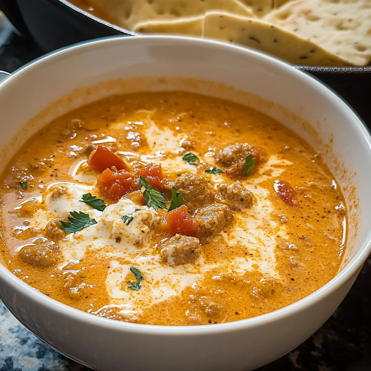 Jump to Recipe Print RecipeHave you ever found yourself in the midst of a hectic week, longing for something warm and hearty to wrap your hands around? Let me introduce you to my Hearty Italian Sausage & Tomato Cream Cheese Soup—the ultimate comfort in a bowl. This delightful recipe combines savory Italian sausage with tangy tomatoes and a luscious creaminess that’s perfect for cozy nights. One of the best perks? It’s ready in just 30 minutes, making it ideal for those busy evenings when fast food just won’t cut it. Plus, with easy ingredient substitutions, you can tailor it to fit your cravings. What’s your favorite twist to add to this comforting classic? Why is this soup a must-try? Comforting Warmth: This Sausage & Tomato Cream Cheese Soup offers the ultimate embrace on chilly nights, serving up warmth in every spoonful. Quick Prep: Ready in just 30 minutes, it’s perfect for a delicious dinner without the wait. Versatile Options: With suggestions like ground turkey or mascarpone, you can customize this dish easily to suit your taste. Rich Flavor: The combination of savory sausage, zesty tomatoes, and creamy cheese creates a robust flavor profile that lingers delightfully. Crowd-Pleasing Dish: Serve it alongside some crusty bread or garlic toast, and watch it become the star of your mealtime. Whether you’re cooking for family or hosting friends, this dish is sure to impress, just like my favorite Chicken Mac Cheese or Cajun Pasta Sausage! Sausage & Tomato Cream Cheese Soup Ingredients For the Base Olive Oil – Adds richness and helps sauté the vegetables; substitute with any cooking oil of choice. Italian Sausage (1 lb) – Provides savory, smoky flavors; use spicy sausage for heat or ground turkey sausage for a lighter option. White Onion (1 small) – Adds sweetness and depth of flavor; can substitute with yellow or red onion. Garlic (2–3 cloves) – Enhances aroma and flavor; use minced garlic from a jar or garlic powder as alternatives. Tomato Puree (8 oz can) – Forms the base of the soup, contributing richness. Crushed Tomatoes (14 oz can) – Adds texture and acidity; can substitute with diced tomatoes. Chicken Broth (1–3 cups) – Provides the soup’s liquid base; adjust for desired thickness, with vegetable broth for a lighter flavor. Dried Basil (1 tsp) – Adds herbal notes; fresh basil can be substituted for a more vibrant flavor. For Creamy Texture Cream Cheese (1 cup, softened) – Creates a creamy texture; mascarpone can be used as an alternative for a richer taste. Parmesan Cheese (¼ cup, grated) – Helps increase richness and adds a salty flavor; nutritional yeast could be used for a dairy-free alternative. For Seasoning Kosher Salt & Black Pepper – Enhances the overall taste, so adjust to your liking. Step‑by‑Step Instructions for Sausage & Tomato Cream Cheese Soup Step 1: Heat the Oil In a large pot, heat 2 tablespoons of olive oil over medium-high heat until shimmering. This should take about 1-2 minutes. You’ll know it’s ready when the oil glistens. Next, add a small, diced white onion and sauté it for about 4-5 minutes until it becomes soft and translucent, enhancing the aromatic foundation of the Sausage & Tomato Cream Cheese Soup. Step 2: Cook the Sausage Add 1 pound of Italian sausage to the pot, breaking it up with a wooden spoon. Cook for around 5-7 minutes, stirring frequently, until the sausage is browned and no longer pink. This step infuses the soup with savory flavors, and you’ll love the sizzling sound as it cooks. Once perfectly browned, it’s time to move to the next step. Step 3: Add Garlic Stir in 2-3 minced garlic cloves and sauté for an additional minute, allowing the garlic to become fragrant. Be careful not to burn it, as garlic can turn bitter if cooked too long. You’ll notice a delightful aroma filling your kitchen, which means your Sausage & Tomato Cream Cheese Soup is heading in the right direction! Step 4: Incorporate Tomatoes Pour in 8 ounces of tomato puree and 14 ounces of crushed tomatoes, stirring them into the mixture. Gradually add 1-3 cups of chicken broth, adjusting the amount for your desired soup thickness. Bring this flavorful mixture to a boil, and then reduce the heat to simmer for 10-15 minutes. The sauce should bubble gently, letting the flavors meld beautifully. Step 5: Add Seasonings After simmering, sprinkle in 1 teaspoon of dried basil and mix well. Taste your soup and adjust the seasoning with kosher salt and black pepper according to your preference. This is where your Sausage & Tomato Cream Cheese Soup takes on its full flavor profile, so don’t hesitate to make it your own! Step 6: Mix in Cream Cheese Reduce the heat to low, then spoon in 1 cup of softened cream cheese. Stir the mixture continuously until the cream cheese is fully melted and the soup becomes creamy and smooth. If the soup looks too thick, you can add a bit more chicken broth. This step transforms it into a comforting, rich delight that wraps you in warmth. Step 7: Serve and Enjoy Once everything is combined and heated through, ladle the soup into bowls. Top with ¼ cup of grated Parmesan cheese and freshly chopped parsley for a pop of color. This final touch enhances the flavor and presentation of your Sausage & Tomato Cream Cheese Soup, making it an inviting dish perfect for any table! Sausage & Tomato Cream Cheese Soup Variations Feel free to unleash your creativity with this recipe and make it your own; these flavorful twists will surely excite your palate! Ground Turkey: Swap the Italian sausage for ground turkey for a lighter, healthier version without sacrificing flavor. Extra Veggies: Toss in fresh spinach or kale for a nutrient boost and vibrant color. They’ll add both health benefits and a lovely texture! Smoky Flavor: Add roasted red peppers for a delightful smokiness that elevates the overall taste of your soup. This simple change makes a world of difference. Gourmet Touch: Experiment with masca