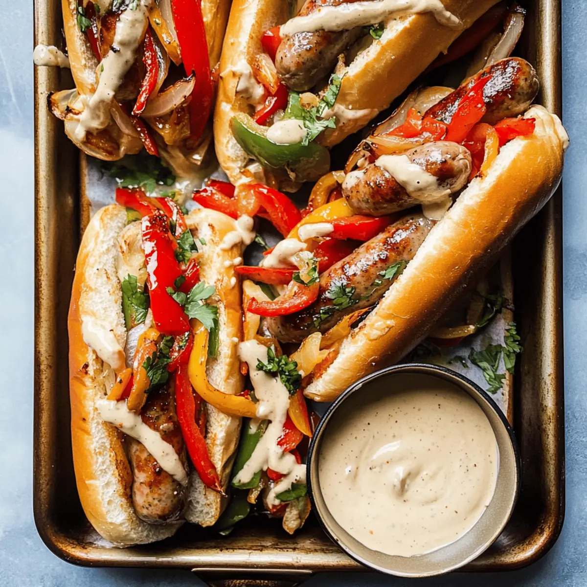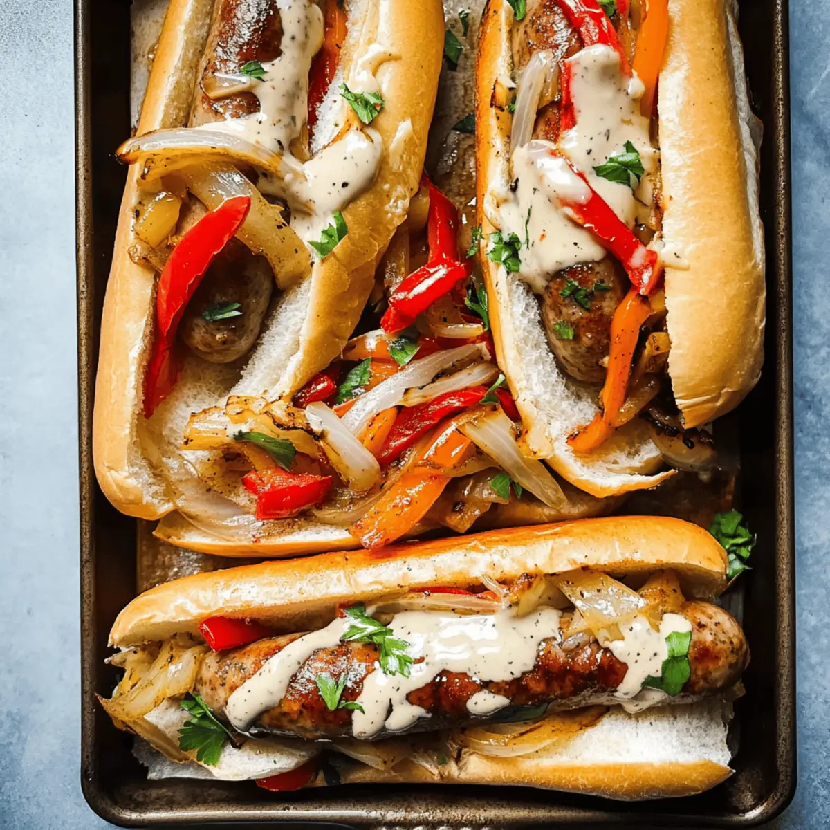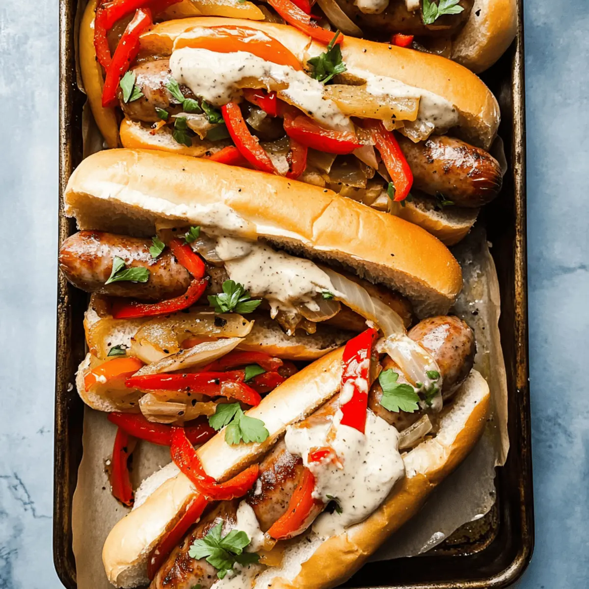 Jump to Recipe Print RecipeAs the delightful aroma of roasting peppers fills my kitchen, I can’t help but feel a tiny thrill of excitement. This Sheet Pan Italian Sausage Heros with Honey Mustard recipe transforms an ordinary weeknight dinner into a memorable feast—all in just about 45 minutes! Juicy Italian sausages are nestled between sweet, caramelized onions and bell peppers, served on crispy hoagie rolls, and drizzled with a rich, creamy honey mustard sauce. Not only is this dish a breeze to whip up, but it also doubles as an easy crowd-pleaser that even the pickiest eaters will adore. Plus, with a bit of flexibility, you can customize the ingredients to suit your dietary preferences, making it a versatile favorite in any home. Are you ready to indulge in a gourmet sandwich experience without the deli line? Why are these heros so irresistible? Simplicity at Its Best: The straightforward sheet pan method makes cooking a breeze, perfect for busy weeknights. Flavor Explosion: Juicy Italian sausages paired with roasted peppers and a creamy honey mustard sauce guarantee a mouthwatering experience. Customizable Delight: Feel free to substitute ingredients for personal preference, like using chicken sausage or adding your favorite cheese. Crowd-Pleaser: This easy dinner is bound to impress friends and family alike, just like my Honey Pepper Chicken or Tuscan Sausage Pasta. Quick Preparation: With only 45 minutes from start to finish, you can enjoy a home-cooked meal without hours in the kitchen. Healthy Option: Increase the veggie ratio for a nutritious twist, making it both satisfying and guilt-free. Sheet Pan Italian Sausage Heros Ingredients For the Veggies • Green Bell Pepper – Adds crunch and sweetness. Substitution: Any color bell pepper can be used. • Red Bell Pepper – Contributes additional sweetness and color. Substitution: Use yellow or orange bell peppers for a different flavor profile. • Yellow Onion – Provides savory depth. Substitution: Red onion can be used for a milder flavor. • Extra-Virgin Olive Oil – For roasting veggies, enhances flavor. Substitution: Any vegetable oil works. • Sea Salt – Enhances overall flavor. Note: Adjust salt for dietary needs. For the Sausage Hoagies • Mild Italian Pork Sausage – The main protein source; juicy and flavorful. Substitution: Chicken or turkey sausage can be used for a lighter option. • Hoagie Rolls – The base for the sandwiches. Note: Use gluten-free rolls for a gluten-sensitive option. For the Honey Mustard Sauce • Mayonnaise – Base for the creamy sauce. Substitution: Greek yogurt or a vegan mayo can be used. • Whole Grain Mustard – Provides a tangy flavor in the sauce. Substitution: Any mustard variety can be used. • Honey – Adds sweetness to the sauce. Substitution: Agave syrup can serve as a vegan alternative. • Soy Sauce – Adds umami depth to the sauce. Substitution: Tamari for a gluten-free option; coconut aminos for a soy-free option. Step‑by‑Step Instructions for Sheet Pan Italian Sausage Heros with Honey Mustard Step 1: Preheat the Oven Begin by preheating your oven to 425°F (220°C). Position a rack in the center of the oven to ensure even heat distribution. This high temperature will help achieve that beautiful roasting effect for both the vegetables and sausages, which is essential for creating the flavors in your Sheet Pan Italian Sausage Heros with Honey Mustard. Step 2: Prepare the Vegetables On a large rimmed sheet pan, place the chopped green and red bell peppers along with the sliced yellow onion. Drizzle generously with extra-virgin olive oil, then sprinkle with sea salt. Using your hands or a spatula, toss the vegetables to ensure they are evenly coated, which will help them caramelize beautifully while roasting. Step 3: Add the Sausages Next, nestle the mild Italian pork sausages among the colorful veggies on the sheet pan. This placement allows the juicy sausages to infuse the peppers and onions with their rich flavors as everything cooks together. Make sure the sausages are not touching to allow for even cooking and browning. Step 4: Roast in the Oven Slide the sheet pan into the preheated oven and roast for about 30 minutes. Keep an eye on the veggies and sausages; they should become golden and tender. The sausages are fully cooked when they reach an internal temperature of 160°F (70°C), and the veggies should be soft and slightly caramelized, creating an aromatic delight. Step 5: Make the Honey Mustard Sauce While the sausages and veggies are roasting, combine mayonnaise, whole grain mustard, honey, and soy sauce in a small bowl. Whisk these ingredients together until smooth and creamy. This honey mustard sauce is what brings the whole dish together, offering a perfect contrast to the savory flavors of the Sheet Pan Italian Sausage Heros. Step 6: Assemble the Sandwiches Once the sausages and veggies are done roasting, carefully remove the sheet pan from the oven. Toast the hoagie rolls in the oven or on a skillet until golden. To assemble your sandwiches, place a sausage in each toasted hoagie roll, load it with roasted peppers and onions, and finish with a generous drizzle of the honey mustard sauce. Enjoy warm for a satisfying meal! What to Serve with Sheet Pan Italian Sausage Heros with Honey Mustard A vibrant meal begins with these flavorful sandwiches, guaranteed to please every palate around your table. Crispy Potato Chips: The crunchiness and saltiness of chips create a delightful contrast to the juicy saussages and creamy sauce. Perfect for that satisfying crunch with each bite! Simple Green Salad: A light salad with mixed greens and a lemon vinaigrette adds freshness and balances the richness of the sausages. Toss in some cherry tomatoes for extra color! Garlic Bread: Warm, buttery garlic bread is a fantastic side that brings even more comfort to the meal. Just imagine the garlic aroma mingling with the honey mustard sauce! Roasted Vegetables: Ex
