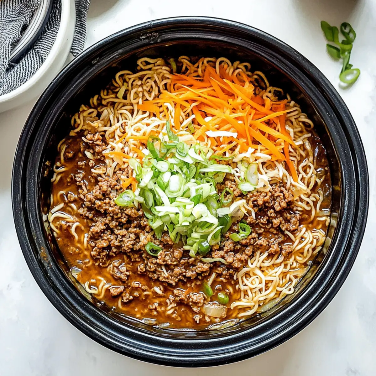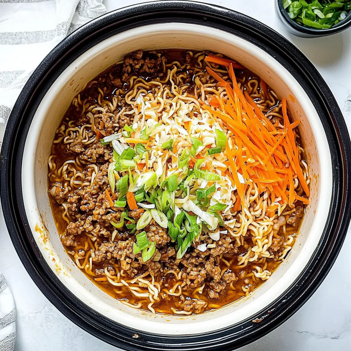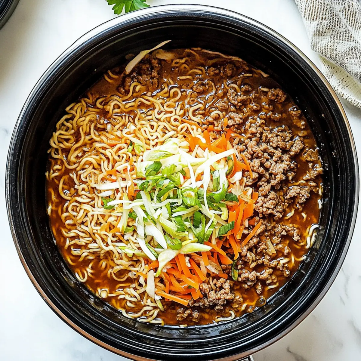 Jump to Recipe Print RecipeAs the aroma of simmering broth fills the kitchen, there’s a palpable sense of comfort in the air. That’s exactly what my Easy Slow Cooker Ramen Noodles with Ground Beef brings to the table—a warm hug in a bowl, perfect for those hectic weeknights when you crave something hearty yet effortless. With minimal prep time, this recipe beautifully combines lean ground beef, colorful slaw mix, and tender noodles, creating a satisfying dish the whole family will adore. Not only does it offer an easy clean-up, but it also leaves plenty of room for culinary creativity with ingredient swaps and adjustments. Ready to dive into a bowl of homemade goodness? Let’s get started on crafting this delicious meal! Why are these Slow Cooker Ramen Noodles special? Comforting, this dish envelops your taste buds in a warm and savory embrace, offering a delightful escape from fast food. Minimal prep means you can effortlessly set it and forget it, making it perfect for busy weeknights. Customizable flavor options allow you to add veggies or swap proteins, catering to everyone’s preferences. Nutritious but satisfying, each serving balances taste with wholesome ingredients. Plus, with an easy clean-up, you’ll have more time to enjoy your meal rather than fussing over dishes—check out this Spicy Ramen Minutes for more quick pasta recipes! Slow Cooker Ramen Noodles Ingredients Discover the simple and delicious ingredients for these Slow Cooker Ramen Noodles that everyone will love! For the Base Lean Ground Beef – A great source of protein that brings rich flavor; feel free to swap with ground turkey for a lighter version. Slaw Mix – Adds an essential crunch and colorful mix of veggies; fresh cabbage or kale can also work beautifully. Shredded Carrots – Sweetness and vibrant color come from these; if you’ve run out, just use chopped fresh carrots instead. Garlic Cloves – Fresh minced garlic enhances aroma and flavor; in a pinch, garlic powder is a handy substitute. For the Broth Low Sodium Tamari or Soy Sauce – Provides a deep umami flavor; opt for tamari if you need a gluten-free option. Chicken Stock – Serves as the flavorful base of your soup; vegetable broth can easily be used for a vegetarian twist. Brown Sugar – A touch of sweetness balances the saltiness; replace it with maple syrup if you prefer a sugar-free diet. For the Noodles Ramen Noodles – These absorb all the delicious flavors from the broth; skip the seasoning packets—they aren’t needed! You can choose gluten-free noodles to accommodate dietary preferences. Now that you have all the ingredients, let’s get cooking! Your cozy meal is just around the corner. Step‑by‑Step Instructions for Slow Cooker Ramen Noodles Step 1: Brown the Ground Beef In a skillet over medium-high heat, brown the lean ground beef for about 5 minutes, breaking it apart with a spatula until no longer pink. Ensure it is evenly cooked and nicely browned, as this will enhance the flavor of your Slow Cooker Ramen Noodles. Once browned, drain any excess fat and transfer the meat to your slow cooker. Step 2: Combine Ingredients in the Slow Cooker In the slow cooker, add the cooked ground beef along with the slaw mix, shredded carrots, and minced garlic. Pour in the low sodium tamari or soy sauce, chicken stock, and brown sugar. Stir well to combine all ingredients, allowing the flavors to mingle together and create a savory base for your dish, ensuring the slaw and carrots are well incorporated. Step 3: Cook the Ramen Noodle Base Cover your slow cooker and set it to cook on high for 2-3 hours or low for 4-6 hours, allowing the vegetables to become tender. During this time, resist the urge to lift the lid, as this will maintain the necessary heat and moisture within the cooker. The mixture should become aromatic and inviting, indicating it’s nearly ready for the next step. Step 4: Add the Ramen Noodles Once the vegetables are tender, increase the heat to high (if not already) and stir in the ramen noodles. Make sure to submerge the noodles fully into the savory broth. Allow the noodles to cook for an additional 5-15 minutes, checking periodically for doneness; they should be soft and ready to soak up all the fantastic flavors from your Slow Cooker Ramen Noodles. Step 5: Serve and Enjoy Once the ramen noodles are tender, give everything a final stir and serve immediately. Ladle the comforting soup into bowls and add toppings of your choice, such as sliced green onions or sesame seeds, to enhance the flavor and presentation. Relish in the delightful warmth of your homemade meal, perfect for family dinners or busy weeknights! Slow Cooker Ramen Noodles Variations Feel free to put your own spin on these comforting slow cooker ramen noodles for an exciting and personalized twist! Dairy-Free: Use coconut aminos instead of soy sauce for a sweeter alternative without dairy. Vegetarian: Swap ground beef with tofu or tempeh—both options will soak up the delicious broth and flavor beautifully. Add Extra Veggies: Toss in snap peas, broccoli, or bell peppers for delightful colors and additional nutrition. These vibrant additions provide a crunchy contrast to the tender noodles. Heat It Up: Add sliced jalapeños or a drizzle of chili oil for a spicy kick! Don’t be shy about experimenting with different levels of heat until you find what makes your taste buds dance. Gluten-Free: Substitute traditional ramen noodles with rice noodles or gluten-free noodles, ensuring everyone at the table can enjoy this satisfying dish. Asian Flare: Boost the umami flavor with a dash of fish sauce or miso paste, elevating your ramen to new levels of deliciousness! Savor the Sweetness: For a little extra sweetness, consider adding a splash of mirin or a pinch of brown sugar, enhancing the overall flavor profile in a delightful way. Cooking Shortcut: If you’re short on time but craving a tasty ramen experience, check out this Spicy Ramen Minutes reci