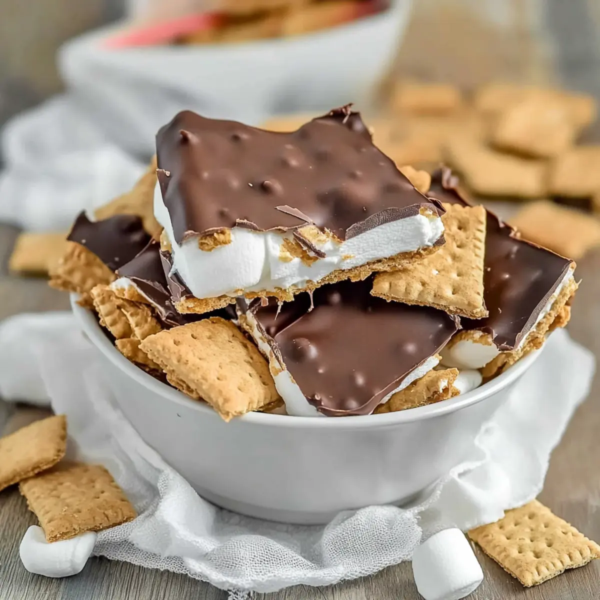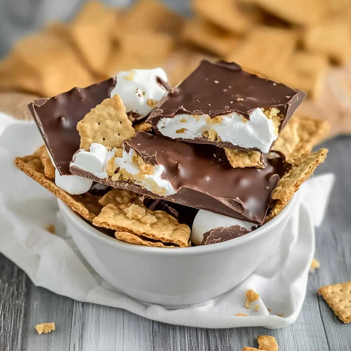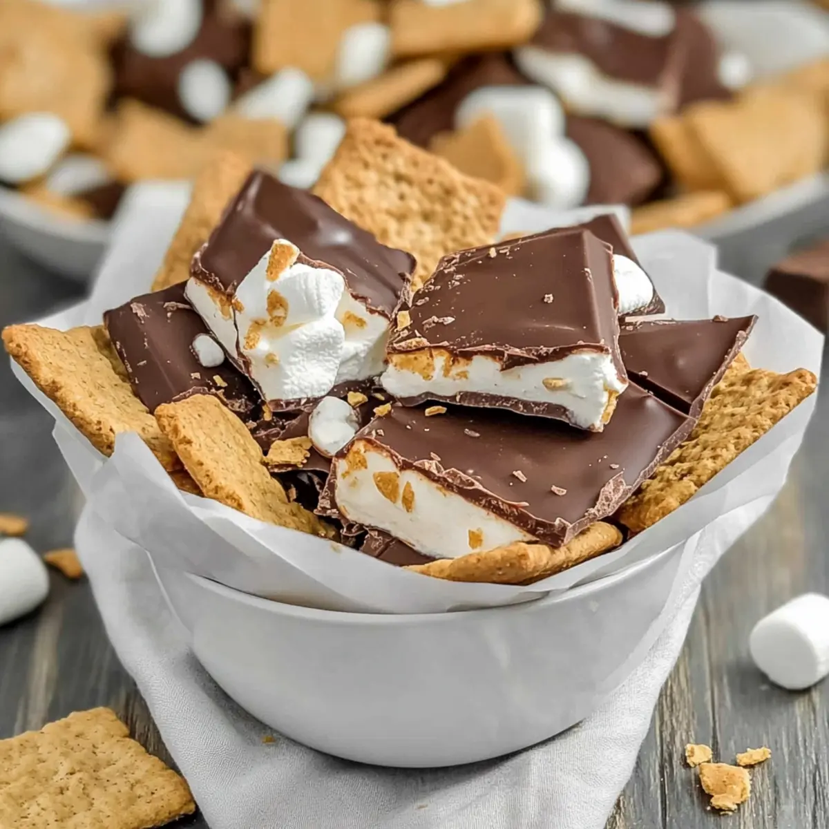Jump to Recipe Print RecipeThe aroma of melted chocolate mixed with marshmallow fluff brings me back to those carefree summer nights, gathered around a campfire. But what if I told you that you can capture that nostalgic flavor without even lighting a match? Enter my No Bake S’mores Chocolate Bark, a delightful tribute to the classic s’mores we all know and love. This easy dessert comes together in a matter of minutes and is the perfect treat for spontaneous gatherings or just satisfying a sweet tooth. With its irresistible layers of creamy milk chocolate, gooey marshmallow, and crunchy graham crackers, it’s hard to resist a second (or third!) piece. Ready to whip up this no-bake wonder? Let’s dive in! Why is S’mores Bark so special? Irresistible Nostalgia: This S’mores Bark brings back cherished memories of summer nights by the campfire, all while eliminating the hassle of open flames. Quick and Easy: With minimal effort, this no-bake dessert can be whipped up in just a few minutes, making it the perfect option for last-minute cravings or spontaneous gatherings. Rich, Layered Flavor: Experience the wonderful combination of creamy milk chocolate, fluffy marshmallow, and crunchy graham crackers that make this treat a favorite among chocolate lovers. Versatile Indulgence: Whether you want a sweet snack during movie night or a show-stopping treat for parties, this S’mores Bark fits any occasion beautifully. Crowd Pleaser: The delightful texture and nostalgic taste will leave your friends and family clamoring for more. Pair this with a refreshing drink for the ultimate experience! If you’re looking for ways to enjoy other classic flavors, check out my recipes for No-Bake Cheesecake and Chocolate Dipped Pretzels. S’mores Bark Ingredients For the Chocolate Layer • Milk Chocolate Chips – Provides a sweet, creamy base that embodies classic S’mores flavor. • White Chocolate Chips – Adds a smooth, sweet layer that complements the milk chocolate beautifully. For the Marshmallow Layer • Marshmallow Fluff – Creates a gooey texture that binds the layers together, enhancing the dessert’s richness. For the Crunch • Graham Crackers – Infuses that irresistible crunch and classic S’mores taste; gluten-free options are available for substitution. Enjoy this S’mores Bark, perfect for any occasion! Step‑by‑Step Instructions for S’mores Bark Step 1: Prepare the Baking Sheet Begin by lining a 10×15 inch rimmed baking sheet with wax or parchment paper, ensuring it covers the entire surface. This will prevent the S’mores Bark from sticking. Smooth out any wrinkles to create an even surface, setting the stage for the delicious layers to come. Step 2: Melt the Milk Chocolate In a microwave-safe bowl, combine 1.5 cups of milk chocolate chips. Heat in the microwave in 30-second intervals, stirring between each until smooth and fully melted—about 1 to 2 minutes total. Pour the melted chocolate into the prepared baking sheet and spread it evenly, ensuring it covers the bottom completely. Place it in the refrigerator for around 30 minutes until set and firm to the touch. Step 3: Combine White Chocolate and Marshmallow Fluff While the milk chocolate layer solidifies, melt ½ cup of white chocolate chips in a separate microwave-safe bowl using the same 30-second method. Once melted and creamy, gently mix in 1 cup of marshmallow fluff until combined. This fluffy mixture will create a sweet topping for the S’mores Bark. Step 4: Spread the Marshmallow Mixture Retrieve the chilled baking sheet from the refrigerator. Carefully spread the white chocolate and marshmallow fluff mixture over the set milk chocolate layer, ensuring even coverage. Use a spatula to smooth it out, creating a beautiful, fluffy top layer that is ready for the crunchy graham crackers. Step 5: Add the Graham Crackers Crumble graham crackers into small pieces and sprinkle them generously over the marshmallow layer. Gently press the crumbs into the mixture using your hands or a spatula, ensuring they adhere well. This step adds that classic s’mores texture and flavor, enticing you with every bite. Step 6: Final Layer of Chocolate Melt the remaining 2 cups of milk chocolate chips in the microwave, following the same method as before. Once fully melted, pour this luscious chocolate over the graham cracker layer, spreading it evenly with a spatula. This creates a rich top layer that will seal in all the deliciousness beneath. Step 7: Chill and Set the Bark Once the final chocolate layer is nicely spread, place the baking sheet in the freezer for at least 2 hours. This will allow the S’mores Bark to harden completely. Keep an eye on it while it chills, and resist the urge to dig in too early! Step 8: Break into Pieces and Serve After chilling, remove the S’mores Bark from the freezer. Lift the entire piece out by the edges of the parchment paper and place it on a cutting board. Use a sharp knife or simply break it into pieces by hand. Serve immediately or store them in an airtight container for later indulgence in this delightful no-bake treat. Expert Tips for S’mores Bark Thick Layer Reminder: Ensure the melted chocolate layers aren’t too thin on the baking sheet; thick layers prevent sticking and create better texture in your S’mores Bark. Microwave Melting: Use 30-second intervals when melting chocolate to prevent it from burning; stirring between intervals promotes even melting. Cooling Time: Patience is key! Allow each layer, especially the final chocolate layer, ample time in the freezer to ensure a perfect, firm set. Marshmallow Fluff Tips: Opt for marshmallow fluff rather than regular marshmallows, as fluff binds the layers effectively for that classic s’mores experience. Optional Additions: Consider adding mini marshmallows or crushed graham crackers on top before chilling for a fancy touch and extra flavor in your S’mores Bark. What to Serve with S’mores Chocolate Bark Whether you