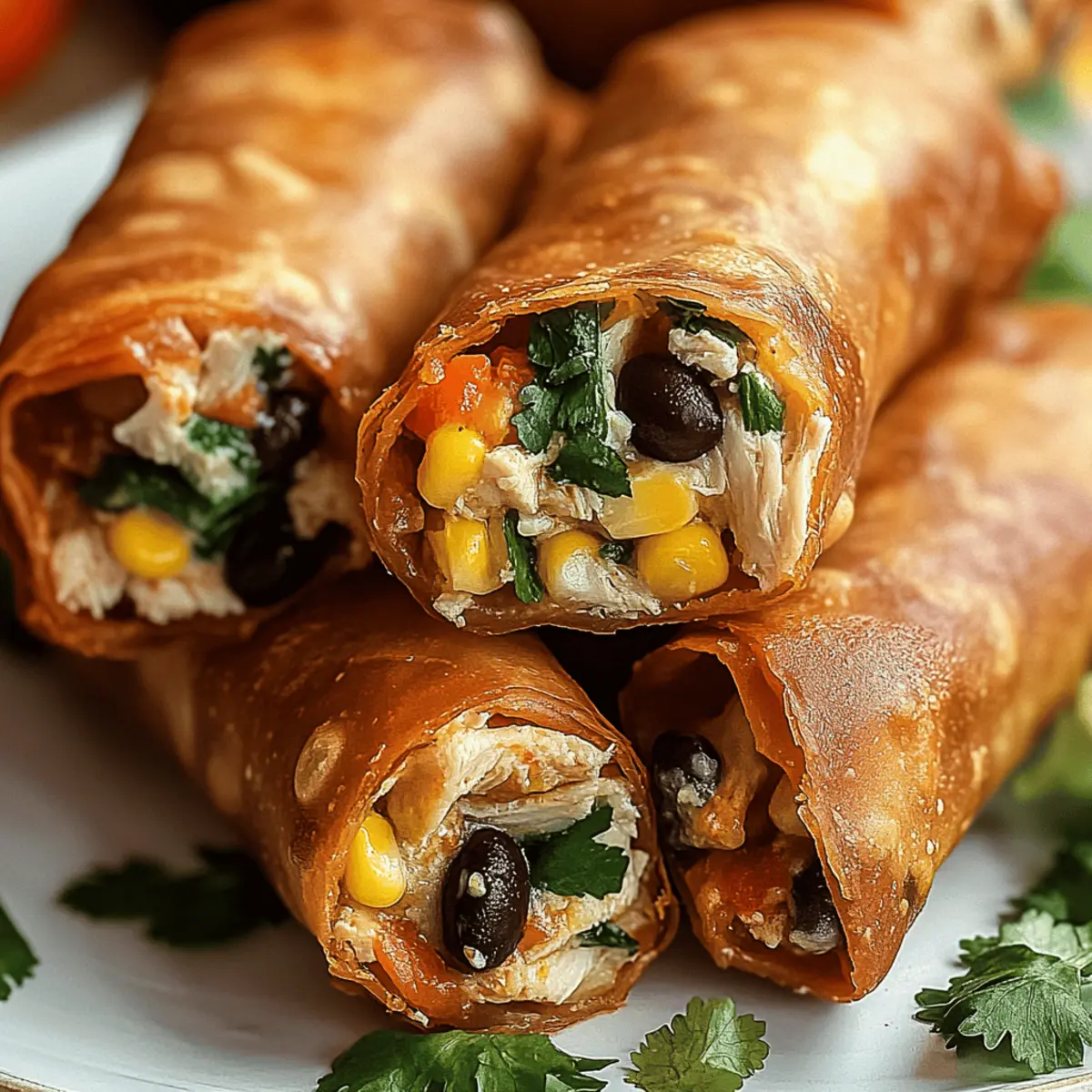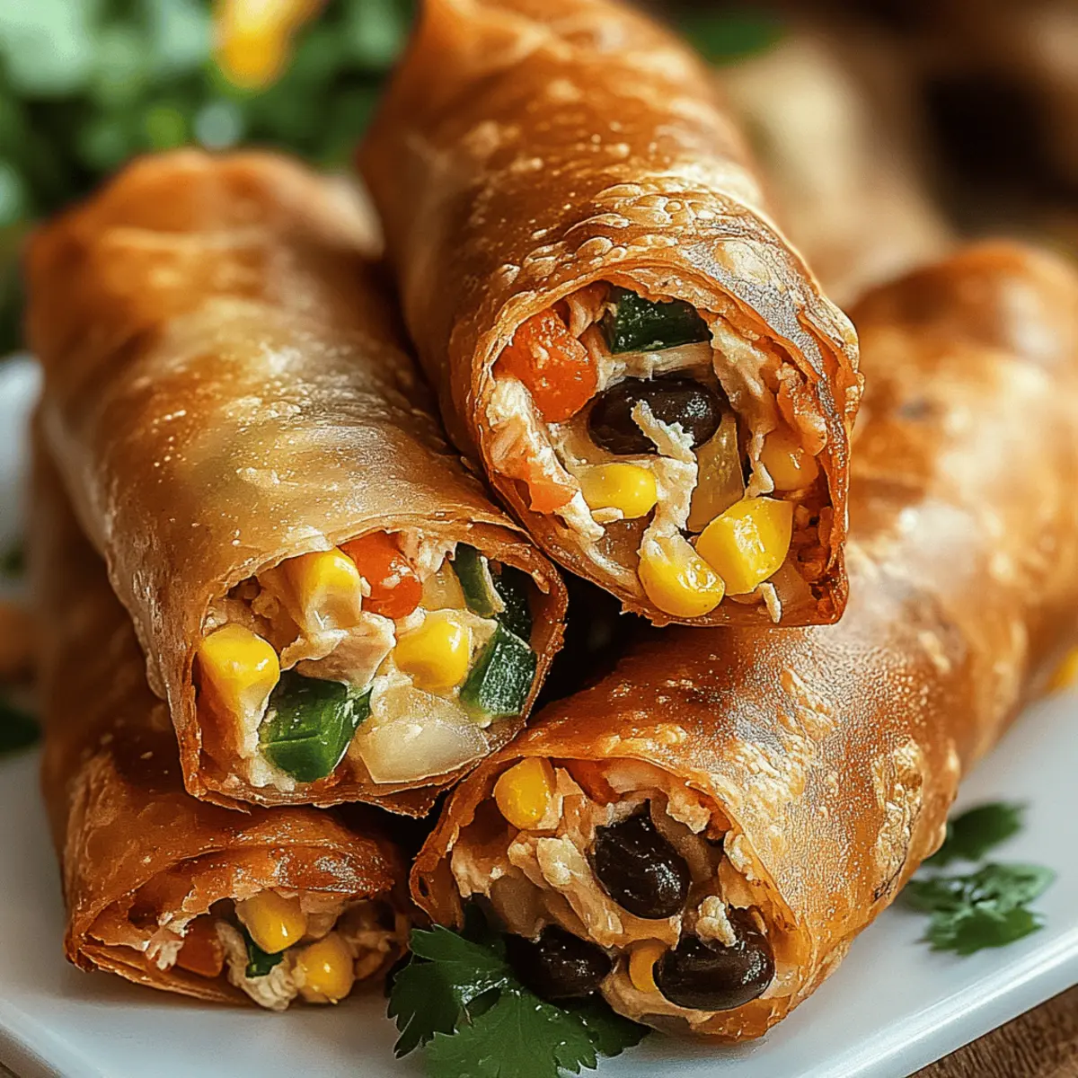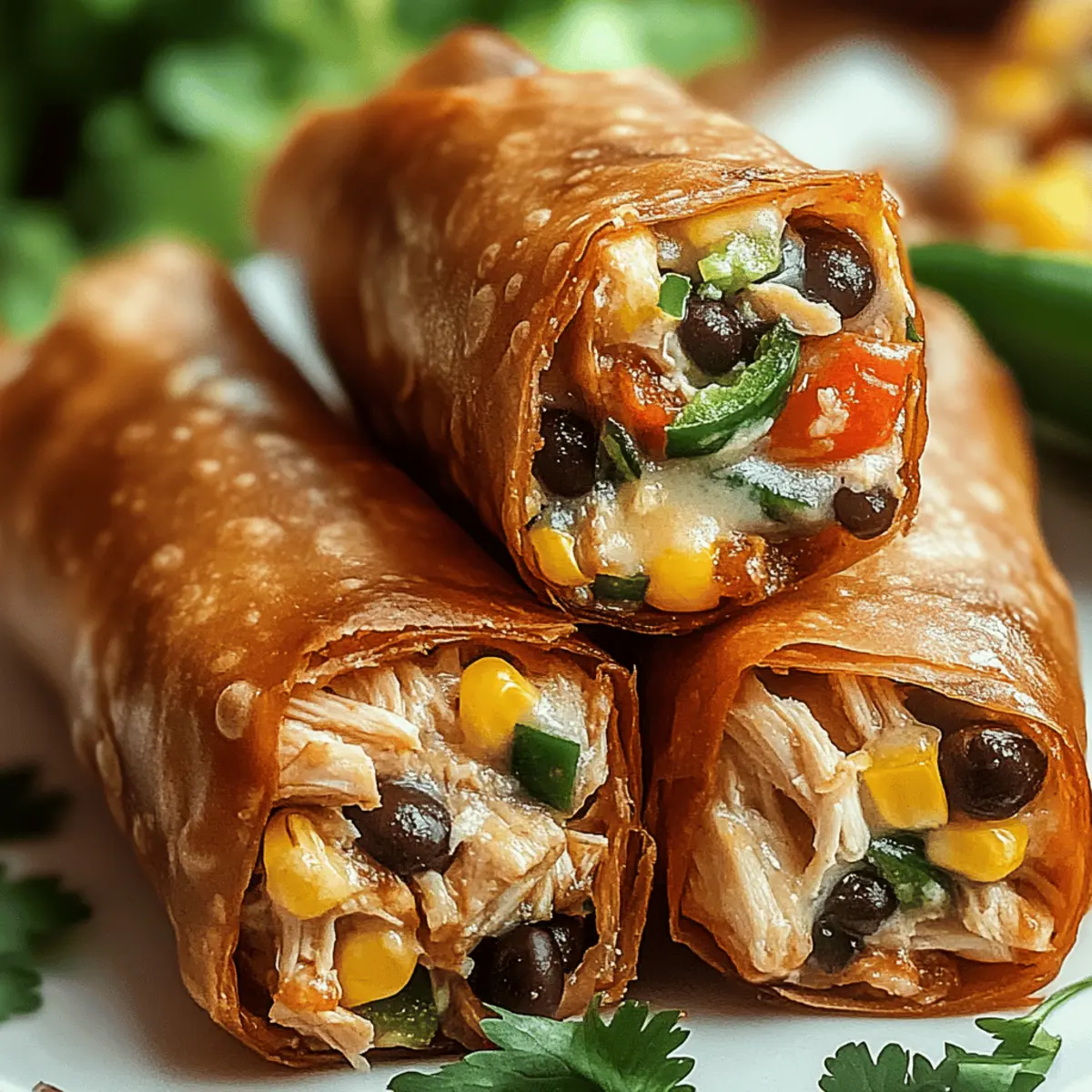 Jump to Recipe Print RecipeCaught in a snack dilemma? You’re not alone! Say goodbye to the mundane and welcome the fiesta of flavors with these Southwest Chicken Egg Rolls. With tender shredded chicken, savory black beans, and a medley of vibrant vegetables all wrapped in a crispy shell, this easy appetizer is perfect for any gathering—or even a cozy night in. Not only do they boast customizable ingredients that fit any taste, but they also cater to your busy schedule with quick prep and cooking options like frying or baking. Imagine serving these crunchy delights at your next taco night or game day party, leaving your friends and family raving for more. What dipping sauce will you pair with your egg rolls: spicy salsa or creamy guacamole? Let’s get cooking! Why Are These Egg Rolls So Popular? Crispy Perfection: These Southwest Chicken Egg Rolls boast a golden, crunchy exterior that perfectly encases a flavorful filling. Endless Customization: You can easily swap ingredients to fit your dietary needs. Whether you’re opting for shredded turkey or a veggie-packed option, these rolls have you covered. Quick to Prepare: With minimal prep time, you’ll have these delicious appetizers ready in no time. Bake or fry them, whichever suits your schedule! Crowd-Pleasing Delight: Perfect for get-togethers, these bite-sized wonders will impress family and friends, making them a go-to for party snacks. Flavor Explosion: Enjoy a delectable combination of savory chicken, beans, and spices that deliver a satisfying taste in every bite. Pair them with dips like salsa or guacamole for the ultimate experience. These Cowboy Butter Chicken and Butter Chicken Comfort recipes are perfect side companions for your delicious egg rolls! Southwest Chicken Egg Rolls Ingredients For the Filling • Shredded Chicken – Provides protein and bulk; use leftover or rotisserie chicken for convenience. • Black Beans – Adds fiber and a savory earthiness; canned beans are easy to use—just rinse before adding. • Corn – Brings sweetness and texture; use canned or thawed frozen corn for best results. • Chopped Jalapeño – Adds a fresh kick; customize the amount to fit your heat preference. • Red Bell Pepper – Contributes sweetness and vibrant color; substitute with any sweet pepper if desired. • Spinach – Offers nutrients and vibrant color; feel free to swap with kale or other greens. • Black Pepper, Chili Powder, Salt, Cumin – These spices enhance flavor depth; adjust to your taste for the ideal seasoning. • Monterey Jack Cheese – Melts wonderfully, keeping the filling together; cheddar or pepper jack are great alternatives. For the Wrapping • Egg Roll Wrappers – Provide the delicious outer layer; ensure they’re covered when not in use to keep them fresh. These delightful Southwest Chicken Egg Rolls are all about vibrant flavors and satisfying crunch—your gateway to a fun and easy appetizer! Step‑by‑Step Instructions for Southwest Chicken Egg Rolls Step 1: Cook Chicken If you’re starting with raw chicken, cook it using your preferred method—grilling or baking at 375°F (190°C) for 25–30 minutes works well. Once fully cooked, allow the chicken to rest for a few minutes, then shred it with two forks until you have tender pieces ready to incorporate into the southwest chicken egg rolls. Step 2: Prepare Filling In a large mixing bowl, combine the shredded chicken, rinsed black beans, corn, chopped jalapeño, diced red bell pepper, and spinach. Sprinkle in your chosen spices: black pepper, chili powder, salt, and cumin. Add the Monterey Jack cheese to the mix and stir everything together until all the ingredients are evenly blended and coated with spices. Step 3: Assemble Egg Rolls Lay an egg roll wrapper in a diamond shape in front of you. Using a spoon, add 2–3 tablespoons of the filling near the center of the wrapper. Fold in the sides, then roll it tightly from the bottom to the top, sealing the edge with a little water or egg wash. Repeat this process with the remaining wrappers and filling until you’ve made as many southwest chicken egg rolls as desired. Step 4: Cooking Options For frying, heat about 1 inch of vegetable oil in a large pan over medium heat. Carefully add the filled egg rolls and fry for about 3–4 minutes per side, until they are golden brown and crispy. Alternatively, for baking, preheat your oven to 400°F (200°C), brush each egg roll with a little oil, and place them on a baking sheet. Bake for 12–15 minutes, flipping halfway, until golden and crunchy. Step 5: Serve Once your southwest chicken egg rolls are cooked, allow them to cool slightly on a paper towel-lined plate to absorb excess oil (if fried). Serve these delightful rolls warm, accompanied by your favorite dipping sauces like salsa or guacamole for a delicious flavor combination that will surely impress your guests! Southwest Chicken Egg Rolls Variations Feel free to explore these delightful adjustments to make your egg rolls uniquely yours, bringing extra joy to every bite. Ground Meat: Swap shredded chicken for ground beef, turkey, or shrimp for a different protein experience. Each option brings a new flavor twist! Vegetarian Delight: For a meatless version, simply omit the chicken and load up on more colorful veggies or add tofu for texture and protein. Bean Swap: Replace black beans with pinto beans or even lentils to change the flavor profile and increase fiber content. Spicy Kick: Amp up the heat by adding diced serrano peppers or a splash of hot sauce to your filling. Feel the fiery flavors ignite! Cheese Variety: Try different cheeses like pepper jack for added spice or feta for a tangy twist that complements the stuffing beautifully. Herb Infusion: Incorporate fresh herbs like cilantro or parsley for an aromatic lift that enhances every bite, giving your rolls a fragrant surprise. Crispy Coating: For an added crunchy layer, roll your egg rolls in crushed tortilla chips or pa