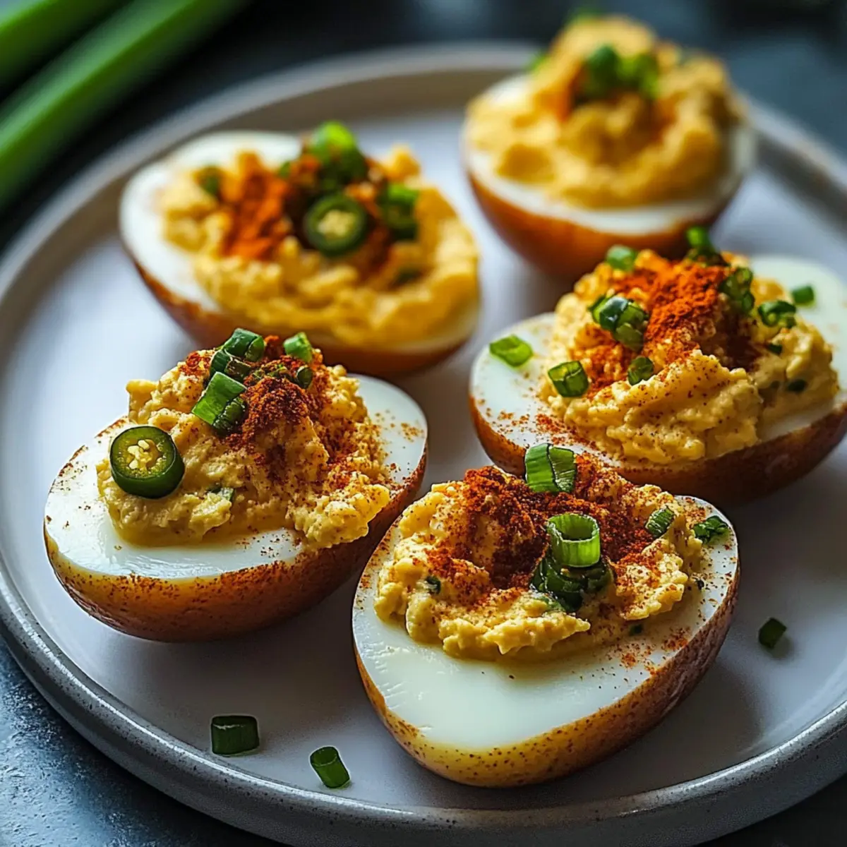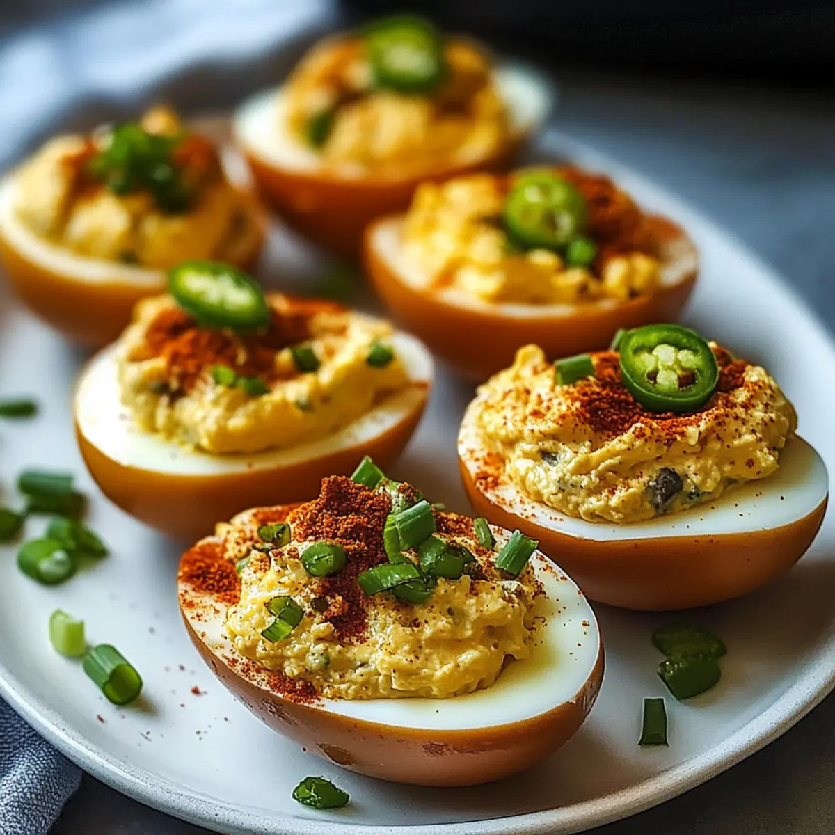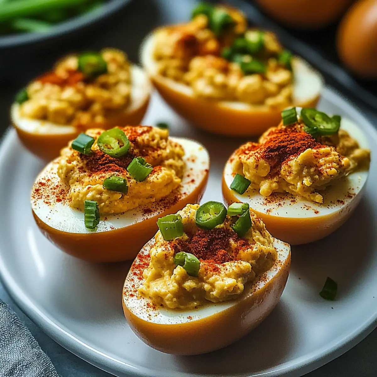 Jump to Recipe Print RecipeThe lively chatter at the picnic was drowned out by the sudden realization I had forgotten the appetizers. Just as panic threatened to set in, I remembered my secret weapon: Spicy Bayou Deviled Eggs. With their Southern-inspired flair and a delightful kick of heat, these creamy bites are not only a hit at any gathering but also incredibly quick and easy to whip up. Offering a customizable twist, you can adjust the heat to suit all palates, whether you prefer them spicy or mild. Perfect for parties, game days, or a cozy family brunch, these deviled eggs promise to elevate your spread and dazzle guests. Are you ready to add some zing to your next gathering? Why Are These Deviled Eggs Irresistible? Bold and Spicy: These Spicy Bayou Deviled Eggs pack a flavor punch, combining the creamy decadence of traditional deviled eggs with a zesty Southern twist that’ll have your taste buds dancing! Customizable Heat: Adjust the Cajun seasoning and cayenne pepper to suit your guests’ preferences, making these treats as mild or wild as you desire. Easy Preparation: Quick to make, you can whip up a batch in under 30 minutes, giving you more time to enjoy the party atmosphere. Perfect for Any Occasion: Whether it’s a festive holiday gathering or game day, these appetizers are sure to impress and disappear fast! Crowd-Pleasing Comfort Food: With their savory, creamy filling and delightful crunch from fresh ingredients, these deviled eggs are a sure-fire hit. For more exciting bites, check out Hot Honey Chicken or try pairing them with Mexican Potatoes Spicy for a feast! Spicy Bayou Deviled Eggs Ingredients For the Filling • 6 large eggs – Use older eggs (7-10 days) for easier peeling. • 2 tablespoons mayonnaise – Adds creaminess; substitute with avocado oil-based mayo for a Paleo-friendly option. • 1 teaspoon Dijon mustard – Provides tangy flavor; yellow mustard works for milder taste. • 1 teaspoon apple cider vinegar – Enhances tanginess and balances out flavors. • 1/2 teaspoon Cajun seasoning – Delivers bold, spicy flavor; adjust based on heat preference. • 1/4 teaspoon smoked paprika – Contributes a smoky depth to the filling. • 1/8 teaspoon cayenne pepper – Adds a spicy kick; adjust to match your taste. • 2 tablespoons finely chopped celery – Introduces a nice crunch; substitute with bell pepper for sweetness. • 1 tablespoon finely chopped green onion – Adds a fresh note to the filling. • Salt and pepper to taste – Essential for enhancing overall flavor. • Optional: a few dashes of hot sauce – For those who like a bit of extra heat! For Garnishing • Sliced jalapeños – Adds an eye-catching and flavorful kick. • Extra green onions – Brightens the presentation and flavor. • Parsley – A fresh garnish that complements the dish beautifully. Step‑by‑Step Instructions for Spicy Bayou Deviled Eggs Step 1: Boil the Eggs Start by placing the 6 large eggs in a medium saucepan, then cover them with cold water, ensuring there’s about an inch of water above the eggs. Heat the saucepan over medium heat until it reaches a vigorous boil, approximately 10 minutes. Once boiling, cover the saucepan with a lid, remove it from heat, and let the eggs sit for 10-12 minutes for perfect hard-boiled eggs. Step 2: Prepare the Ice Bath While the eggs are sitting, prepare an ice bath by filling a large bowl with ice and cold water. Once the resting time is complete, carefully transfer the eggs to the ice bath using a slotted spoon. Allow them to chill for at least 5 minutes to halt cooking and make peeling easier. Step 3: Peel and Halve the Eggs Once chilled, gently tap the eggs on a hard surface to crack the shells, and then peel them under running water to help remove any stubborn bits. After peeling, slice each egg in half lengthwise. Carefully scoop out the yolks into a mixing bowl, leaving the egg whites intact to become vessels for your Spicy Bayou Deviled Eggs. Step 4: Mash the Yolks and Mix Ingredients Using a fork, mash the yolks until crumbled, then blend in 2 tablespoons of mayonnaise, 1 teaspoon of Dijon mustard, 1 teaspoon of apple cider vinegar, 1/2 teaspoon Cajun seasoning, 1/4 teaspoon smoked paprika, and 1/8 teaspoon cayenne pepper. Mix together until you achieve a smooth and creamy filling, adjusting flavors as needed with salt, pepper, and a dash of hot sauce if desired. Step 5: Fold in Fresh Ingredients Gently fold in 2 tablespoons of finely chopped celery and 1 tablespoon of finely chopped green onion into the yolk mixture. This adds delightful crunch and freshness to your filling. Take a moment to taste the mixture once again, adjusting seasoning and spice levels to suit your personal preference for these Spicy Bayou Deviled Eggs. Step 6: Fill the Egg Whites Using either a spoon or a piping bag, carefully fill the hollows of the egg whites with the yolk mixture prepared earlier. If using a piping bag, you can create appealing swirls that elevate the presentation of your Spicy Bayou Deviled Eggs. Don’t worry about perfection; it’s all about that delicious taste! Step 7: Garnish and Serve Finally, take your deviled eggs to the next level by garnishing them with a sprinkle of smoked paprika, sliced jalapeños, or an extra sprinkle of green onions for a fresh finish. Serve the Spicy Bayou Deviled Eggs immediately, or let them chill in the refrigerator for 30 minutes to meld those amazing flavors even further. Enjoy! How to Store and Freeze Spicy Bayou Deviled Eggs Fridge: Store any leftovers in an airtight container for up to 2 days. This keeps them fresh and prevents them from absorbing other food odors. Freezer: It’s best not to freeze Spicy Bayou Deviled Eggs as the texture of the filling can change upon thawing, leading to a watery mess. Reheating: If serving leftover eggs, enjoy them chilled or at room temperature, as reheating can alter their creamy goodness. Airtight Tips: Always ensure the container is well