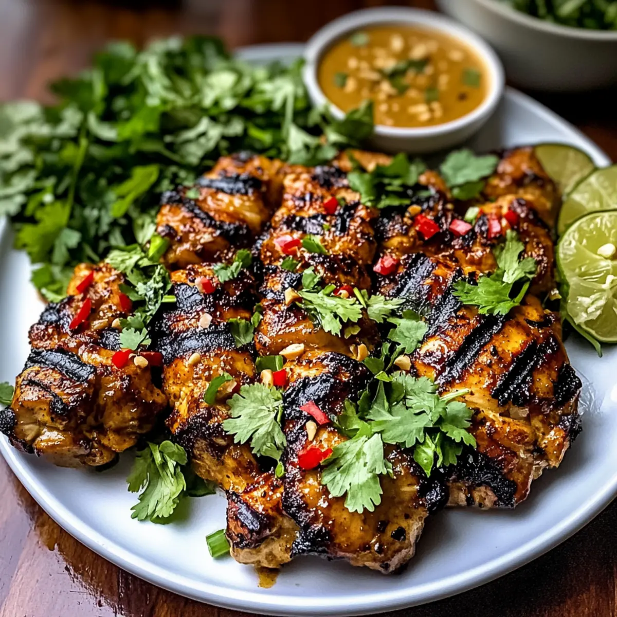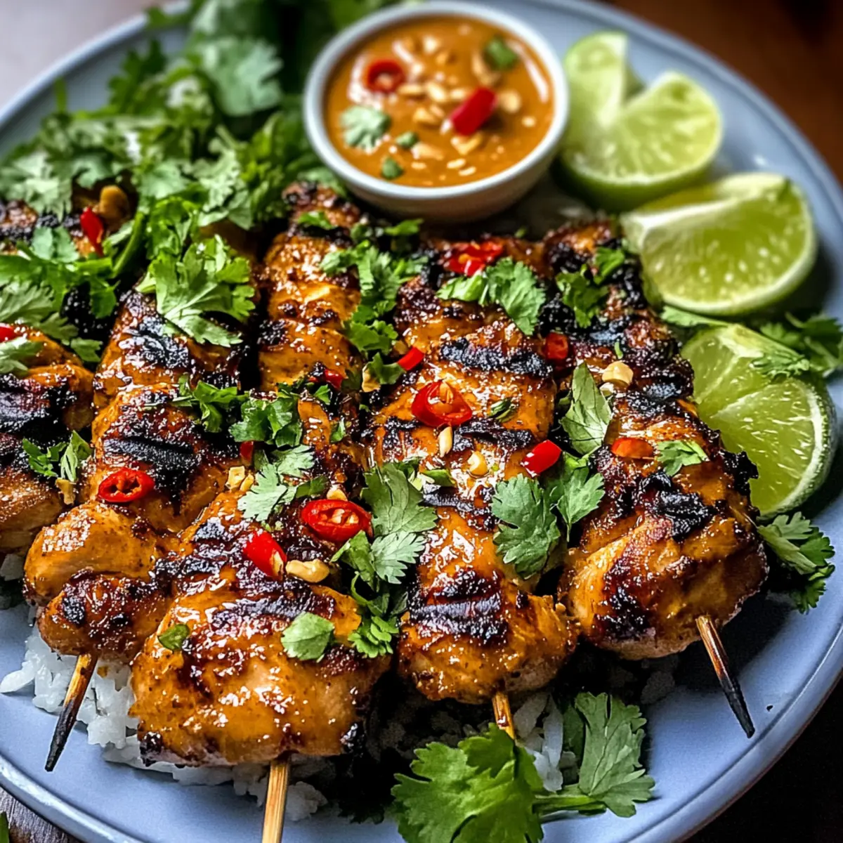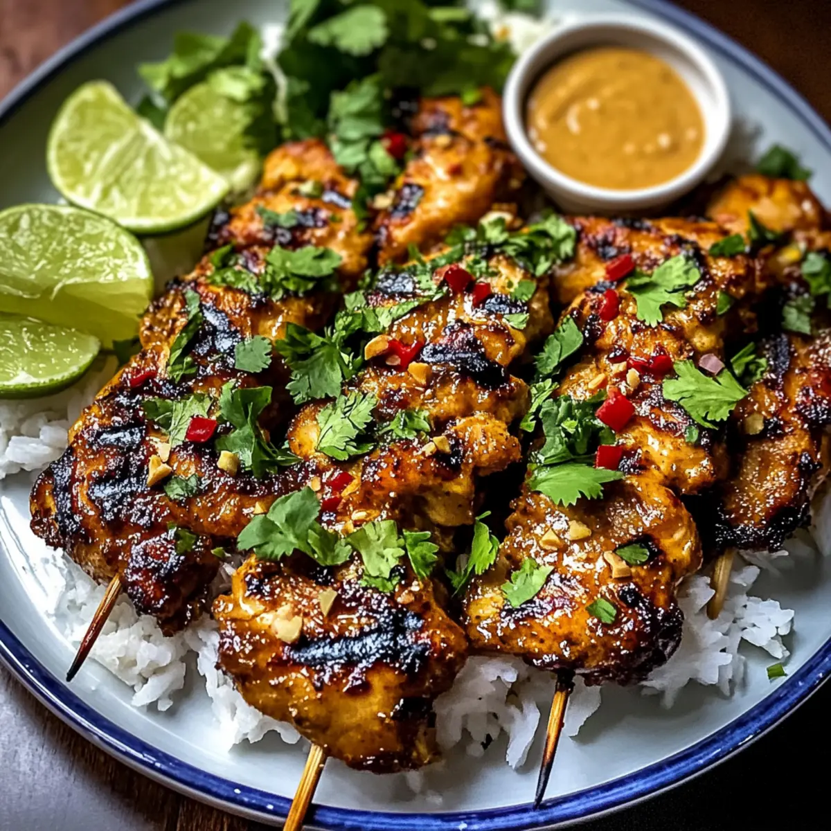 Jump to Recipe Print RecipeThe sizzle of marinated chicken hitting a hot grill always promises something special. Today, we’re taking that excitement up a notch with my Spicy Thai Grilled Peanut Chicken Skewers. This recipe is perfect for beginner cooks looking to impress guests or simply treat themselves to something extraordinary during the week. With just a two-hour marinade time, you can whip up tender chicken thighs drenched in a creamy peanut sauce that caramelizes to perfection. Not only are these skewers a colorful addition to any dinner table, but they also offer the convenience of a quick prep—ideal for bustling weeknights or lazy weekend gatherings. Are you ready to take your grilling game to the next level? Let’s dive into the flavorful world of these irresistible skewers! Why Are Thai Chicken Skewers So Popular? Irresistible Flavors: Each skewer is packed with a mouthwatering blend of savory peanut sauce, zesty lime, and aromatic spices that create an unforgettable taste experience. Quick and Easy: With just a two-hour marinade, you can transform simple chicken thighs into an enticing dish—perfect for weeknight dinners or casual get-togethers. Versatile Pairings: Serve these skewers with fragrant jasmine rice or rice noodles for a complete meal. Looking for more ideas? Try pairing them with Chicken Broccoli Sizzling for a delightful twist! Crowd-Pleasing Appeal: Whether you’re hosting a barbecue or enjoying a quiet dinner, everyone will love these tender, juicy skewers that please even the pickiest eaters. Beginner-Friendly: You don’t need to be a culinary expert to impress; these flavorful skewers make cooking fun and accessible for all skill levels! Spicy Thai Grilled Peanut Chicken Ingredients • For the Marinade Chicken Thighs – Tender protein base; can substitute with chicken breasts, but they may dry out more easily. Soy Sauce – Adds umami and saltiness; ensure you use gluten-free for a gluten-free option. Fish Sauce – Provides a deep savory flavor; optional for strict vegetarians. Lime Juice – Adds acidity and brightness; freshly squeezed is best! Brown Sugar – Balances heat with sweetness; alternatives include honey or maple syrup. Ground Chili Paste – Supplies heat and depth; adjust to taste for your desired spiciness level. Minced Garlic – Enhances aromatic flavor; fresh garlic is recommended for potency. Minced Ginger – Contributes warmth and spice; fresh ginger is ideal for robust flavor. • For the Sauce Peanut Butter – Forms the base of the creamy sauce; can substitute with almond butter for variation. Coconut Milk – Creates a rich sauce texture; opt for light coconut milk for a lower-calorie option. • For Garnishing Cilantro – Fresh herb to enhance flavor; optional for garnish. Get ready to grill up some mouthwatering Spicy Thai Grilled Peanut Chicken skewers that are bound to impress! Step‑by‑Step Instructions for Spicy Thai Grilled Peanut Chicken Skewers Step 1: Prepare the Marinade In a large mixing bowl, combine soy sauce, fish sauce, lime juice, brown sugar, and ground chili paste, mixing thoroughly until the sugar dissolves. This rich marinade infuses the chicken with flavor, so take a moment to ensure it’s well blended and fragrant. Step 2: Add Aromatics Stir in minced garlic, grated ginger, and chopped cilantro into the marinade, integrating the fresh herbs and spices for added depth. With colors and aromas coming together, your marinade is now ready to elevate your Spicy Thai Grilled Peanut Chicken skewers. Step 3: Marinate the Chicken Add the chicken thighs to the marinade, ensuring they are entirely coated. Cover the bowl tightly with plastic wrap or transfer to a resealable bag, letting it rest in the refrigerator for at least two hours—or even overnight for deeper flavor. Step 4: Whisk the Peanut Sauce In a separate bowl, whisk together peanut butter and coconut milk until smooth and creamy. Adjust the consistency if needed by adding a little more coconut milk, then set the sauce aside so it’s ready for basting during grilling. Step 5: Preheat the Grill Preheat your grill to medium-high heat, aiming for a temperature of around 400°F. This will create the perfect searing environment for the skewers, ensuring they cook through while developing a gorgeous caramelized crust. Step 6: Skewer the Chicken Remove the marinated chicken from the refrigerator and thread it onto skewers, leaving some space between pieces for heat circulation. The skewered chicken should look vibrant and well-coated with the marinade, setting the stage for delightful grilling. Step 7: Grill the Skewers Place the chicken skewers on the hot grill and cook for 5–7 minutes on each side. You want to achieve a golden-brown exterior while ensuring the chicken reaches an internal temperature of 165°F for safe consumption. Step 8: Baste with Peanut Sauce During the last few minutes of grilling, brush your prepared peanut sauce over the chicken skewers. The sauce will caramelize beautifully, enhancing the flavor of your Spicy Thai Grilled Peanut Chicken skewers while adding a lovely glossy finish. Step 9: Let Them Rest Once grilled to perfection, remove the skewers from the heat and let them rest for about 2 minutes. This brief resting period allows the juices to redistribute, keeping your chicken tender and delicious. Step 10: Serve and Enjoy Serve the skewers hot, drizzled with any remaining peanut sauce and garnished with fresh cilantro for a burst of color. Pair them with jasmine rice or your choice of side to create a delightful meal that’s sure to impress everyone at your table. How to Store and Freeze Spicy Thai Grilled Peanut Chicken Fridge: Place any leftover skewers in an airtight container in the refrigerator for up to 3 days; this keeps the flavors fresh while maintaining the chicken’s juiciness. Freezer: For longer storage, wrap the cooled skewers tightly in plastic wrap and then in aluminum foil, freezing them for up t