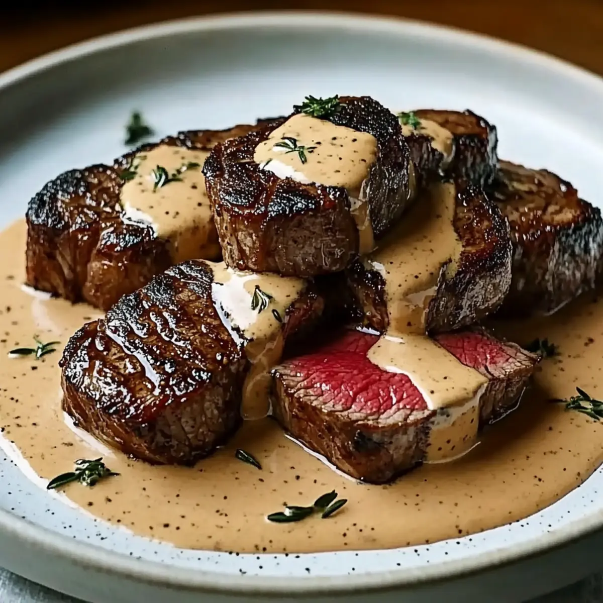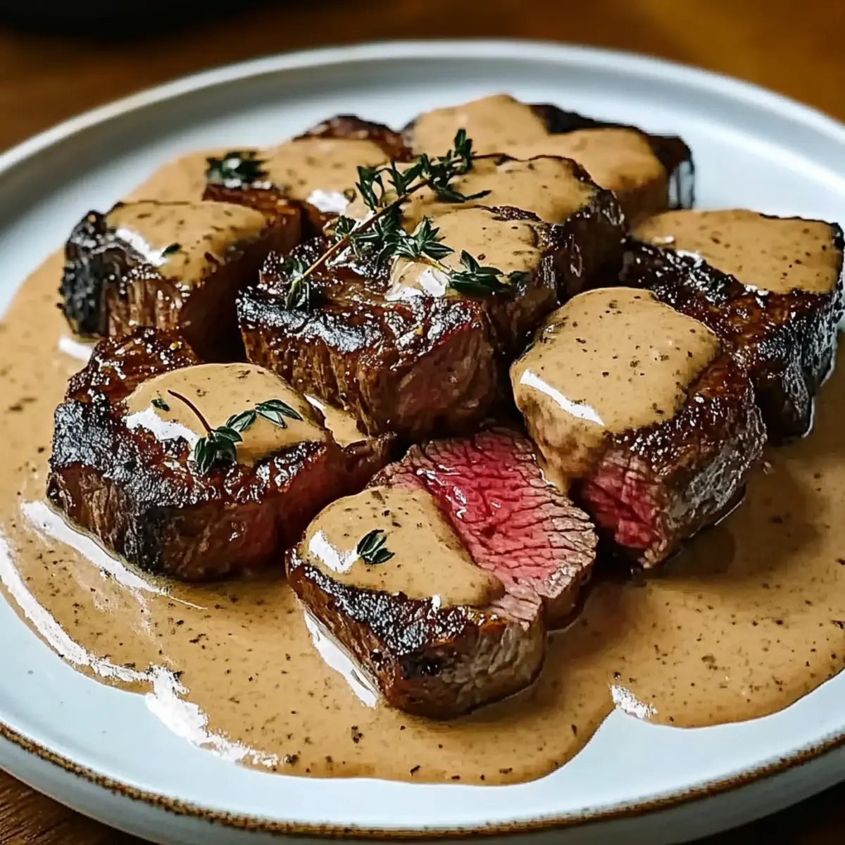 Jump to Recipe Print RecipeThe first bite of a perfectly cooked steak can take you on a journey, one that feels like a warm embrace after a long day. In my kitchen, the aroma of bourbon and garlic sizzling together creates anticipation you can’t resist. My Steak with Bourbon Garlic Cream Sauce is more than just a dinner; it’s an experience that transforms a simple evening into something unforgettable. Not only is this dish incredibly indulgent with its creamy, rich flavors, but it’s also a crowd-pleaser, perfect for impressing friends or spicing up a cozy night in. Whether you’re looking to elevate your culinary skills or just treat yourself to a hearty meal, this recipe will guide you through every sear and simmer. Are you ready to dive into the richness of this delightful dish? Why is this steak recipe a must-try? Indulgent, Rich Flavors: This dish showcases a heavenly combination of bourbon and garlic that elevates your steak to new heights. Simple Preparation: With easy-to-follow steps, you’ll feel confident mastering this recipe, regardless of your cooking skills. Perfect for Gatherings: Whether it’s a dinner party or a cozy date night, this steak with bourbon garlic cream sauce is sure to impress. Versatile Pairings: Serve it with creamy mashed potatoes or a fresh garden salad; it complements any side beautifully. Leftover Heaven: Enjoy the depth of flavor as the sauce marries with the steak in your fridge, making leftovers just as delightful. Elevate your dinner game today with my Garlic Butter Steak right alongside this enticing bourbon-infused creation! Steak with Bourbon Garlic Cream Sauce Ingredients For the Steak • Ribeye or Filet Mignon Steaks – Choose about 1 inch thick for optimal tenderness and flavor. For the Sauce • Garlic (4 cloves, minced) – Adds aromatic depth and flavor that enhance the steak. • Bourbon (¼ cup) – Provides rich, complex flavors; opt for a high-quality brand for the best impact. • Heavy Cream (1 cup) – Creates a rich, velvety sauce; light cream can be a delicious substitute. • Beef Broth (½ cup) – Adds savory depth, preferably low-sodium to balance the richness. • Dijon Mustard (2 tablespoons) – Offers a tangy kick that complements the sauce beautifully. • Worcestershire Sauce (1 tablespoon) – Enhances umami flavors giving the dish an extra boost. • Salt & Pepper – Essential to season according to personal taste. This delightful Steak with Bourbon Garlic Cream Sauce is bound to become a favorite in your home! Step‑by‑Step Instructions for Steak with Bourbon Garlic Cream Sauce Step 1: Rest the Steaks Begin by removing your ribeye or filet mignon steaks from the fridge, allowing them to rest and reach room temperature for about 20 minutes. This vital step helps ensure even cooking throughout the steak, resulting in a juicy, tender bite. While you wait, gather your ingredients and a heavy skillet for the next steps. Step 2: Sear the Steaks Heat your heavy skillet over medium-high heat, adding a drizzle of oil once it’s hot. Carefully place the steaks in the skillet, searing for 4 to 5 minutes per side until a delightful crust forms. Look for a rich brown color on the steak surface – this is where the flavor develops. Step 3: Check Doneness Use a meat thermometer to check the internal temperature of the steaks. Aim for 130°F for medium-rare or 140°F for medium. If your steaks haven’t reached the desired doneness, continue cooking, checking every minute to avoid overcooking. Step 4: Rest After Cooking Once at the desired temperature, carefully remove the steaks from the skillet and transfer them to a cutting board. Let them rest for about 5 minutes; this resting period allows the juices to redistribute throughout the meat, enhancing the flavor and tenderness of your Steak with Bourbon Garlic Cream Sauce. Step 5: Sauté the Garlic In the same skillet, lower the heat to medium and add your minced garlic, sautéing for about 30 seconds. Stir frequently until the garlic becomes fragrant and slightly golden, releasing its rich aroma. Be careful not to let it burn, as burnt garlic can turn bitter. Step 6: Add Bourbon Pour in the bourbon, scraping the bottom of the skillet with a wooden spoon to deglaze and lift any flavorful bits stuck to the pan. Allow the bourbon to simmer for about 1 minute, letting the alcohol cook off and concentrate the rich flavors, creating a perfect base for your sauce. Step 7: Combine Sauce Ingredients Now stir in the heavy cream, beef broth, Dijon mustard, and Worcestershire sauce. Allow the mixture to come to a gentle simmer, cooking for about 2 minutes until the sauce thickens slightly. You’ll notice a creamy texture and savory aroma filling your kitchen, enhancing your Steak with Bourbon Garlic Cream Sauce. Step 8: Slice the Steaks After resting, slice the steak into thick, even pieces against the grain. This technique will ensure each bite is tender and easy to chew, showcasing the steak’s juicy interior and flavorful crust perfectly. Step 9: Serve and Enjoy To serve, arrange the sliced steak on plates and generously drizzle the bourbon garlic cream sauce over the top. Pair with your favorite sides, such as creamy mashed potatoes or roasted vegetables, to complement your indulgent Steak with Bourbon Garlic Cream Sauce and elevate your dining experience. Storage Tips for Steak with Bourbon Garlic Cream Sauce Fridge: Store leftovers in an airtight container for up to 3 days. The flavors of the Steak with Bourbon Garlic Cream Sauce improve as they meld together in the refrigerator. Freezer: For longer storage, freeze the sauce separately from the steak in airtight containers. Both can last for up to 2 months, preserving their rich flavors. Reheating: When ready to enjoy leftovers, thaw in the fridge overnight. Reheat gently on the stove over low heat until warmed through, taking care not to overcook the steak. Reassembly: If the sauce has thickened after freezing, consider