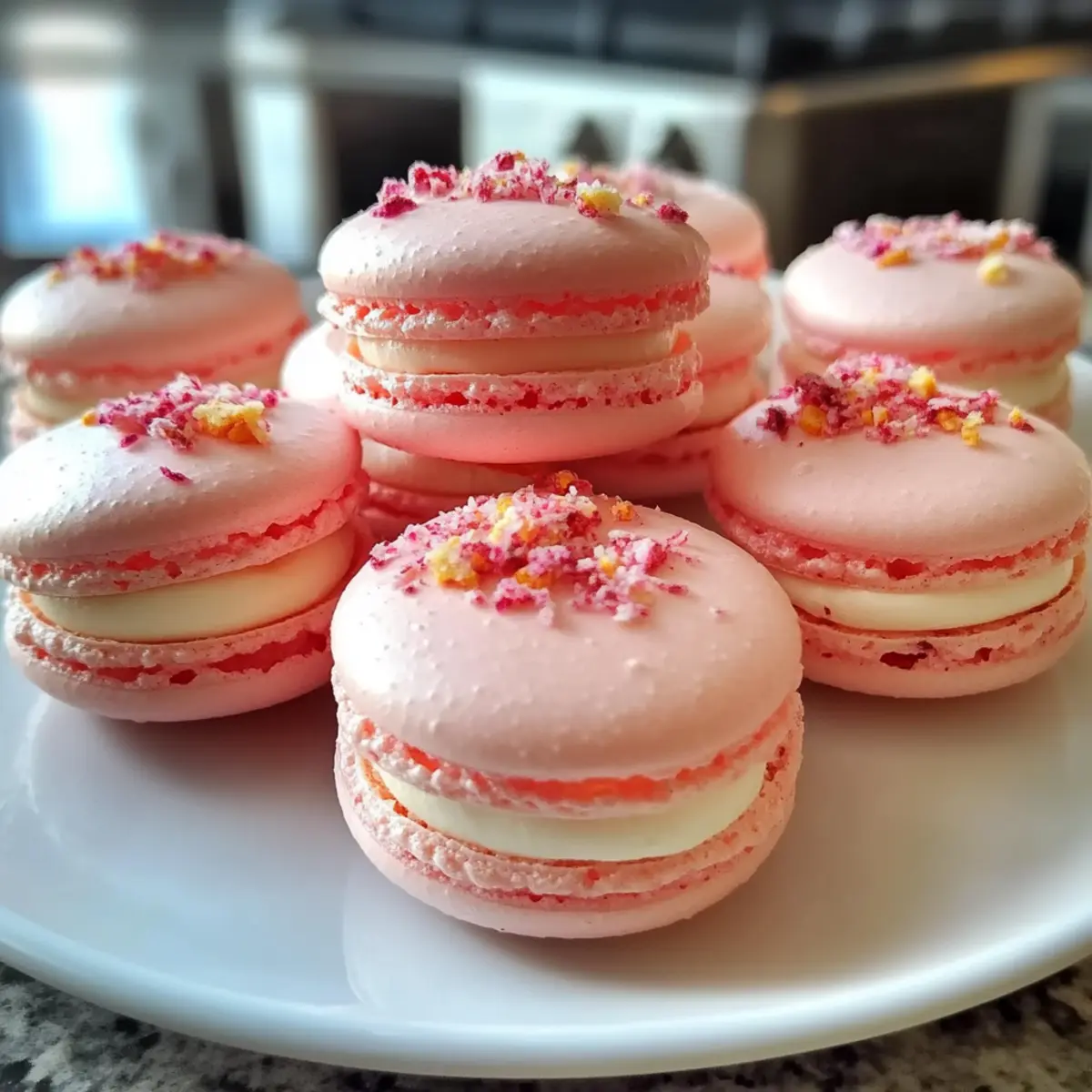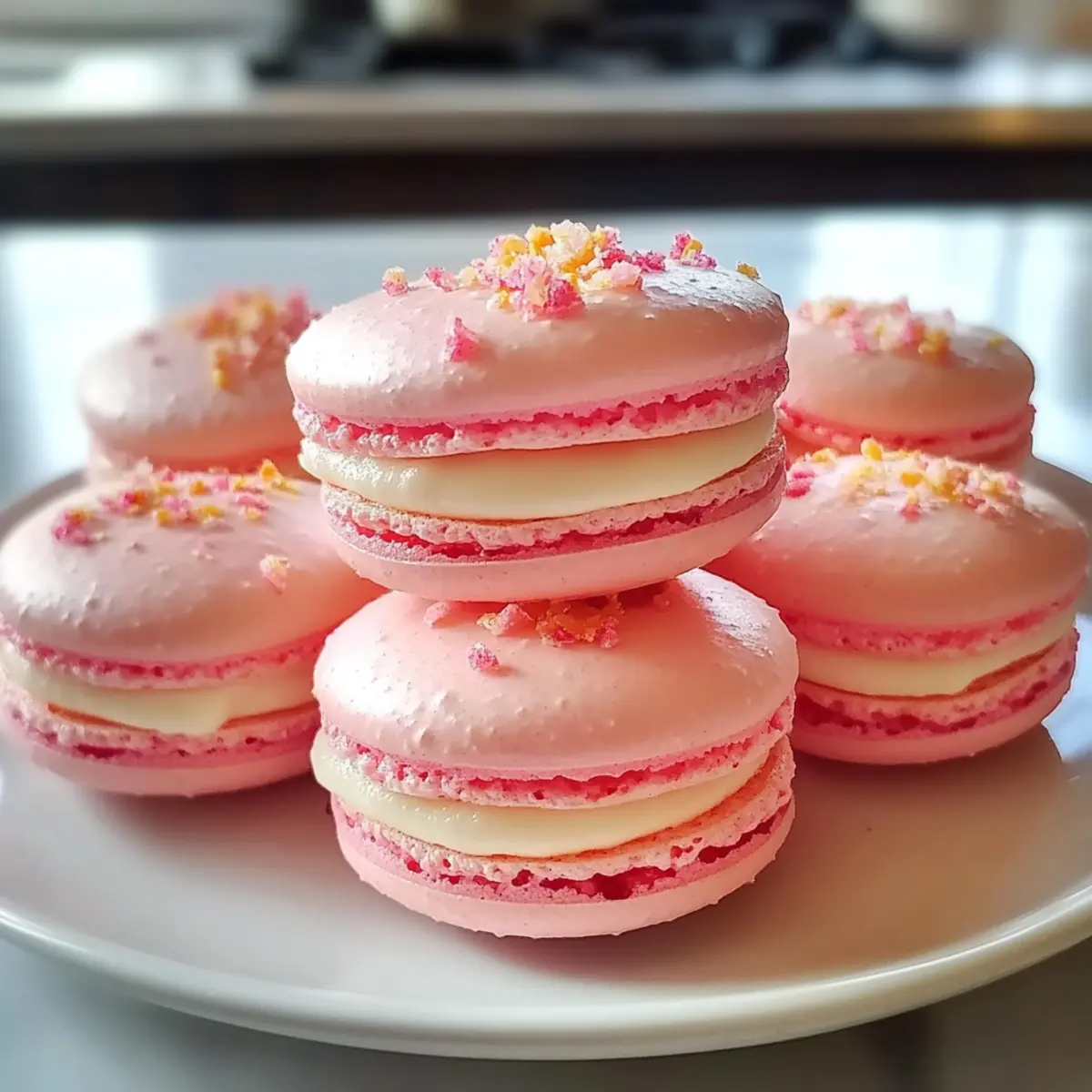 Jump to Recipe Print RecipeAs I rummaged through my kitchen, the scent of fresh strawberries summoned delightful memories of sunny picnics and homemade desserts. This is precisely how Strawberry Cheesecake Macarons came to life—an enchanting fusion of light, almond shells cradling a sumptuous cheesecake filling that dances on your palate. Not only are these vibrant treats a visual feast, but they also offer a healthier twist on traditional sweets, making them ideal for sharing at gatherings or savoring all by yourself. With their quick prep time, even novice bakers can impress friends and family alike. Are you ready to elevate your dessert game with this enchanting French pastry? Let’s dive in! Why Are Strawberry Cheesecake Macarons Special? Light, Fluffy Perfection: These macarons feature a delicate almond shell that perfectly contrasts the lush, creamy cheesecake filling. Impressive Presentation: With their vibrant pink hue and inviting texture, they are a show-stopper at any gathering, sure to attract compliments. Quick & Easy Preparation: Even if you’re a novice baker, this straightforward recipe makes it simple to create gourmet desserts at home. Versatile Flavor Profiles: Swap out strawberry for raspberry or lemon to explore different variations that satisfy every palate. Crowd-Pleasing Treat: Whether you serve them at parties or enjoy them with coffee, these macarons will be the sweet highlight of any occasion. For a delightful twist on flavors, don’t miss out on my Churro Cheesecake Indulge or try the refreshing Blueberry Cheesecake Bars for your dessert table! Strawberry Cheesecake Macaron Ingredients For the Macaron Shells • Almond Flour – Provides structure and a nutty flavor; if needed, substitute with finely ground hazelnut flour or sunflower seed flour. • Powdered Sugar – Adds sweetness and helps achieve a smooth texture; no direct substitution needed. • Egg Whites – Essential for structure and stability; use about 2 large eggs for best results. • Granulated Sugar – Sweetens and stabilizes the egg whites during whipping. • Cream of Tartar – Helps stabilize egg whites; can be omitted but is advised for optimal results. • Vanilla Extract – Enhances flavor depth; use pure extract for a superior taste. • Strawberry Extract – Vital for infusing strawberry flavor, crucial for the macaron’s cheesecake essence. • Pink Food Coloring – Optional; a few drops enhance visual appeal. For the Cheesecake Filling • Cream Cheese – Provides the rich, creamy texture needed for the filling; make sure it’s softened for easy mixing. • Butter – Ensures a smooth filling; use unsalted for better flavor control. • Powdered Sugar – Sweetens the filling; sift for a lump-free texture. • Strawberry Extract – Intensifies the flavor; a must for that delightful strawberry cheesecake taste. For Garnish • Freeze-Dried Strawberries – Adds a pop of color and a delightful crunch; optional but highly recommended for extra flair. Your delightful Strawberry Cheesecake Macarons await! Enjoy the ease of creating these heavenly treats that blend classic cheesecake flavor with elegant macaron craftsmanship. Happy baking! Step‑by‑Step Instructions for Strawberry Cheesecake Macarons Step 1: Preheat the Oven Begin by preheating your oven to 150°C (300°F) and preparing two baking sheets lined with parchment paper. This step is crucial as it ensures an even baking environment for your Strawberry Cheesecake Macarons. While the oven heats, gather your ingredients and equipment to streamline your preparation process. Step 2: Sift the Dry Ingredients In a mixing bowl, sift together the almond flour and powdered sugar thoroughly. This method removes lumps and ensures a fine texture for your macarons. Set this dry mixture aside, as achieving the right consistency is key to the success of these delightful Strawberry Cheesecake Macarons. Step 3: Whip the Egg Whites Using a clean mixing bowl, whip the egg whites and cream of tartar with an electric mixer on medium speed until foamy. Gradually add the granulated sugar, then increase the speed to high, whisking until stiff peaks form. This process should take around 5-7 minutes and is essential for creating the airy texture that makes macarons so delightful. Step 4: Add Flavors and Color Once your egg whites achieve stiff peaks, gently mix in the vanilla extract and strawberry extract. If you desire a vibrant look, add a few drops of pink food coloring as well. Be careful not to deflate the egg whites during this step, as they provide the structure for your Strawberry Cheesecake Macarons. Step 5: Combine Wet and Dry Ingredients Carefully fold the sifted almond flour and powdered sugar mixture into the whipped egg whites. Use a spatula to incorporate the dry ingredients in three additions, and stop when the batter flows like lava—smooth yet thick. This technique is vital to ensure your macaron shells have the perfect texture once baked. Step 6: Pipe the Macaron Shells Transfer the macaron batter into a piping bag fitted with a round tip. Pipe 3 cm circles onto the prepared baking sheets, leaving adequate space between each circle to allow for spreading. Achieving uniformity with your piping is key to the visual appeal of your Strawberry Cheesecake Macarons. Step 7: Rest the Macarons Allow the piped macarons to rest at room temperature for 30-60 minutes. During this time, they will form a skin that helps prevent cracking during baking. You’ll know they are ready when you can gently touch the surface without the batter sticking to your finger. Step 8: Bake the Macarons Place the baking sheets in the preheated oven and bake for 15-20 minutes. Rotate the sheets halfway through to ensure even baking. The macarons should rise and develop a firm shell that lightly holds its shape. Trust your senses; they will slightly puff up and develop a lovely sheen when they are done. Step 9: Cool Completely Once baked, remove the m