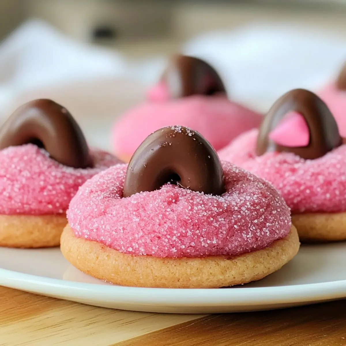 Delight in these Strawberry Kiss Cookies, featuring a charming pink hue and a chocolate surprise in the center.
