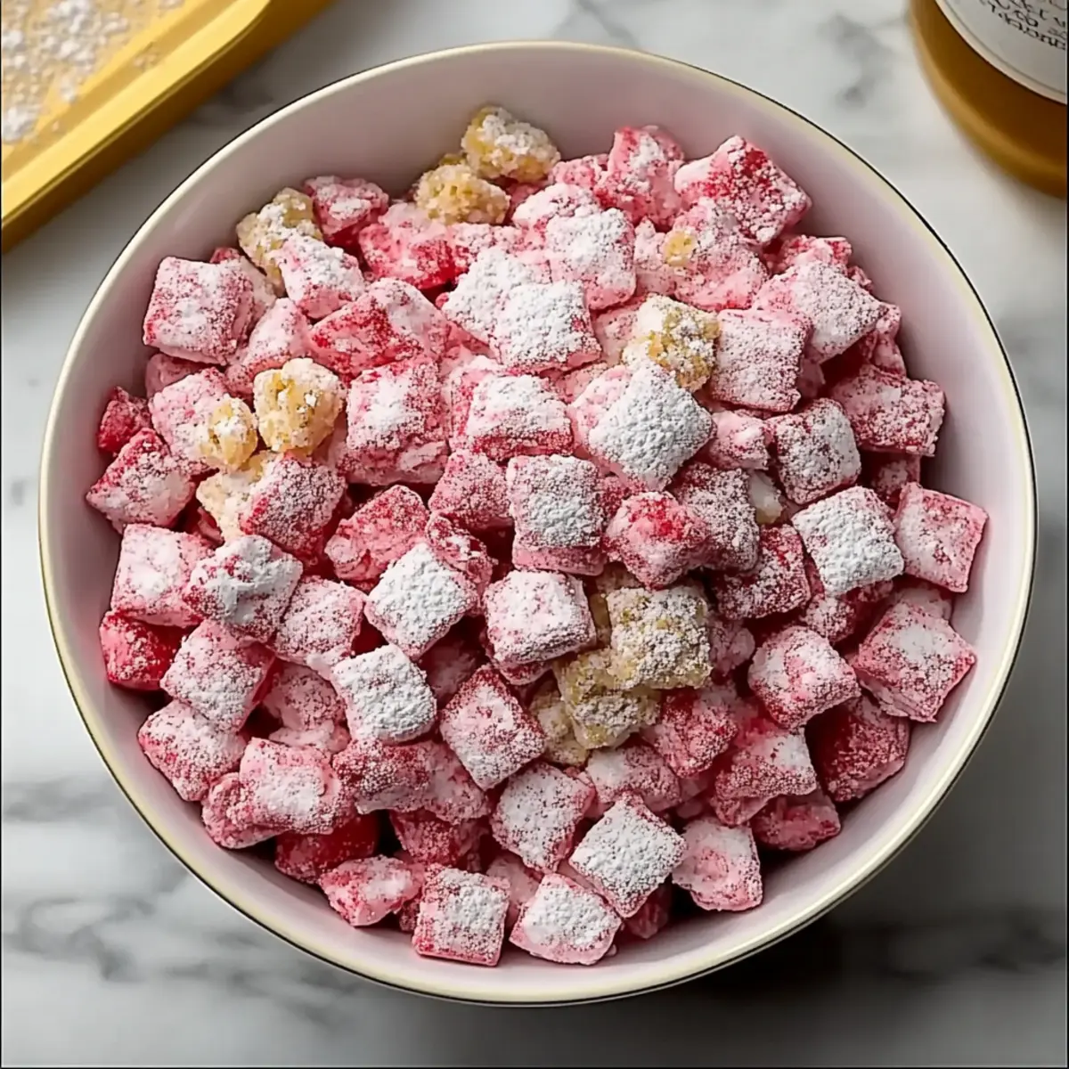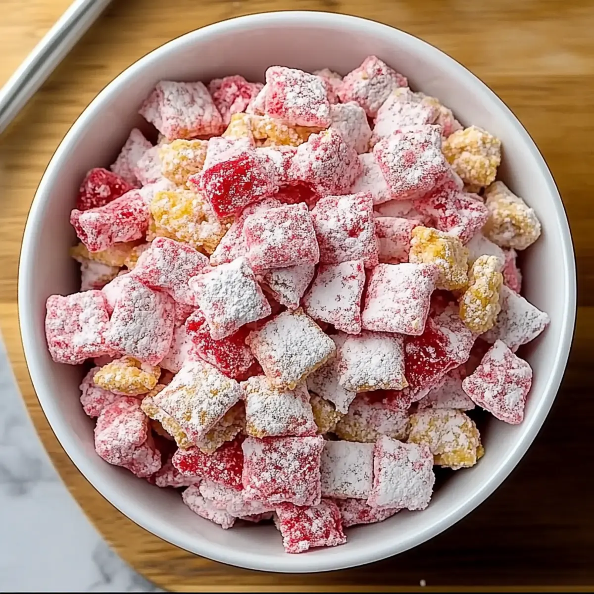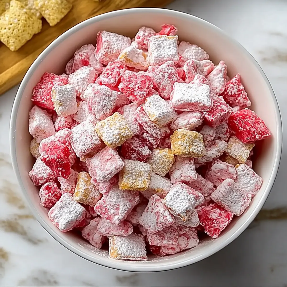 Jump to Recipe Print RecipeThere’s something magical about the combination of strawberries and cream that instantly takes me back to sun-soaked picnics and lazy summer days. Today, I’m excited to share a delicious twist on a classic treat—Strawberry Shortcake Puppy Chow. This no-bake delight mixes crunchy Rice Chex with smooth white chocolate and vibrant strawberry cake mix, creating a snack that’s not only tasty but incredibly easy to whip up. Perfect for parties or a simple afternoon treat, this recipe is both a crowd-pleaser and customizable to suit any preference. Plus, it’s gluten-free if you swap in the right cereal! Are you ready to dive into this playful and fruity world of flavors that will have you reminiscing about summer all year round? Why is this treat so delightful? No-Bake Ease: This Strawberry Shortcake Puppy Chow comes together without turning on the oven, making it perfect for warm days or last-minute cravings. Kid-Friendly Fun: With its colorful presentation and sweet flavor, both kids and adults will adore this treat—great for parties or snacks! Customizable Options: Feel free to swap and play with ingredients, like using gluten-free cereal or trying freeze-dried blueberries for a different twist. Quick to Prepare: You can whip this up in just a matter of minutes, so it’s an ideal recipe for busy days when you need something sweet. Perfect for Every Occasion: Whether for birthday parties, school events, or cozy movie nights, this treat is guaranteed to impress. For more delicious no-bake ideas, check out my Strawberry Spinach Salad or my creative Strawberry Shortcake Sushi! Strawberry Shortcake Puppy Chow Ingredients For the Cereal Base • Rice Chex cereal – Provides structure and crunch; you can substitute with gluten-free rice cereal for a gluten-free option. For the Creamy Coating • White chocolate chips – Adds sweetness and a creamy texture; melting wafers can make melting easier. • Butter – Richness and helps coat the cereal; try coconut oil for a dairy-free alternative. • Strawberry cake mix – Imparts fruity flavor and sweetness; opt for a gluten-free cake mix for dietary needs. • Vanilla extract – Enhances depth of flavor. For the Sweet Finish • Powdered sugar – Coats the mixture to add an irresistible sweet finish. • Freeze-dried strawberries – Offers a burst of fruity flavor; swap for dried blueberries or raspberries for a twist. Optional Add-ins • Mini marshmallows – Introduces a chewy texture; omit for a classic version or choose dairy-free marshmallows. • Crushed golden Oreos – Adds nostalgia and texture; use gluten-free Oreos to keep it gluten-free. Step‑by‑Step Instructions for Strawberry Shortcake Puppy Chow Step 1: Prepare the Cereal Base In a large mixing bowl, measure out 9 cups of Rice Chex cereal and set it aside to ensure it’s ready for coating. This crunchy base will provide the perfect texture for your Strawberry Shortcake Puppy Chow, so make sure the pieces are intact and not crushed. Step 2: Melt the Coating In a microwave-safe bowl, combine 1 cup of white chocolate chips and ¼ cup of butter. Microwave for 20-second intervals, stirring between each until the mixture is melted and smooth, about 1-2 minutes. You want a silky consistency for an even coating, so ensure no lumps remain before moving to the next step. Step 3: Mix in Flavor Enhancements Stir in 1 teaspoon of vanilla extract and 1 cup of strawberry cake mix into the melted chocolate mixture. Blend well until fully combined; the mixture should be a beautiful pink hue. This step is essential for bringing that signature strawberry flavor to your Strawberry Shortcake Puppy Chow. Step 4: Coat the Cereal Pour the creamy mixture over the prepared Rice Chex cereal. Gently fold the cereal into the coating, making sure every piece is evenly coated without crushing them. Take your time with this step, as a thorough coating ensures a delicious finish and takes around 2-3 minutes. Step 5: Sweet Coating Prep In a large zip-top bag, combine 1 cup of powdered sugar and ½ cup of crushed freeze-dried strawberries. Seal the bag, holding it closed tightly, and shake to mix evenly. This fragrant blend will give your Strawberry Shortcake Puppy Chow that delightful sweet finish, adding both flavor and texture. Step 6: Toss the Cereal Mixture Transfer the coated cereal to the zip-top bag with the powdered sugar mixture. Seal it back up and shake vigorously until all pieces are thoroughly coated in the sweet strawberry and sugar mix, which should take about 1-2 minutes. Ensure no clumps remain for a perfect final treat. Step 7: Cool Down Spread the coated Strawberry Shortcake Puppy Chow onto a baking sheet lined with parchment paper. This allows it to cool and dry, which takes about 15-20 minutes. It’s crucial not to skip this step, as it helps the coating set nicely and enhances the crunchiness of the snack. Step 8: Optional Add-ins Once cooled, if desired, mix in 1 cup of mini marshmallows and ½ cup of crushed golden Oreos. Fold gently to combine, adding extra fun textures to your Strawberry Shortcake Puppy Chow. This step is all about customization, so feel free to adjust the quantities as you prefer! Step 9: Store and Savor Transfer the final mix into an airtight container and store it at room temperature for up to one week. This tasty no-bake treat is perfect for sharing, and it’s best enjoyed within 5-7 days to maintain its crunch. Keep it handy for a delightful snack any time! Strawberry Shortcake Puppy Chow Variations Feel free to get creative with this delightful recipe and let your taste buds lead the way! Lemon Berry Puppy Chow: Swap strawberry cake mix for lemon and add dried blueberries for a zesty twist that will refresh your palate. The brightness of lemon brings a cheerful twist that harmonizes beautifully with the crunch of the cereal. Strawberry Cheesecake Chow: Incorporate crushed graham crackers and cream cheese extract for a c