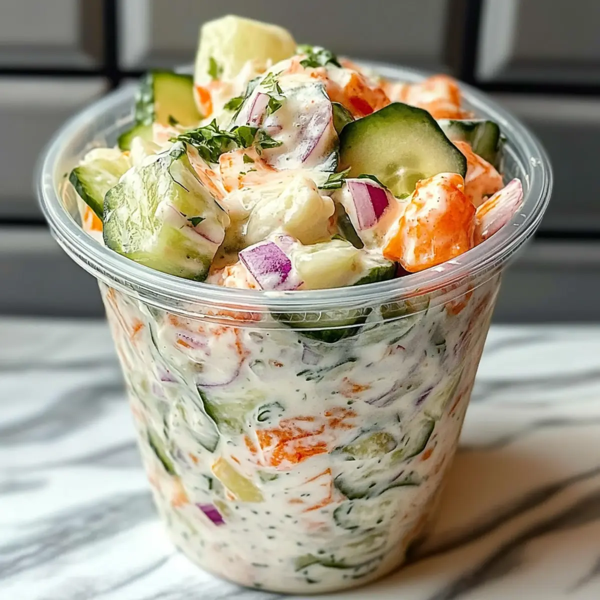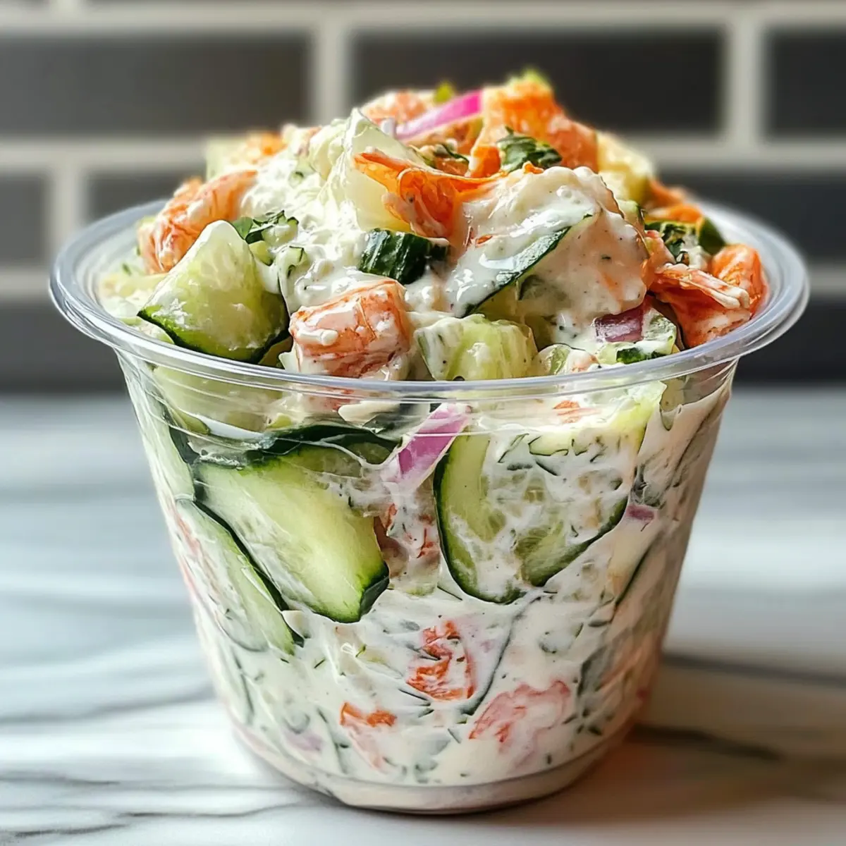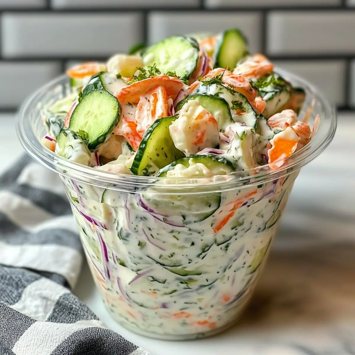 Jump to Recipe Print RecipeAs I stood in the kitchen, the bright colors of fresh ingredients caught my eye, sparking a sudden craving for something light and refreshing. That’s when this Sushi Cucumber Salad came to life, combining the delightful flavors of sushi into an easy, vibrant dish. Perfect for a quick lunch or as a satisfying side, this salad offers a healthy twist that’s gluten-free and customizable, making it suitable for every taste. With its creamy dressing and the crispness of cool cucumbers, it’s sure to please anyone looking to swap out fast food for a homemade gem. Curious about how to make this delicious salad and maybe even impress your friends at the next gathering? Let’s dive in! Why is This Salad a Must Try? Flavorful Fusion: This Sushi Cucumber Salad combines classic sushi flavors with a refreshing twist, making it a crave-worthy dish. Healthy Twist: Light and packed with nutritious ingredients, it’s perfect for anyone looking to ditch fast food. Customizable Delight: Tailor it to your taste with various mix-ins like smoked salmon or avocado, ensuring everyone at the table finds something they love. Quick and Easy: Whip it up in under 30 minutes—perfect for busy weeknights or last-minute gatherings! Crowd-Pleasing Appeal: Charming enough for dinner parties yet casual enough for lunch, it suits any occasion. For more cucumber goodness, check out my Cucumber Pasta Salad or a refreshing Cucumber Feta Salad! Sushi Cucumber Salad Ingredients • To craft this delightful dish, gather these fresh ingredients! For the Salad English Cucumber – The star of the show, offering crunch and vibrant freshness; slice uniformly for even bites. Onion – Adds a crisp sharpness; for a milder kick, opt for green onions instead. Optional Mix-Ins – Enhance flavors with protein choices like imitation crab, smoked salmon, shrimp, or tuna, tailored to your personal taste. For the Dressing Cream Cheese – A creamy base; soften it first for smooth blending. Alternative options like coconut cream cheese or Greek yogurt work well too. Mayonnaise – Adds richness; use light or reduced-fat mayo to keep it lighter. Soy Sauce – Provides umami depth; swap with gluten-free tamari if necessary. Rice Vinegar – Introduces a tangy flavor; feel free to replace it with apple cider vinegar if you’re out. Sesame Oil – Infuses a nutty depth; adjust the amount based on your dietary wishes. Enjoy your culinary journey with this Sushi Cucumber Salad, and let the fresh flavors transport you! Step‑by‑Step Instructions for Sushi Cucumber Salad Step 1: Prepare Cucumbers Begin by slicing the English cucumber into thin, even rounds for a uniform texture. Place the slices in a colander, sprinkle them lightly with salt, and let them “sweat” for about 10 minutes. This process draws out excess moisture, ensuring a crisp salad. After 10 minutes, pat the cucumber slices dry with a paper towel to remove any remaining salt and moisture. Step 2: Make Dressing In a medium mixing bowl, combine the softened cream cheese and mayonnaise. Using a whisk, blend these together until the mixture is smooth and fluffy, avoiding lumps for a velvety dressing. Gradually stir in the soy sauce, rice vinegar, and sesame oil, ensuring all ingredients are well incorporated. Set this creamy dressing aside for a moment while you prepare the other salad components. Step 3: Combine Ingredients In a large salad bowl, toss the salted cucumber slices with finely chopped onion. Drizzle in half of the creamy dressing, mixing gently to coat all the vegetables thoroughly. Let this mixture sit for about 5 minutes, allowing the flavors to meld and the cucumber to soak up the savory notes from the dressing. This step adds depth and enhances the overall taste of your Sushi Cucumber Salad. Step 4: Add Mix-Ins Gently fold in your choice of optional mix-ins such as imitation crab, smoked salmon, or diced avocado. Make sure to use a spatula and be careful not to break apart the cucumber or other vegetables. Add the remaining dressing to the salad, folding everything together until well combined. This addition will enhance both flavor and texture, creating a delightful medley that captures the essence of sushi. Step 5: Serve Chilled Transfer your assembled Sushi Cucumber Salad onto a serving platter. For an appealing finish, garnish with sesame seeds or crispy nori strips just before serving. This salad is best enjoyed chilled, so consider refrigerating it for a short while before serving. The vibrant colors and fresh ingredients make this dish not just tasty but visually stunning as well! Expert Tips for Sushi Cucumber Salad Crisp Cucumbers: Salt-sweating cucumbers enhances their crunchiness and prevents a watery salad; be sure to pat them dry afterward. Dress Right Before Serving: To maintain texture, add fragile toppings like seafood just before serving to avoid sogginess or browning. Velvety Dressing: Ensure your cream cheese is softened thoroughly for a smooth mixture and prevent lumps from forming in the dressing. Make It Vegan: Swap cream cheese for coconut cream cheese or Greek yogurt for a lighter, customizable option while keeping it delicious. Embrace Variations: Feel free to mix in diced avocado or marinated mushrooms based on your dietary needs—flexibility is the key to this Sushi Cucumber Salad! What to Serve with Sushi Cucumber Salad? The perfect meal isn’t complete without the right accompaniments to elevate your dining experience. Grilled Salmon: Juicy, smoky salmon perfectly pairs with the fresh crunch of the salad, enhancing its sushi flavors beautifully. The richness of the fish complements the creamy dressing, creating a harmonious balance for your palate. Avocado Sushi Rolls: Soft and creamy avocado rolls match well with the salad’s texture and flavors, creating a delightful sushi feast. This combination invites surprises with every bite, making it a fun and soothing meal. Seaweed Salad: The umami flavor 