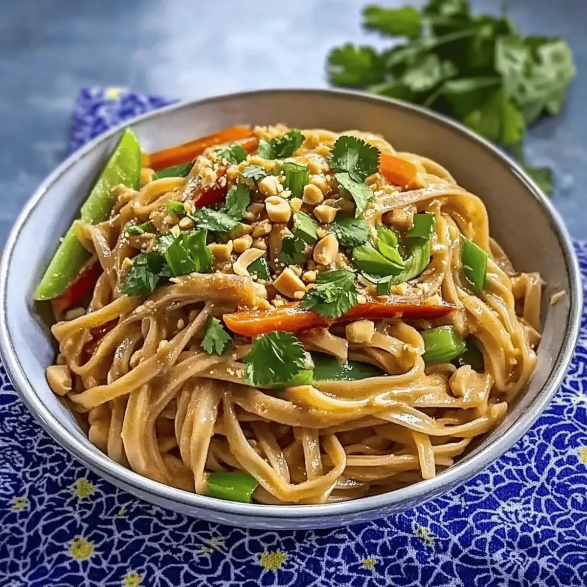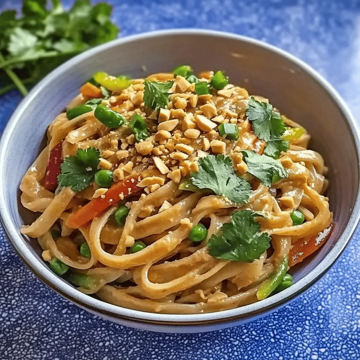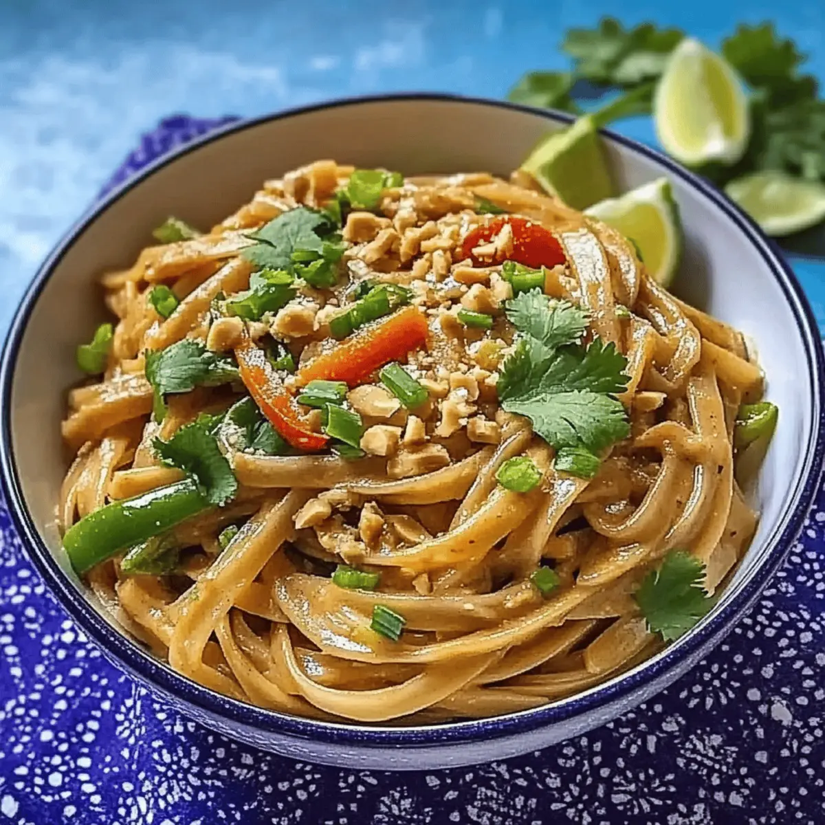 Jump to Recipe Print RecipeThe aroma of sizzling garlic and ginger instantly transported me to a lively street market in Thailand, where bowls of vibrant noodles beckoned from every corner. That’s the magic of Quick and Creamy Thai Peanut Noodles! In just 25 minutes, you can whip up this delightful dish that’s as versatile as your culinary creativity allows. Whether you’re a busy parent or just looking to shake up dinner with an exotic flair, this recipe delivers comfort in every bite. It easily caters to everyone at the table, making it a vegetarian-friendly option that can also be customized with proteins of your choice. So, who’s ready to dive into this creamy, savory adventure with me? Why are Thai Peanut Noodles irresistible? Quick and Easy: You’ll love how this recipe comes together in just 25 minutes, making it perfect for busy weeknights. Flavor Explosion: The rich, creamy peanut sauce melds beautifully with the crunch of fresh veggies, creating a satisfying balance that’s hard to resist. Customizable Delight: Whether you prefer tofu, chicken, or shrimp, you can easily mix and match proteins to suit your taste. Family Favorite: Kids and adults alike will enjoy this dish, making it a surefire hit for any gathering. Pair it with a side of Thai Basil Beef for an unforgettable meal! Nutritious Option: Each serving boasts a nutritious blend of flavors and textures, providing a well-rounded meal that’s filling and satisfying. Thai Peanut Noodles Ingredients For the Noodles • Rice Noodles – The chewy base of the dish; spaghetti or linguine can be used in a pinch. For the Sauce • Creamy Peanut Butter – The star ingredient, providing richness and a nutty flavor; smooth peanut butter is preferred for creaminess. • Soy Sauce – Adds savory depth to the sauce; consider low-sodium soy sauce for a healthier option. • Honey – Sweetens the sauce to balance savory elements; maple syrup can be a vegan substitute. • Rice Vinegar – Brings tanginess to the sauce; apple cider vinegar works as an alternative. • Sesame Oil – Imparts a nutty flavor; toasted sesame oil can enhance this taste even further. • Garlic – Freshly minced adds warmth and aroma; adjust the amount to taste or use roasted garlic for a milder flavor. • Fresh Ginger – Provides warmth and spice; you can use ground ginger in smaller amounts as a substitute. • Red Pepper Flakes – Offers customizable heat; feel free to mix in Sriracha for extra kick. For the Veggies • Shredded Carrots – Adds a crunchy texture and vibrant color that complements the noodles. • Sliced Bell Peppers – Provide additional nutrition; any color works, and you can add extra veggies as desired. • Chopped Green Onions – For garnish, lending a fresh flavor to finish your dish. • Cilantro – Optional, adds freshness; omit if you’re not a fan. • Lime Wedges – Serve fresh for a zesty finish that brightens the dish. With these accessible Thai Peanut Noodles ingredients, you’re well on your way to a meal that everyone will love! Step‑by‑Step Instructions for Thai Peanut Noodles Step 1: Cook the Noodles Bring a large pot of water to a rolling boil over high heat. Add the rice noodles and cook according to package instructions, usually about 6-8 minutes, until al dente. Stir occasionally to prevent sticking. Once cooked, drain the noodles in a colander and rinse them under cold water to stop the cooking process and keep them from clumping together. Step 2: Prepare the Peanut Sauce In a medium mixing bowl, whisk together 1/2 cup creamy peanut butter, 3 tablespoons soy sauce, 2 tablespoons honey, 1 tablespoon rice vinegar, and 1 tablespoon sesame oil. Add 2 cloves of minced garlic, 1 tablespoon grated fresh ginger, and a pinch of red pepper flakes. Mix until the sauce is smooth and well-combined, adding warm water gradually if you prefer a thinner consistency. Step 3: Combine the Noodles and Veggies In a large mixing bowl, combine the cooked rice noodles, 1 cup of shredded carrots, and 1 cup of sliced bell peppers. Pour the prepared peanut sauce over the noodle and vegetable mixture. Using tongs, gently toss everything together until the noodles are evenly coated with the rich Thai peanut sauce and the vegetables are well-distributed throughout. Step 4: Garnish and Serve Portion the Thai Peanut Noodles into serving bowls and top with freshly chopped green onions and cilantro for an extra burst of flavor. Squeeze fresh lime juice over the dish just before serving to add a zesty finish. Enjoy your homemade meal with family and friends, or save it for a delicious lunch the next day! Step 5: Optional Chilling For a refreshing cold version of these Thai Peanut Noodles, cover the bowls and chill in the refrigerator for about 30 minutes. This allows the flavors to meld beautifully and provides a perfect dish for hot days or meal prep. Whether warm or chilled, this dish is sure to satisfy! How to Store and Freeze Thai Peanut Noodles Fridge: Store leftover Thai Peanut Noodles in an airtight container for up to 3 days. A splash of water can help rehydrate noodles when reheating. Freezer: For longer storage, freeze the noodles without sauce in a freezer-safe container for up to 2 months. Thaw in the fridge overnight before reheating. Airtight Tips: Ensure the noodles are completely cool before sealing them in an airtight container to prevent moisture buildup, which can affect texture. Reheating: When ready to enjoy again, reheat in a skillet with a bit of sesame oil over medium heat, adding a splash of water to avoid sticking. Expert Tips for Thai Peanut Noodles Perfect Noodles: Ensure you don’t overcook rice noodles; al dente consistency adds the right chewiness, balancing beautifully with the creamy sauce. Smooth Sauce: Use smooth peanut butter for a velvety texture; if your sauce is too thick, thin it with warm water until desired consistency is reached. Veggie Variety: Feel free to mix in different veggies 