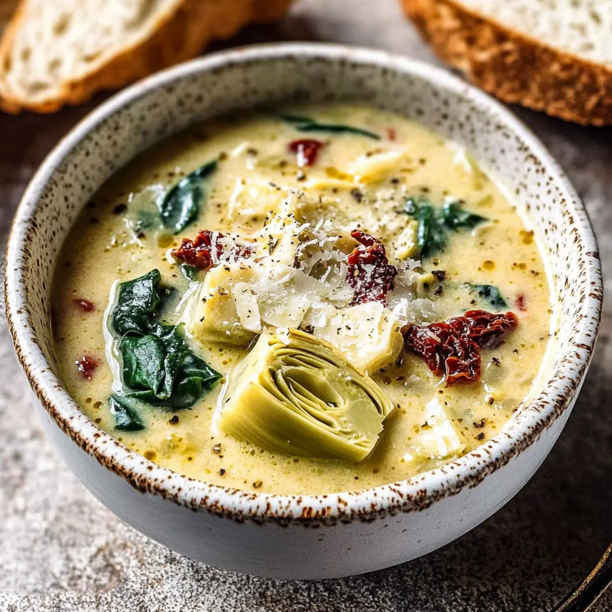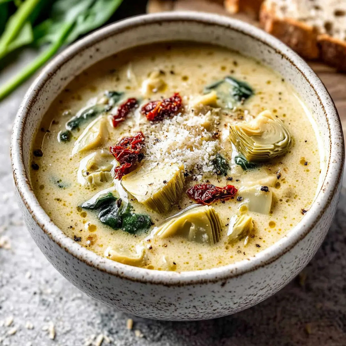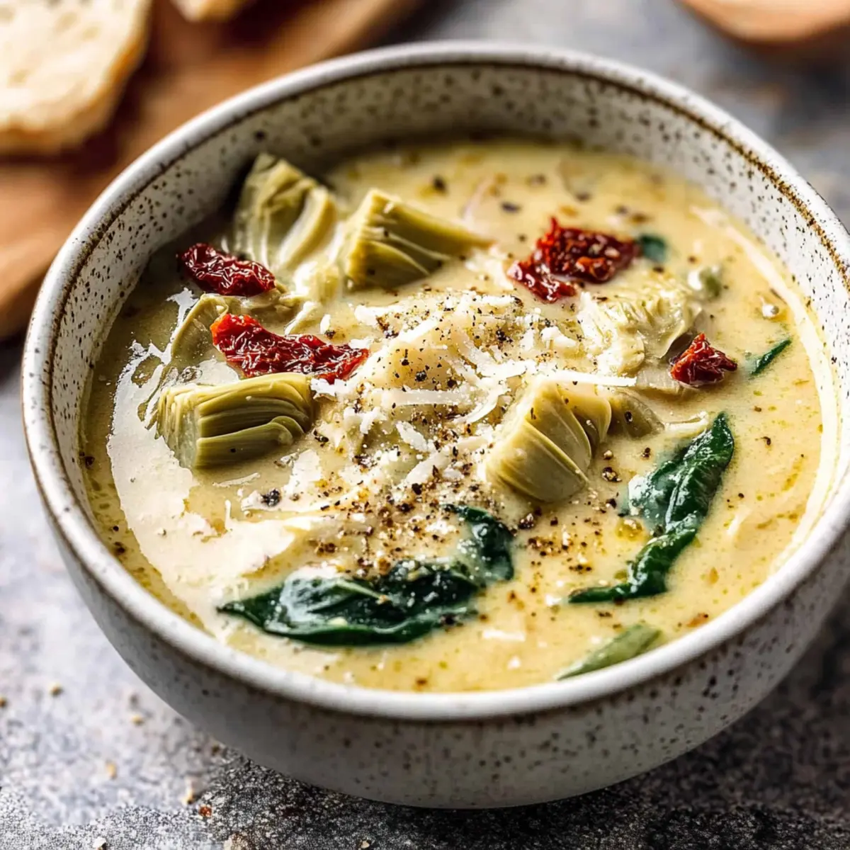 Jump to Recipe Print RecipeAs I poured the first spoonful of this creamy Tuscan Artichoke Soup, I was immediately transported to the sun-drenched hills of Italy, where flavors dance in harmony. This soup perfectly embodies the essence of traditional Italian comfort food, showcasing the earthy artichoke alongside the vibrant brightness of sun-dried tomatoes. Not only is it incredibly satisfying for a cozy family dinner, but it’s also a show-stopper for entertaining friends. With quick prep and the option to make it dairy-free, this recipe is as flexible as it is delectable. Ready to stir up a bowl of warmth that will embrace your senses? Let’s dive into this delightful culinary journey together! Why is this soup so comforting? Creamy texture: This Tuscan Artichoke Soup greets you with a soothing, velvety mouthfeel that wraps you in warmth. Rich flavors: Each spoonful bursts with the earthy notes of artichokes and tangy sun-dried tomatoes, creating a symphony of taste that feels like a hug on a chilly day. Quick and easy: With simple ingredients and straightforward steps, you’ll have this comforting dish ready in no time—perfect for busy weeknights or impromptu gatherings. Versatile options: Want a dairy-free version? Just swap in coconut milk! Plus, feel free to experiment with Tuscan Sausage Pasta for complementary flavors. Crowd-pleaser: Whether it’s family dinner or a dinner party, it’s a recipe that’s sure to impress. Nutrient-rich: With fresh spinach and hearty artichokes, you’ll enjoy not just comfort, but a nutritious boost in every bowl! Tuscan Artichoke Soup Ingredients For the Soup Base • Extra virgin olive oil – A high-quality oil is essential for the best flavor. • Celery (3 stalks, finely diced) – Adds aromatic depth and texture to the soup. • Yellow onion (1 medium, chopped) – Provides a sweet flavor base that enriches the taste. • Garlic (4 cloves, minced) – Delivers a robust, aromatic quality that enhances the profile. • Red pepper flakes (pinch) – Introduces a subtle heat that wakes up your taste buds. • Canned artichoke hearts (14-ounce can, drained and chopped) – The star of the dish, offering nutty undertones; consider fresh hearts when available. • Marinated sun-dried tomatoes (½ cup, sliced thin) – Brings a tangy depth that complements the artichokes. • Chicken stock or broth (4 cups) – This liquid base intensifies flavor; swap for vegetable broth to make a vegetarian option. • Lemon juice (1 tablespoon) – Brightens flavors; adjust to your preference. • Salt and freshly cracked black pepper – Essential for seasoning to taste. For the Creamy Finish • Fresh spinach (1 cup, packed) – Adds color and nutrients; wilt towards the end of cooking. • Heavy cream (1 cup) – Creates a luscious richness; use coconut milk for a dairy-free version. • Asiago or Parmesan cheese (½ cup, grated, divided) – Infuses a nutty, savory flavor; reserve some for garnishing. Get ready to indulge in a bowl of this warm and inviting Tuscan Artichoke Soup, where every ingredient plays a part in crafting a truly satisfying experience! Step‑by‑Step Instructions for Tuscan Artichoke Soup Step 1: Heat the Base In a large pot, drizzle 2 tablespoons of extra virgin olive oil and heat it over medium heat. Once the oil shimmers, add finely diced celery and chopped yellow onion. Sauté for 5-6 minutes until they soften and become translucent, filling your kitchen with their wonderful aroma, then stir in minced garlic and a pinch of red pepper flakes, cooking for an additional minute until fragrant. Step 2: Add Key Ingredients Stir in the chopped canned artichoke hearts and marinated sun-dried tomatoes, letting them sauté together for about 2-3 minutes. This enhances their flavors, making them a delicious base for your creamy Tuscan Artichoke Soup. You’ll notice a lovely mingling of aromas as they warm up and begin to caramelize slightly. Step 3: Create the Broth Pour in 4 cups of chicken stock and add 1 tablespoon of lemon juice, stirring to combine. Increase the heat slightly to bring the mixture to a gentle boil. Once boiling, reduce to a simmer, allowing the soup to cook for about 10 minutes. This simmering process allows all the flavors to meld beautifully while the broth takes on a rich, inviting hue. Step 4: Season and Creamify After 10 minutes, season your soup with salt and freshly cracked black pepper to taste. Gently stir in 1 cup of heavy cream, continuing to heat for another 2-3 minutes until everything is warmed through. When adding the cream, keep the heat moderate to ensure it blends smoothly without curdling. Step 5: Wilt the Spinach Finally, add packed fresh spinach into the pot, cooking for just about 1 minute until the leaves are wilted and vibrant. As you stir, the spinach will beautifully integrate into the creamy soup, adding not only color but also a nutritious touch, completing your Tuscan Artichoke Soup. Step 6: Finish with Cheese Stir in half of the grated Asiago or Parmesan cheese, letting it melt into the soup for an extra layer of flavor. Reserve the remaining cheese for garnish. This final touch adds a delightful richness to your soup, making each spoonful a truly indulgent experience. Serve immediately, allowing everyone to enjoy this comforting bowl of Tuscan goodness! Tuscan Artichoke Soup Variations Feel free to get creative with this Tuscan Artichoke Soup, enabling you to personalize it to suit your family’s taste or dietary needs. Dairy-Free: Use coconut milk instead of heavy cream for a rich, creamy texture without dairy. Your soup will still feel indulgent, wrapping you in warmth without any hassle. Vegetarian Base: Swap chicken stock for vegetable broth to create a delightful vegetarian-friendly version. This change ensures every spoonful is packed with flavor and compassion. Mushroom Twist: Replace artichokes with quartered mushrooms for a unique earthy flavor. The umami from mushrooms enha