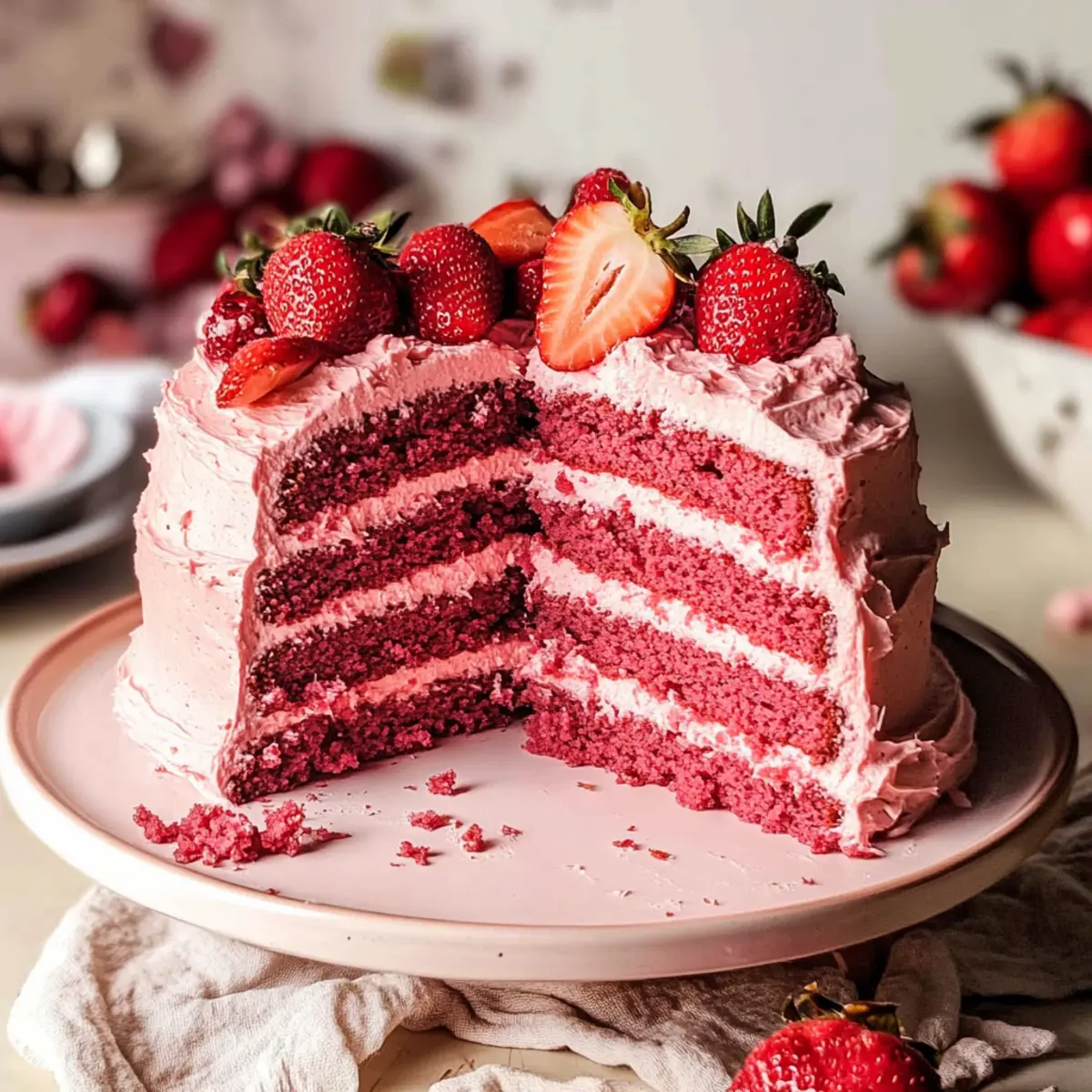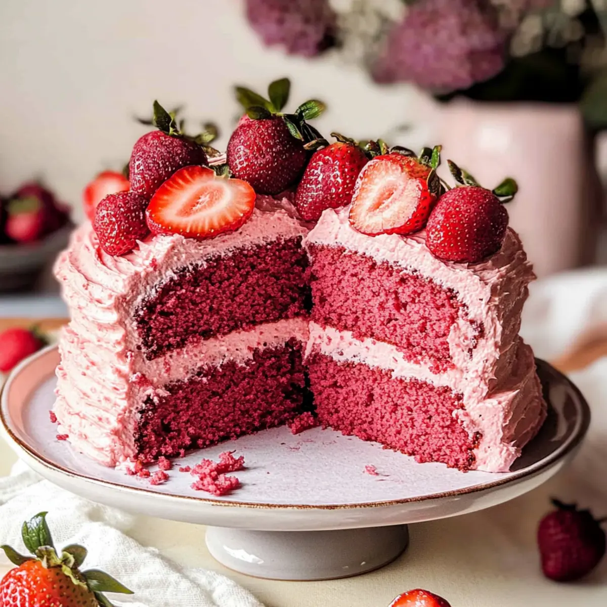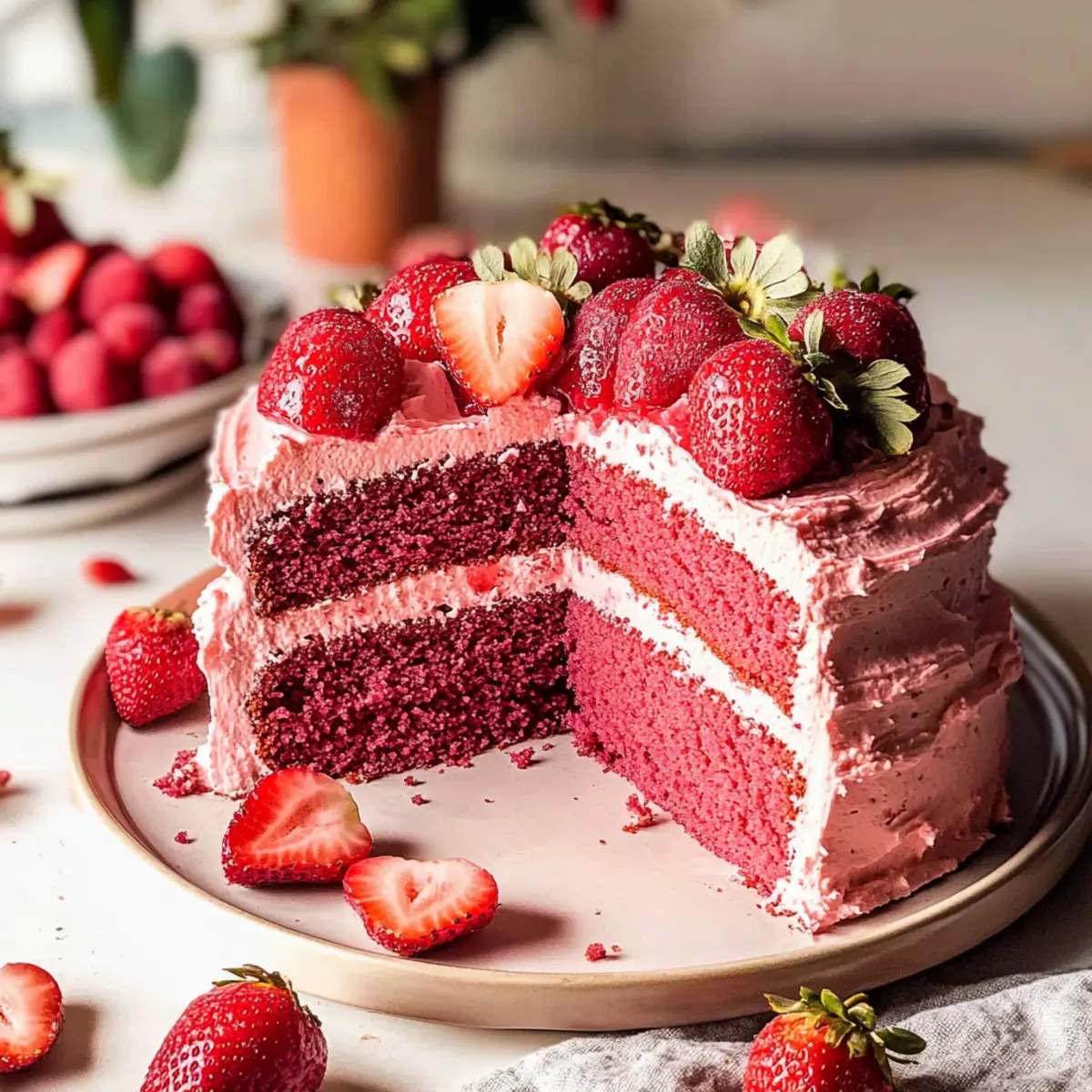 Jump to Recipe Print RecipeAs I lifted the lid off the mixing bowl, the sweet aroma of fresh strawberries wafted through my kitchen, instantly transporting me to sun-kissed summer days. This Fluffy Vegan Strawberry Cake brings together the simplicity of wholesome ingredients and the vibrant joy of fresh fruit, making it a delightful centerpiece for any gathering—from elegant birthdays to cozy family dinners. It’s not just a cake; it’s a testament to how effortlessly delicious vegan baking can be. With incredibly quick prep time and the ability to stay fresh for days, this cake invites everyone to indulge without the worry of refined sugars or artificial ingredients. Ready to create a masterpiece that will leave your loved ones craving more? Let’s dive into this mouthwatering recipe! Why is this Vegan Strawberry Cake a must-try? Irresistible Flavor: This cake bursts with fresh strawberry goodness, making each bite a delightful treat. Quick to Make: Minimal prep time means you can whip it up in no time, perfect for those busy days! Versatile Options: Feeling adventurous? Try it with a vegan strawberry frosting or even adapt it for gluten-free diets! Crowd-Pleaser: It’s bound to impress everyone at the table, whether they’re vegan or not! Light and Airy: The fluffy texture is remarkably satisfying, reminiscent of traditional cakes without the guilt. Try pairing this cake with some luscious Vegan Chocolate Chip cookies or treat yourself to a slice of Churro Cheesecake Indulge for an equally delicious dessert experience! Vegan Strawberry Cake Ingredients Get ready to create a fluffy masterpiece! For the Cake Strawberry Puree – ~4 cups (480g) fresh or frozen strawberries, weighed without stems; this adds moisture and flavor, enhancing the cake’s strawberry essence. All-Purpose Plain Flour – 3 cups (375g); provides structure—you can swap it for gluten-free flour for a delightful gluten-free Vegan Strawberry Cake. Granulated Sugar – 1 cup (200g); adds sweetness—consider coconut sugar for a unique flavor, though it may affect the cake’s color. Baking Powder – 1 tablespoon; acts as a leavening agent so your cake rises beautifully alongside baking soda. Baking Soda – 1 teaspoon; works in tandem with baking powder to ensure the light texture of the cake. Salt – Pinch; enhances flavor and balances the sweetness of the cake. Dairy-free Milk – ⅓ cup (85g); provides moisture—thanks to the strawberry puree, you might reduce overall liquid requirements. Neutral Flavored Oil – ½ cup (125g); keeps the cake moist and fluffy, helping it avoid dryness. Apple Cider Vinegar or Lemon Juice – 1 tablespoon; adds acidity to activate the baking soda, but feel free to substitute with vinegar. Liquid Pink Food Color – 1 teaspoon (optional); enhances visual appeal—if you’d prefer a natural alternative, beetroot powder can give different hues. Vanilla Extract – 1 teaspoon (optional); adds depth of flavor, though you can omit it for a pure strawberries experience. For Decorating Fresh Strawberries – Used as a decoration to crown your cake, giving it a pop of color and freshness. Vegan Frosting – Optional frosting, which can add creaminess and an extra layer of flavor. Gather these vibrant ingredients, and let’s make a cake that not only pleases the palate but also brings joy and love to your dining table! Step-By-Step Instructions for Vegan Strawberry Cake Step 1: Prepare Strawberry Puree Begin by cleaning your fresh strawberries, ensuring they’re free of stems and dirt. Place approximately 4 cups of strawberries into a blender, and blend until smooth. This vibrant puree will not only enhance the flavor of your Vegan Strawberry Cake but also provide moisture. Set the puree aside while you move on to preparing the cake. Step 2: Preheat the Oven Preheat your oven to 180°C (350°F) to create the ideal baking environment for your Vegan Strawberry Cake. While the oven heats up, take two 8-inch round cake pans and grease or line them with parchment paper. This prevents the cake from sticking, allowing for easy removal once baked. Step 3: Combine Dry Ingredients In a large mixing bowl, combine the all-purpose flour, granulated sugar, baking powder, baking soda, and a pinch of salt. Use a whisk to mix these dry ingredients thoroughly until there are no lumps visible. This ensures an even rise and texture in your cake. Creating this dry blend is a key step in achieving a delightful Vegan Strawberry Cake. Step 4: Mix Wet Ingredients Now, it’s time to bring your batter to life! Add the prepared strawberry puree along with the dairy-free milk, neutral oil, apple cider vinegar, and optional vanilla extract to the bowl with dry ingredients. Using a spatula, gently fold the mixture together until just combined. Be careful not to overmix; a few small lumps are perfectly okay to ensure your cake remains airy and fluffy. Step 5: Pour and Bake Evenly divide the cake batter between the two prepared pans. Smooth the tops with a spatula for even baking. Place the pans in your preheated oven and bake for approximately 25-30 minutes. Keep an eye on the cakes; they’re ready when a toothpick inserted into the center comes out clean, signaling a perfectly baked Vegan Strawberry Cake. Step 6: Cool the Cakes Once the baking time is complete, remove the pans from the oven and allow them to cool for about 10 minutes on a wire rack. This resting period helps release the cakes from the pans. After 10 minutes, carefully turn out the cakes onto the wire rack to cool completely. Proper cooling is essential for a sturdier structure when assembling the cake. Step 7: Assemble the Cake As the cooled cakes await assembly, trim any domed tops for even layering. Place one layer on your serving plate, and spread a generous layer of your desired vegan frosting on top. Gently place the second layer on top and frost the sides if desired. This delicious Vegan Strawberry Cake is now ready for decoration! St